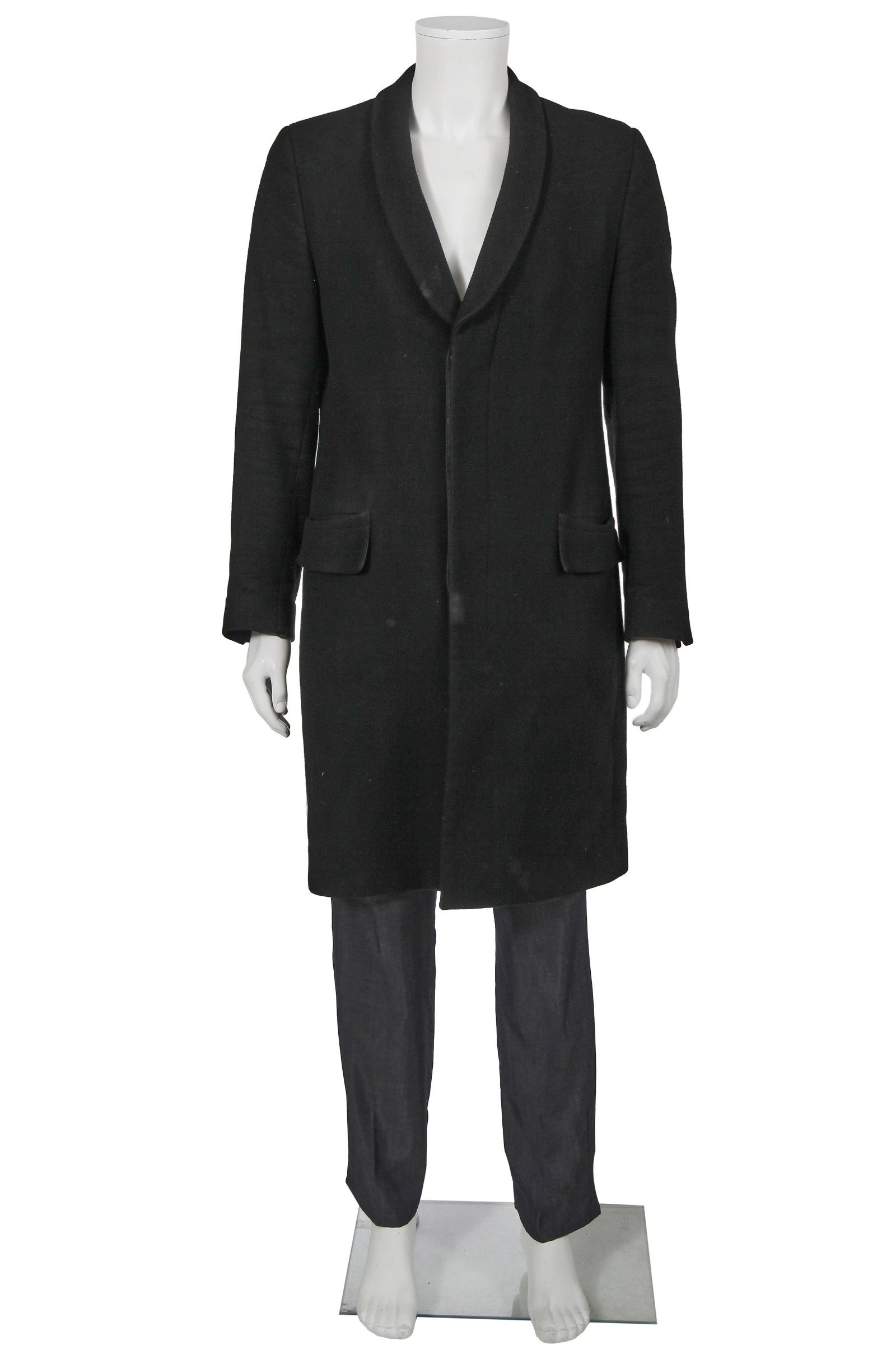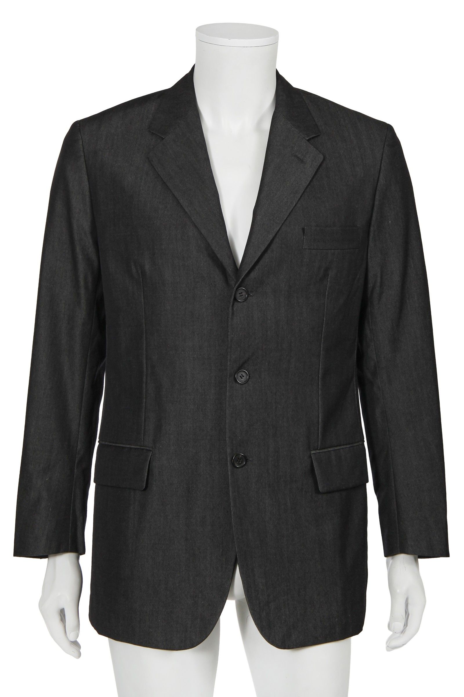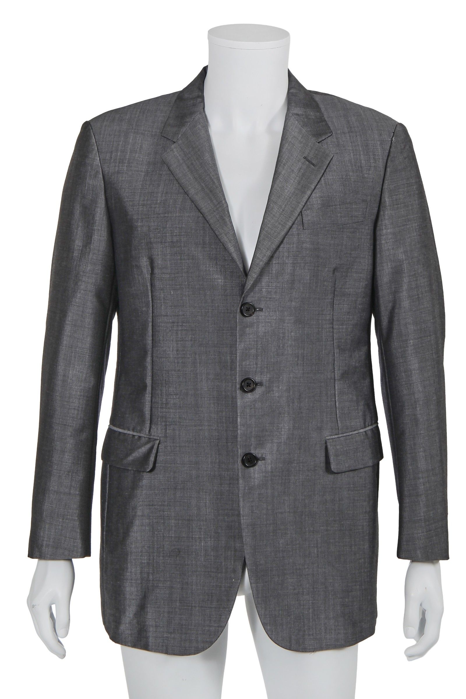 Guardando poi al resto della selezione, tutta relativamente minimalistica, vediamo tre pezzi di Margiela: un trench di camoscio marrone, un cappotto di lana nero della FW09 e pantaloni grigi della FW10. Seguono due blazer e un completo di Prada, acquistati tra la fine degli anni ’90 e il 2006, un completo di Hermès, uno di Ralph Lauren e uno stupendo blazer di seta beige di Helmut Lang che, qui forse fantastichiamo noi, ricorda molto da vicino quello indossato da George Forsyth al matrimonio con il designer nel 2001.