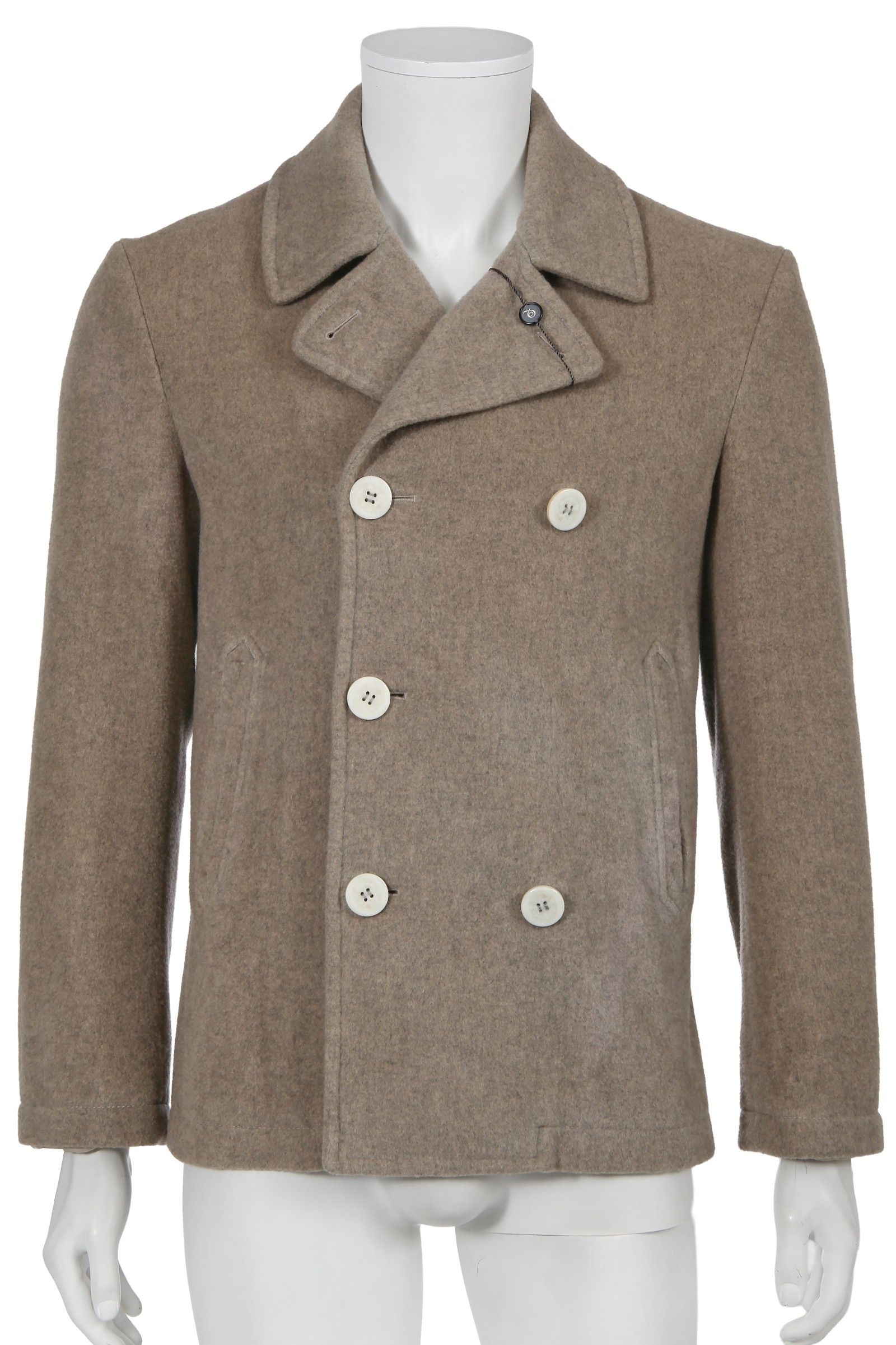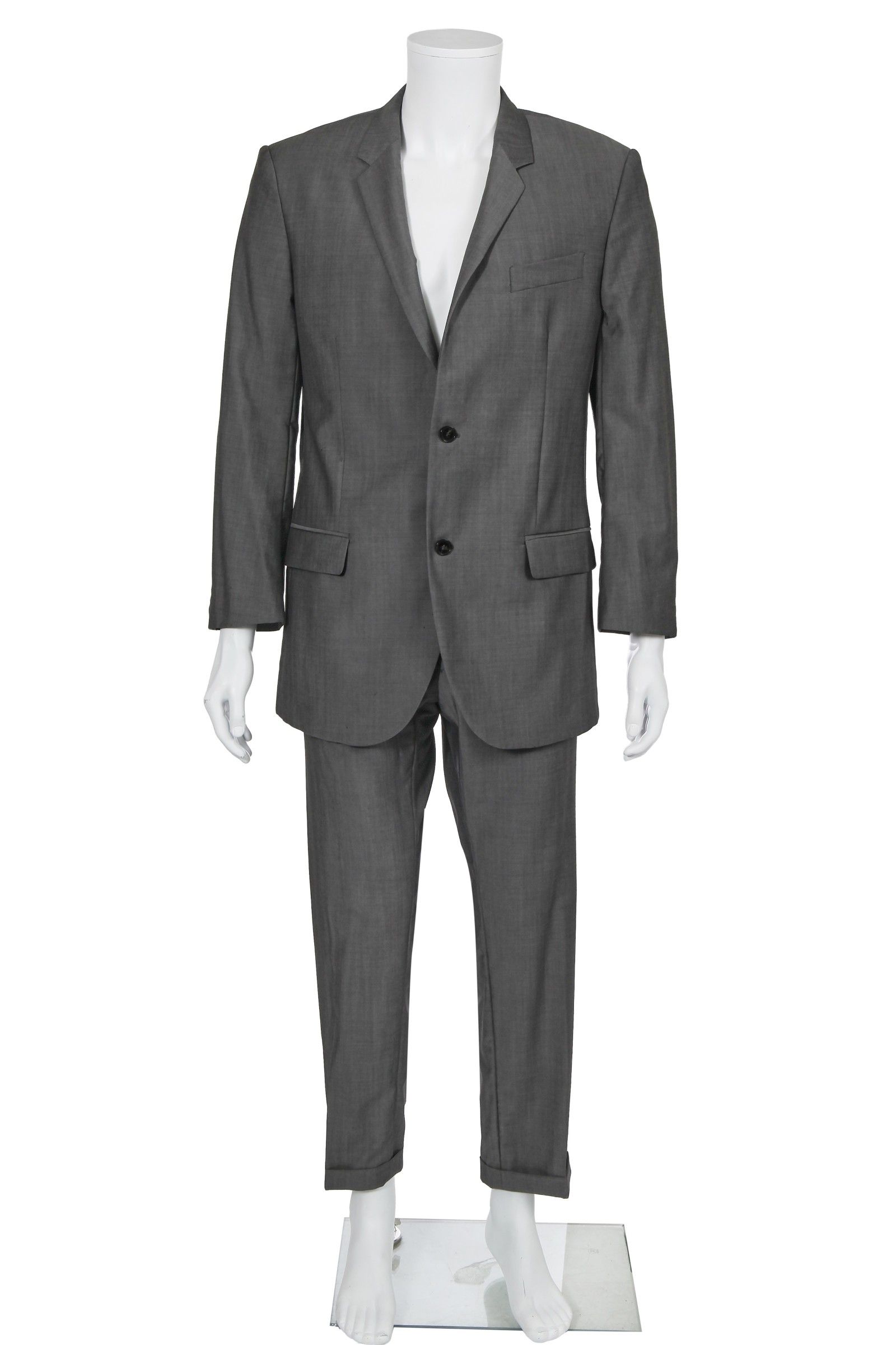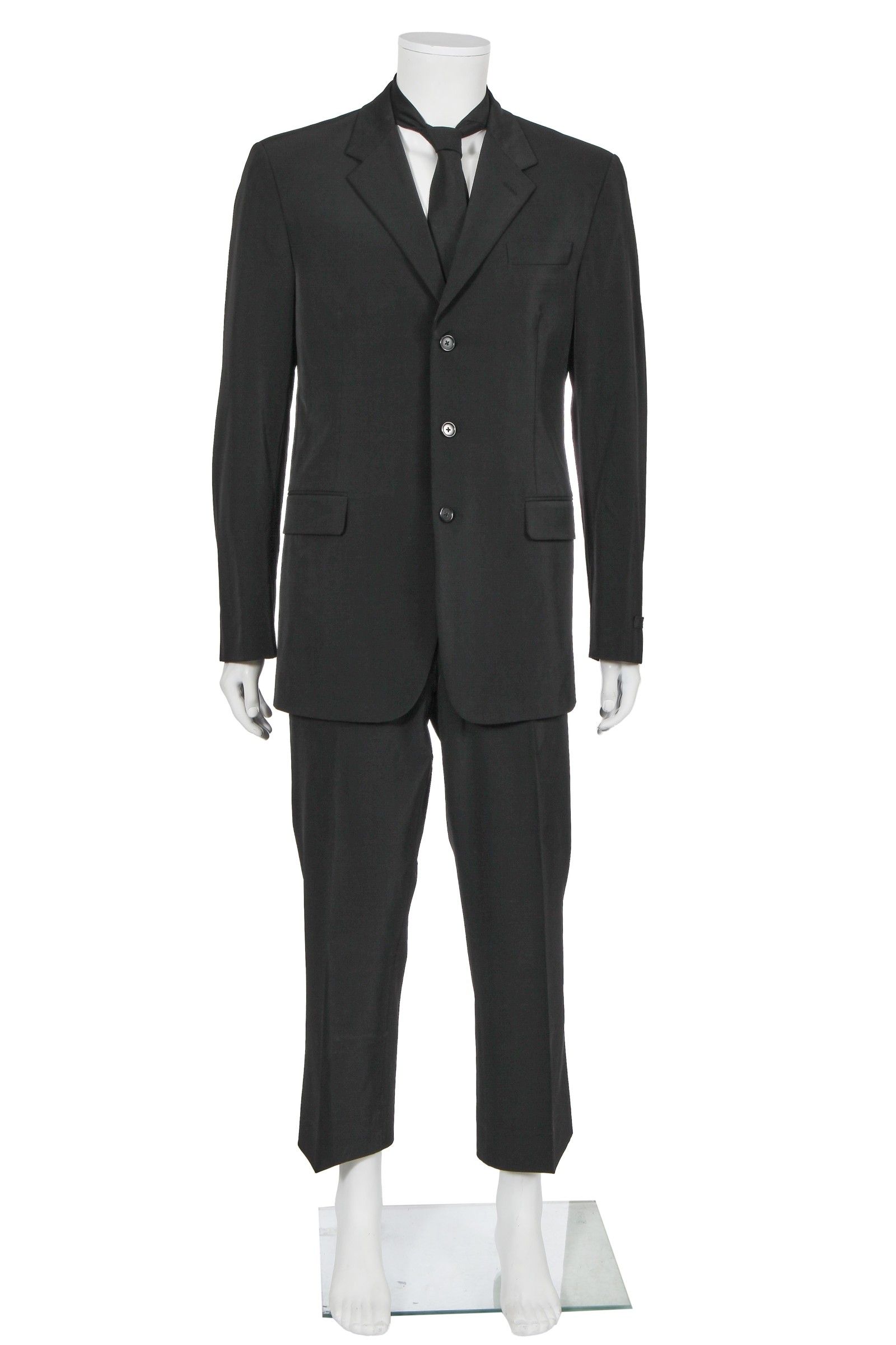 Guardando poi al resto della selezione, tutta relativamente minimalistica, vediamo tre pezzi di Margiela: un trench di camoscio marrone, un cappotto di lana nero della FW09 e pantaloni grigi della FW10. Seguono due blazer e un completo di Prada, acquistati tra la fine degli anni ’90 e il 2006, un completo di Hermès, uno di Ralph Lauren e uno stupendo blazer di seta beige di Helmut Lang che, qui forse fantastichiamo noi, ricorda molto da vicino quello indossato da George Forsyth al matrimonio con il designer nel 2001.