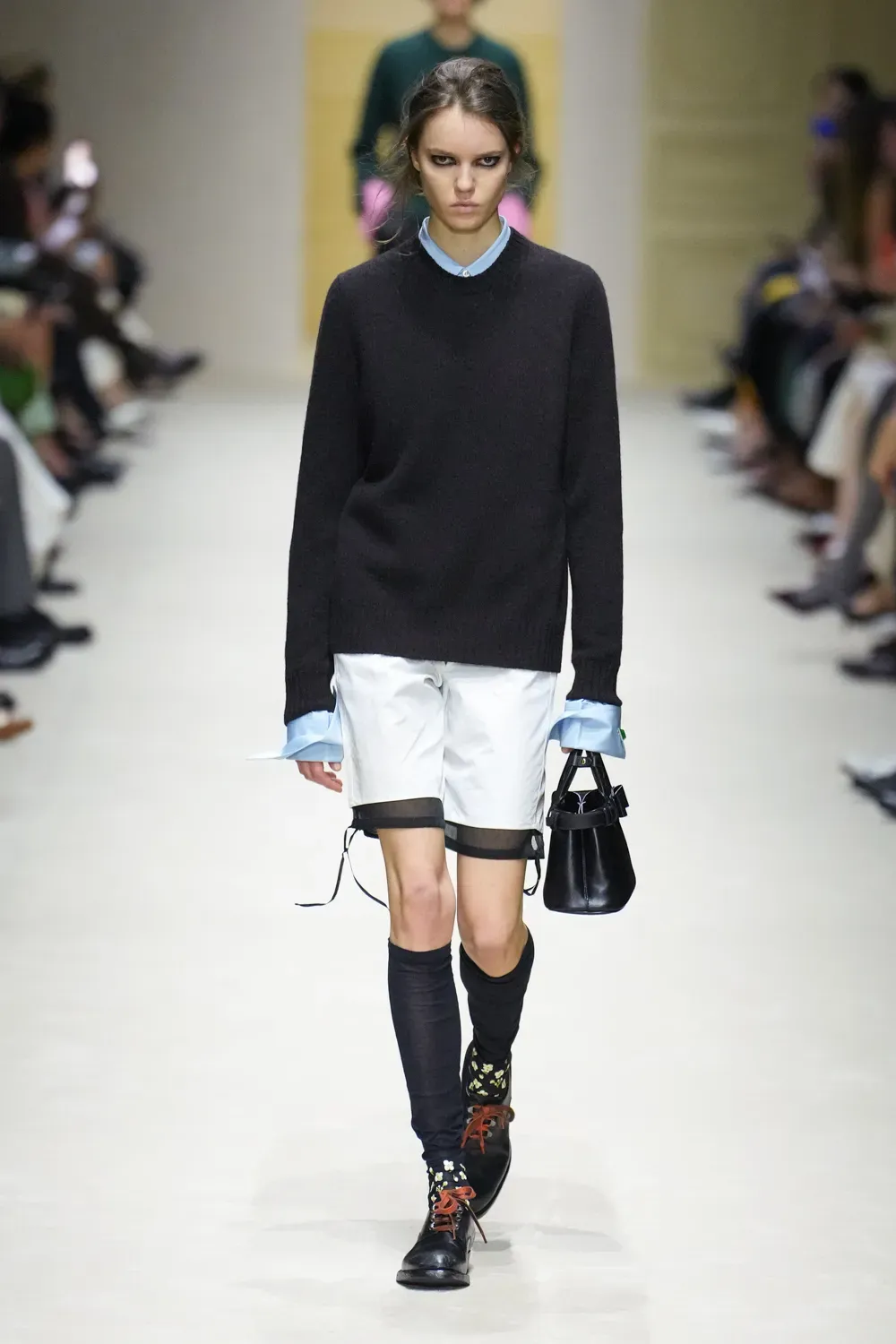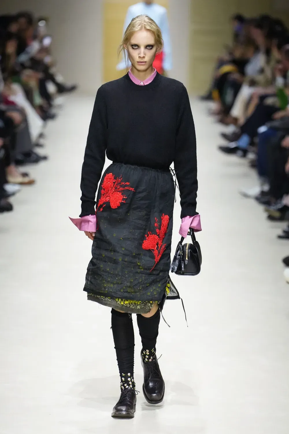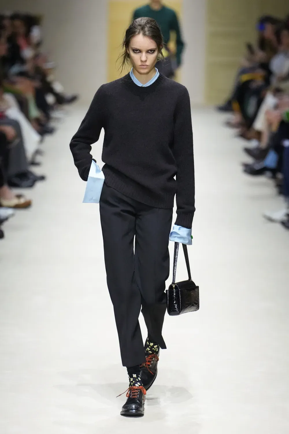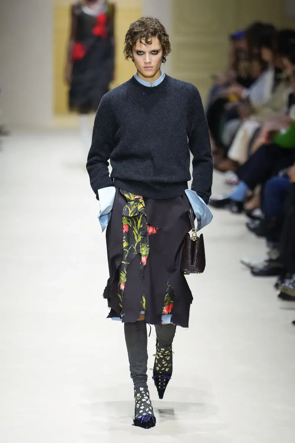 Sempre di più, stagione dopo stagione, Prada sembra tornare a riflettere non tanto sul passato ma sul rapporto che noi abbiamo con esso, sull’influenza che ha su di noi la percezione di un passato sempre più ineludibile e, per certi versi, discorde e frammentario. Aggettivi che potremmo usare anche per la nostra cultura e coscienza collettiva oltre che per le nostre identità personali, sempre più scollate dal tessuto connettivo che un tempo era la vita sociale e comunitaria.