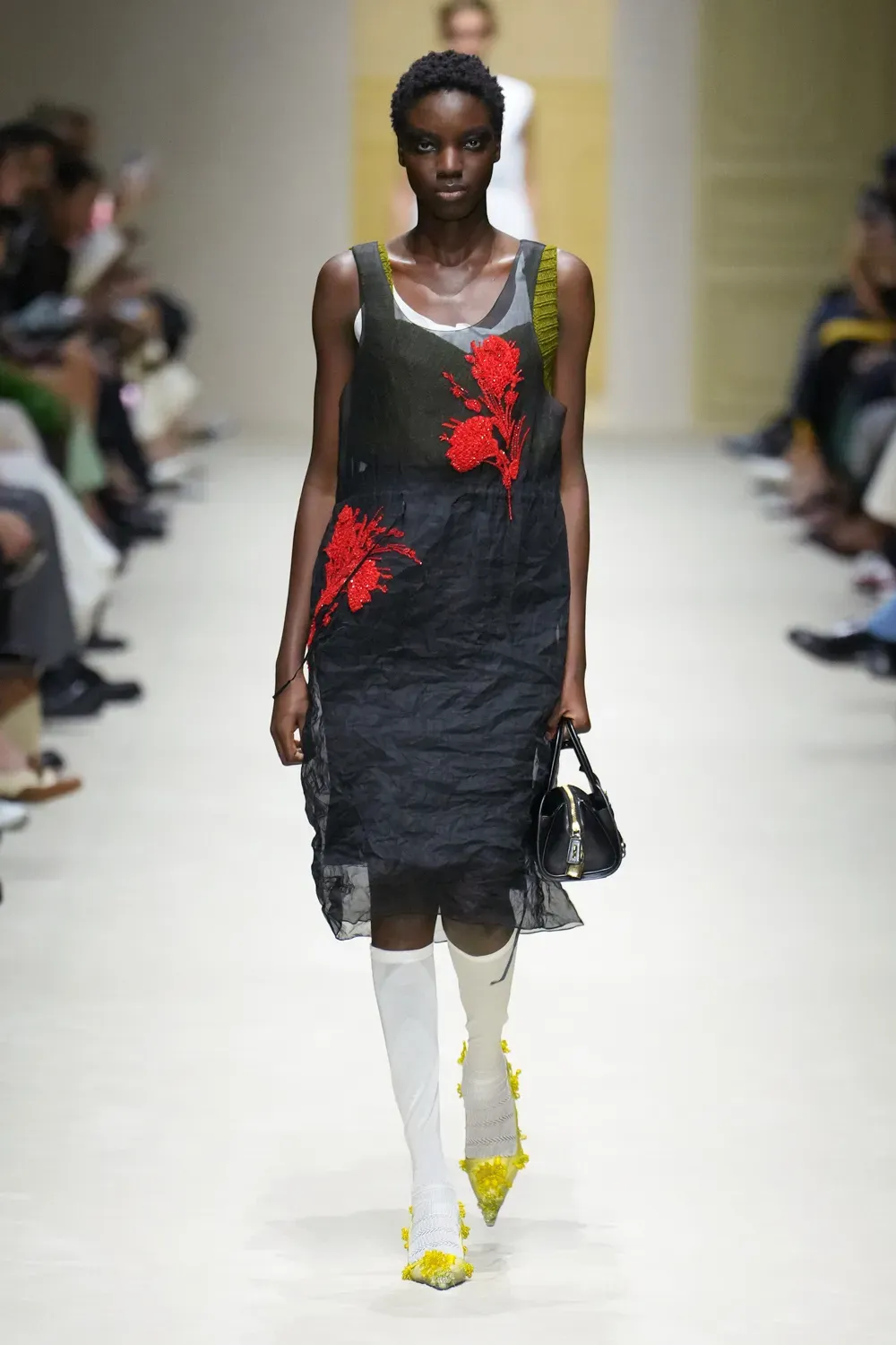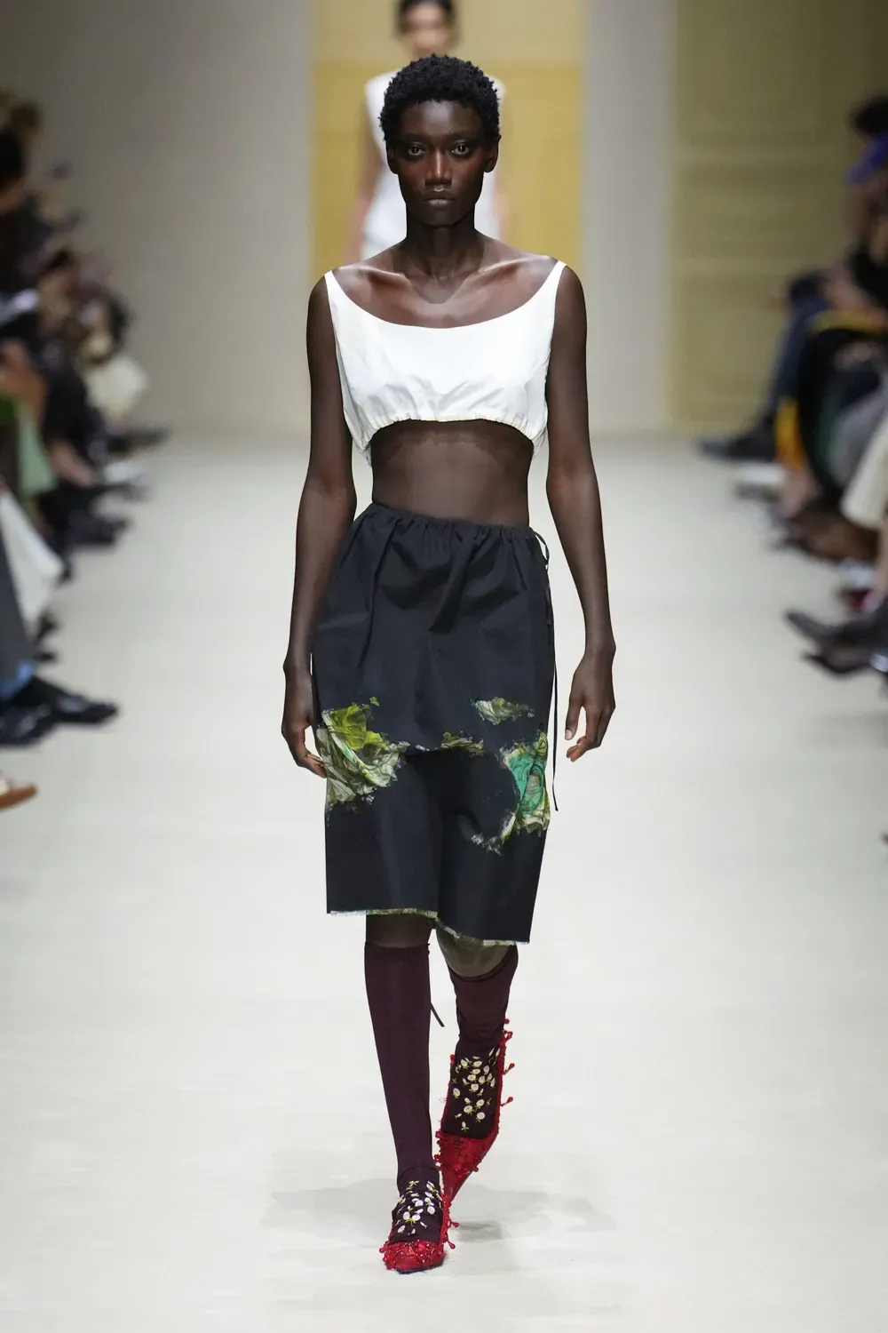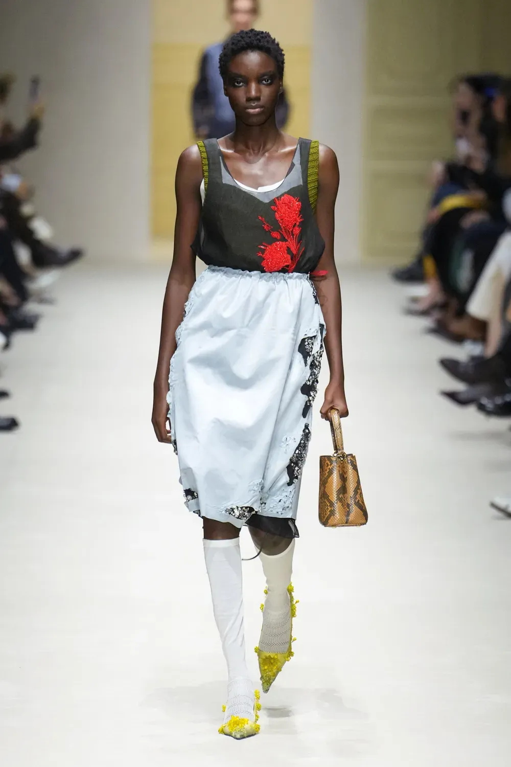 Sempre di più, stagione dopo stagione, Prada sembra tornare a riflettere non tanto sul passato ma sul rapporto che noi abbiamo con esso, sull’influenza che ha su di noi la percezione di un passato sempre più ineludibile e, per certi versi, discorde e frammentario. Aggettivi che potremmo usare anche per la nostra cultura e coscienza collettiva oltre che per le nostre identità personali, sempre più scollate dal tessuto connettivo che un tempo era la vita sociale e comunitaria.