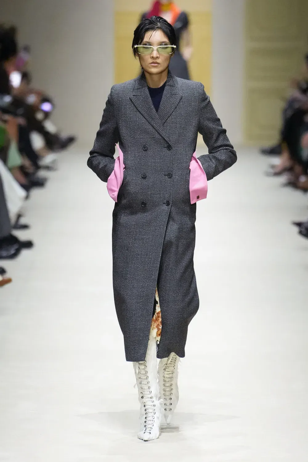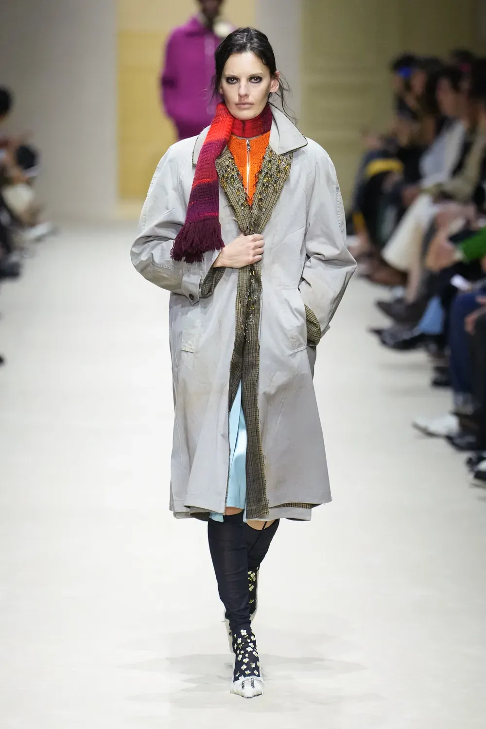 Parlavamo prima di un certo senso del crepuscolare perché, come esplicitano già le show notes e come riconferma di ciò che avevamo visto nella collezione maschile precedente, un altro elemento tematico presente nella collezione era il passare del tempo, letto però in chiave di usura, logoramento, consunzione fisica. Le giacche dagli orli “mangiati” che rivelavano altri strati di tessuto sotto, i maglioni e gli orli quasi sdruciti, le scoloriture, gli strappi, gli stropicciamenti e persino il set e il look torvo delle quindici, scarmigliate modelle sembravano tutti parlare di un mondo in sfacelo, quasi di un romantico amore della rovina che ricorda la famosa collezione Virginia Creeper di Simons. Un sentimento che è facile comprendere scorrendo le ultime notizie dal mondo.