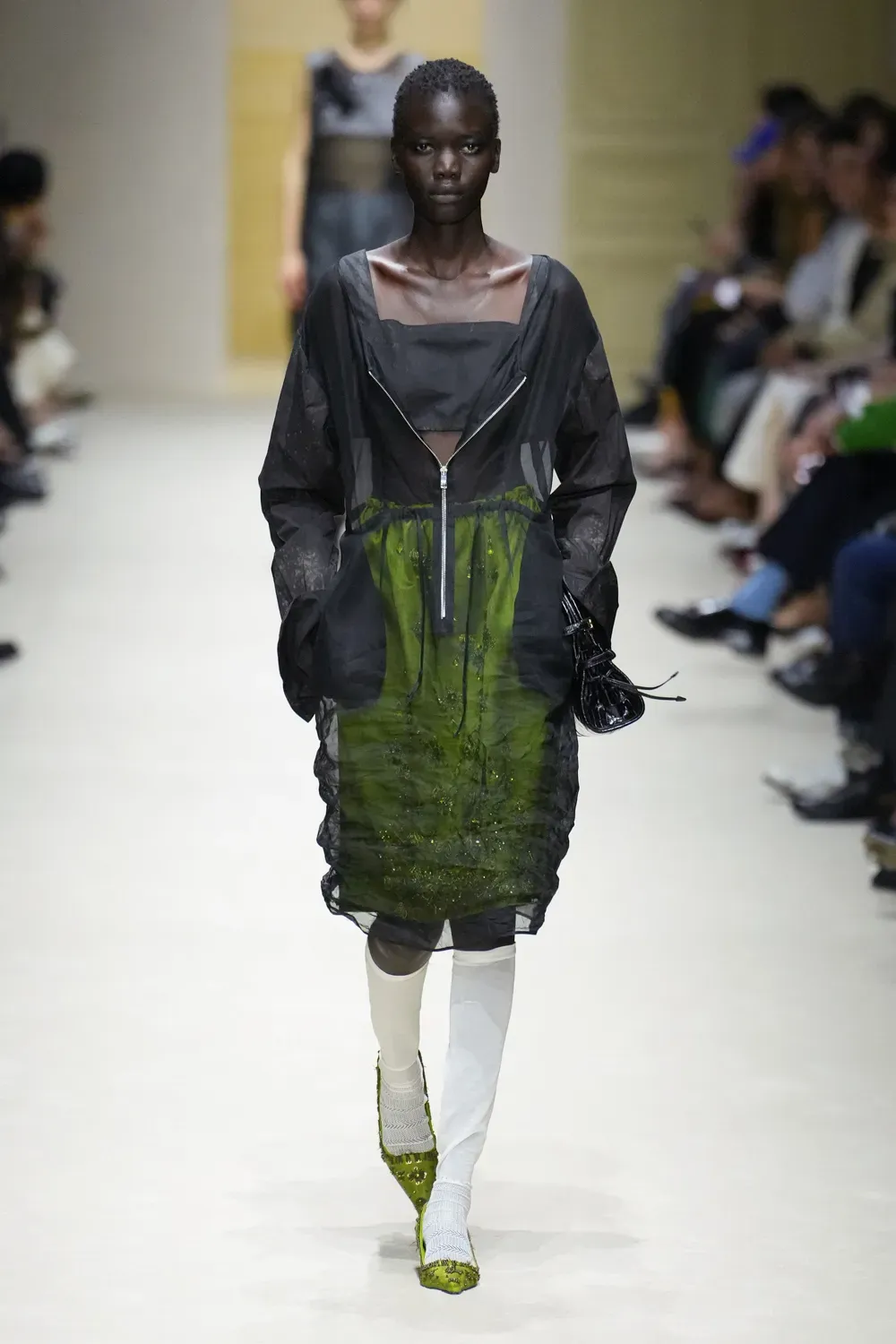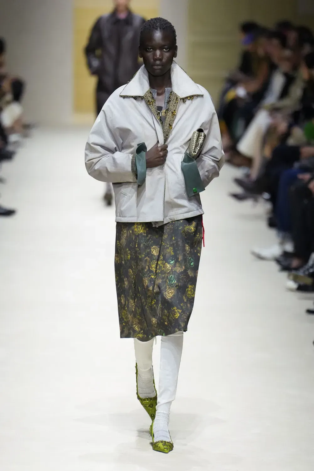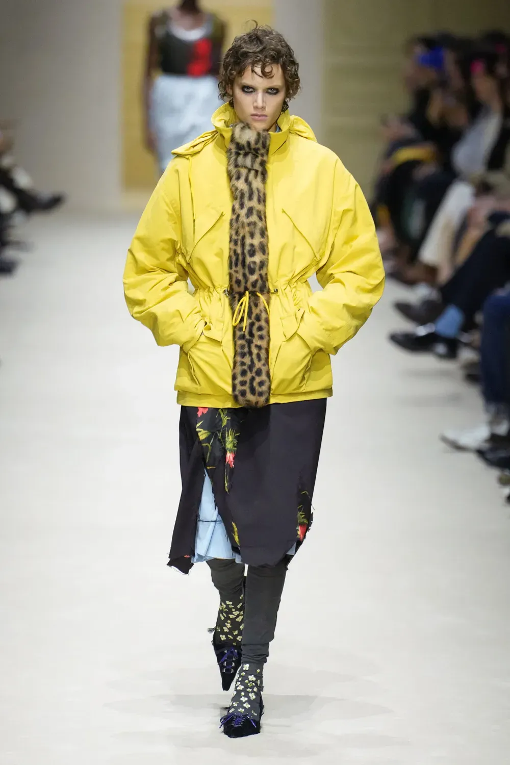 Gli abiti sono sempre loro, sempre moderni e funzionali ancorché più essenzializzati e quasi astratti, ma i dettagli crepuscolari di cui parlavamo sopra, l’enfasi sul loro disfacimento vista anche nelle camicie macchiate di muffa della collezione maschile, sembrano più porre dubbi esistenziali che architettare sogni in cui fuggire. Forse proprio fare la moda, riflettendo sulle incongruità delle nostre identità moderne attraverso le idiosincrasie degli abiti, è proprio la maniera in cui Miuccia Prada e Raf Simons vogliono indicare una strada per la resistenza tra i disastri della modernità.
