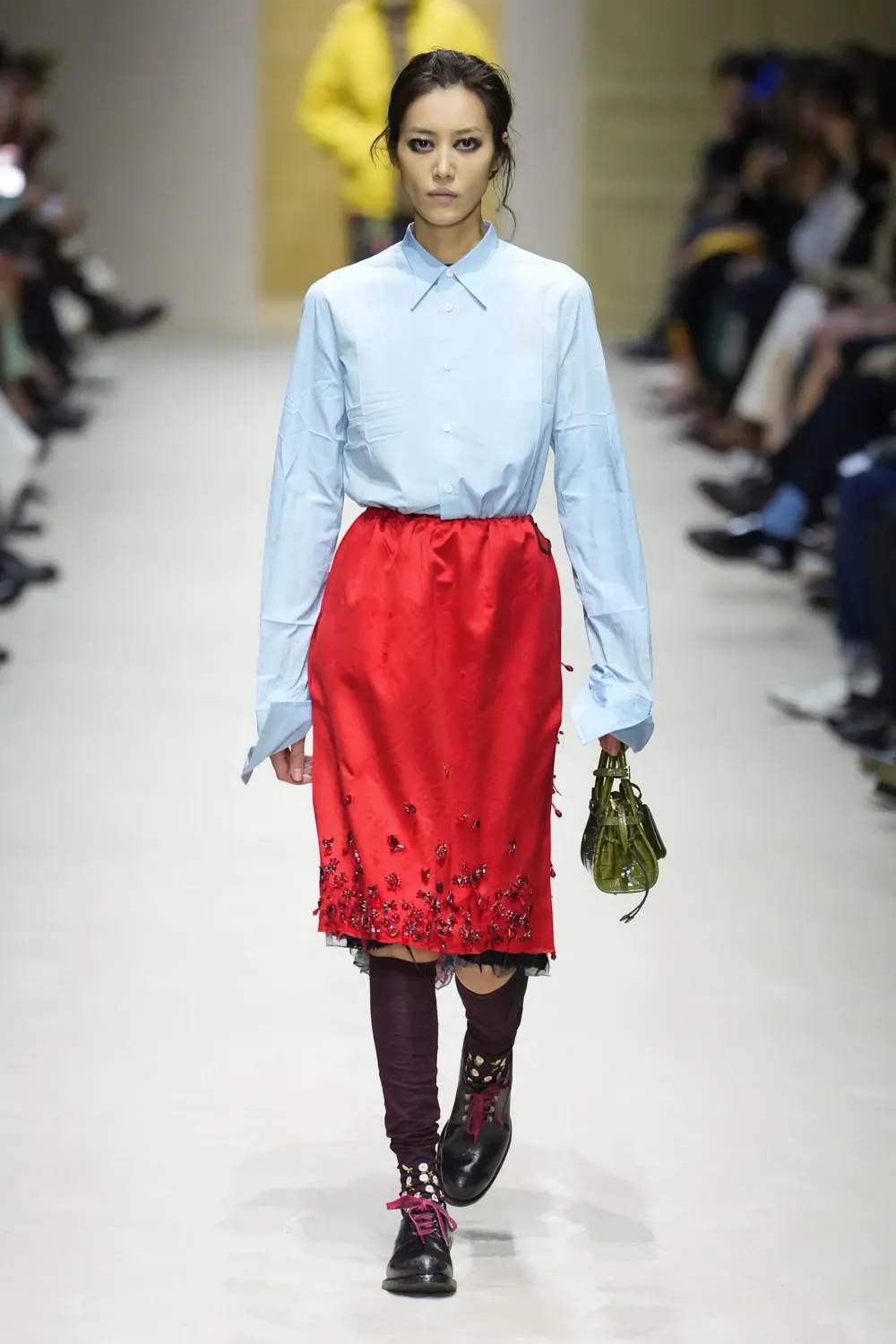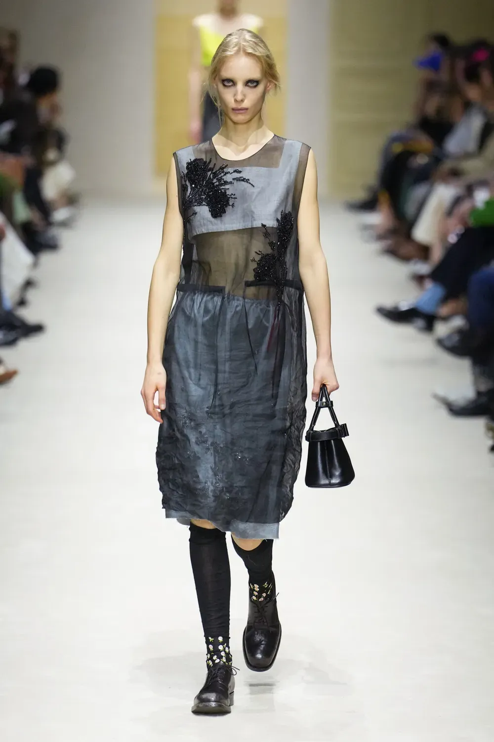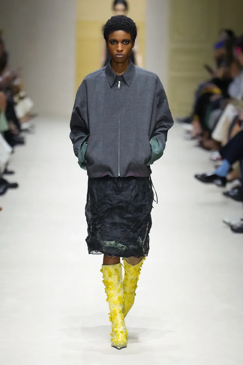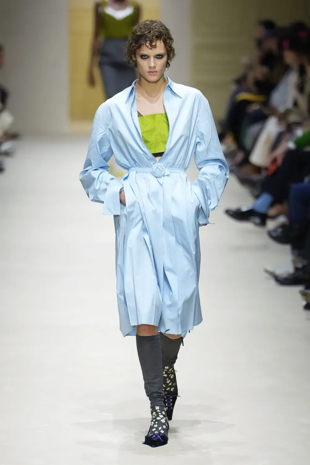 Gli abiti sono sempre loro, sempre moderni e funzionali ancorché più essenzializzati e quasi astratti, ma i dettagli crepuscolari di cui parlavamo sopra, l’enfasi sul loro disfacimento vista anche nelle camicie macchiate di muffa della collezione maschile, sembrano più porre dubbi esistenziali che architettare sogni in cui fuggire. Forse proprio fare la moda, riflettendo sulle incongruità delle nostre identità moderne attraverso le idiosincrasie degli abiti, è proprio la maniera in cui Miuccia Prada e Raf Simons vogliono indicare una strada per la resistenza tra i disastri della modernità.