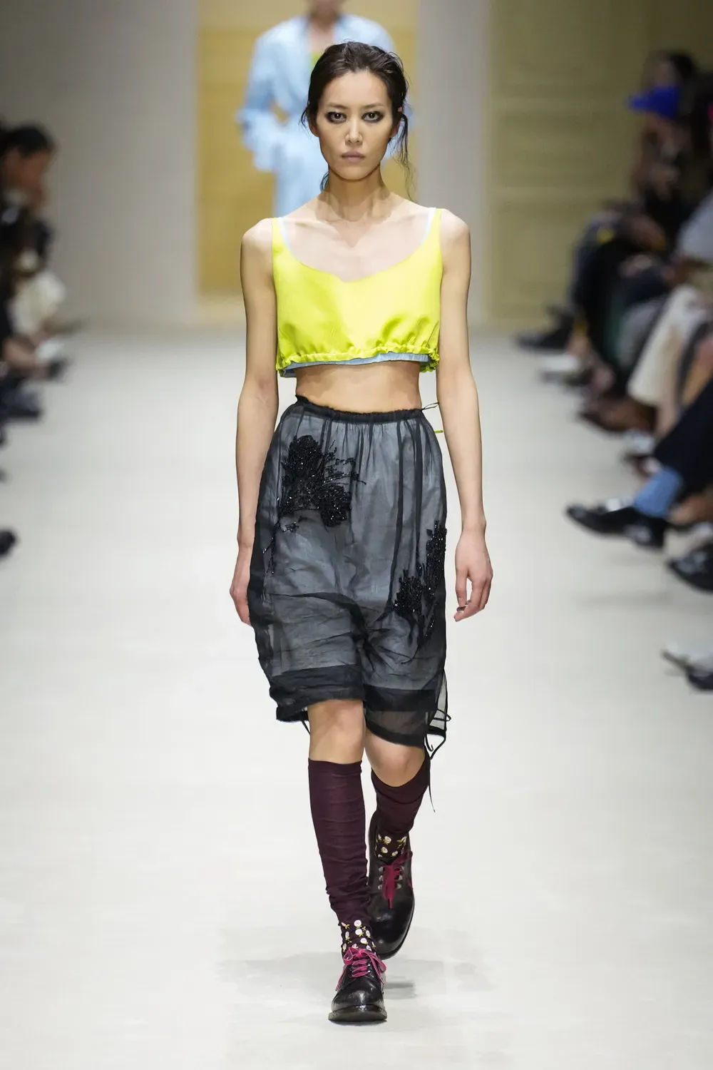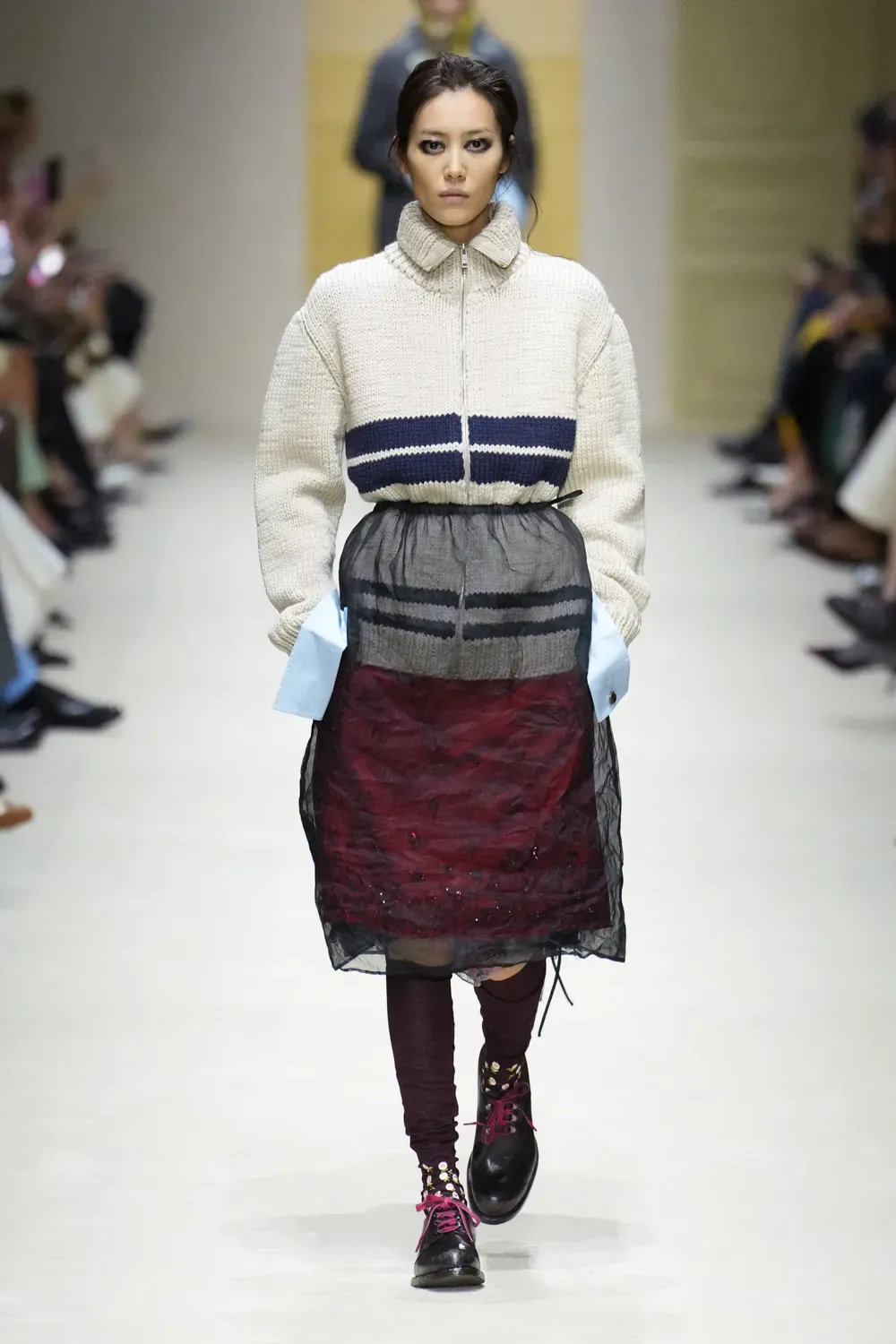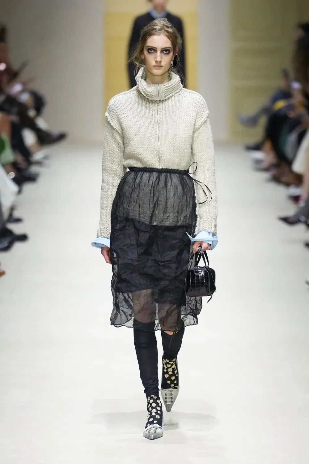 In particolare molti look includevano gonne e abiti di tulle trasparenti che, indossati sugli altri abiti, creavano una sorta di “filtro” che modificava interamente l’abbigliamento delle modelle, a volte rendendolo più etereo, a volte facendo apparire cristalli su top basici, altre volte invece quasi sporcando visivamente la perfezione del raso di una gonna. In certi casi, poi, la gonna trasparente si sovrapponeva in vita a un pesante maglione a zip creando un interessante squilibrio tra pesantezza e leggerezza, tra fragilità e corposità.