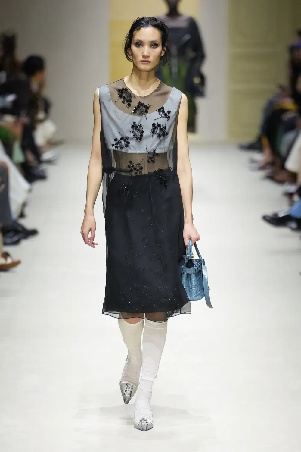 «Invece di mostrare 60 look su 60 donne, in questa stagione abbiamo scelto di mostrare 15 look su 15 donne: ogni look appare quattro volte, ma proposto in modo diverso», ha detto Raf Simons nella sua dichiarazione alla stampa rilasciata prima dello show FW26 per la collezione femminile di Prada. Il concept della collezione, in effetti, sembra voler riecheggiare lo stato d’animo di un mondo del lusso in fase di contrazione dove, al design puro, si sovrappone lo styling, ovvero l’idea di poter creare con gli stessi capi tanti look diversi. Con in più (si tratta di Prada dopo tutto) l’idea di far dialogare con questa tendenza anche un certo poetico senso del crepuscolare.