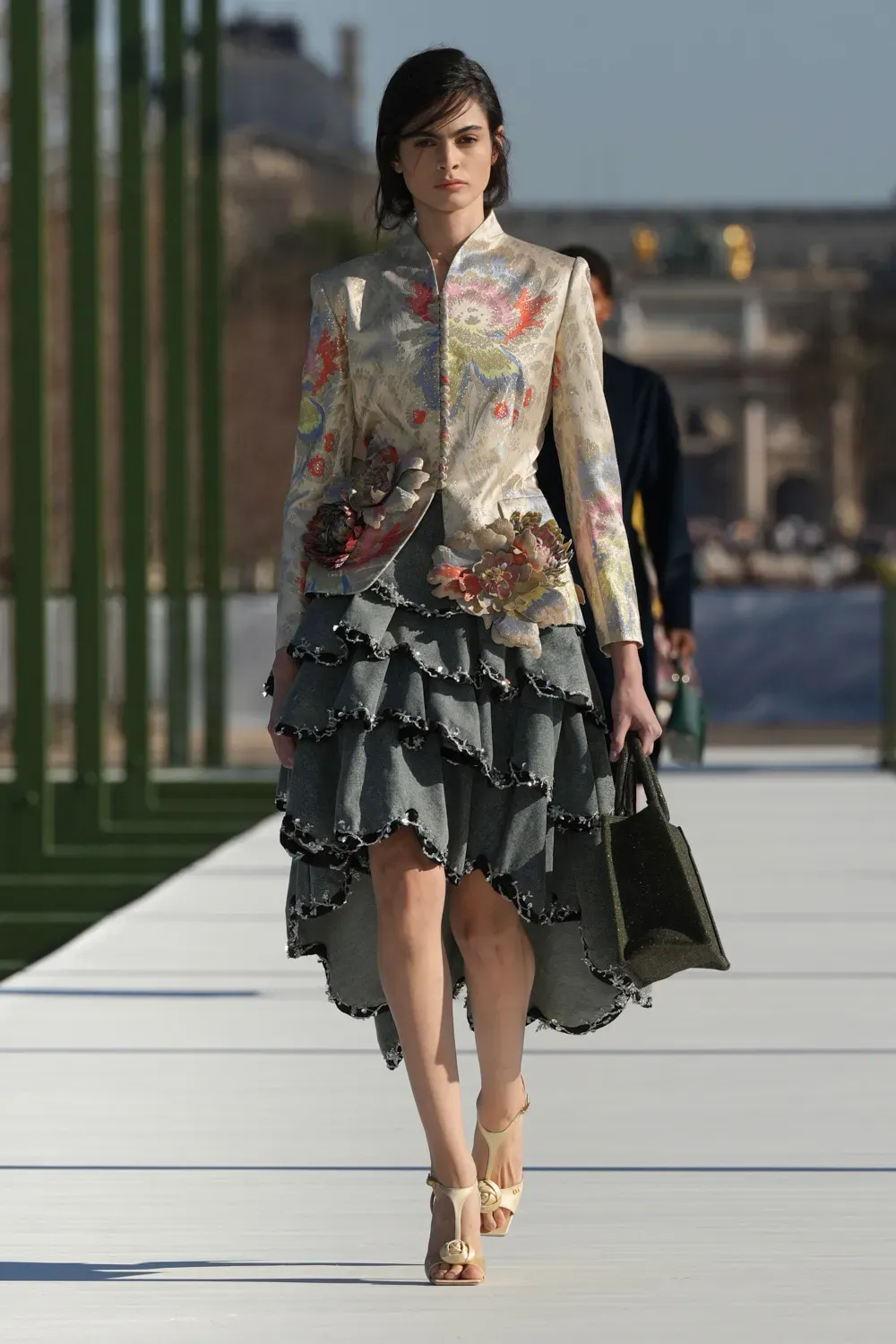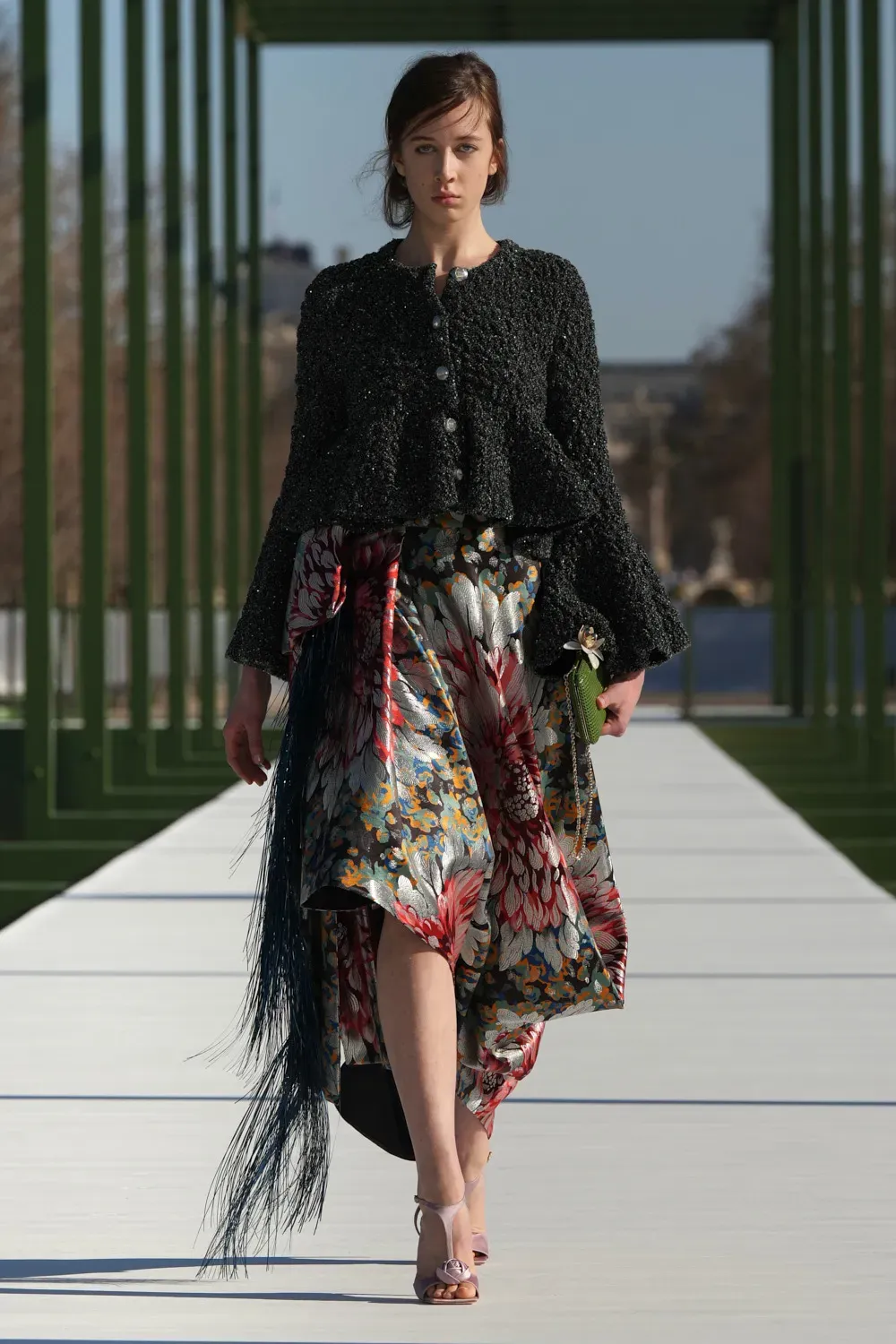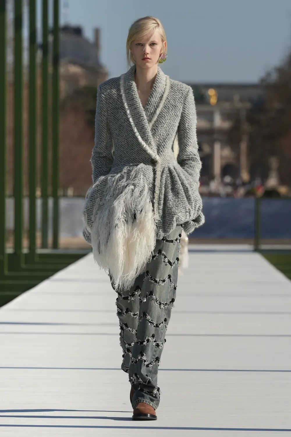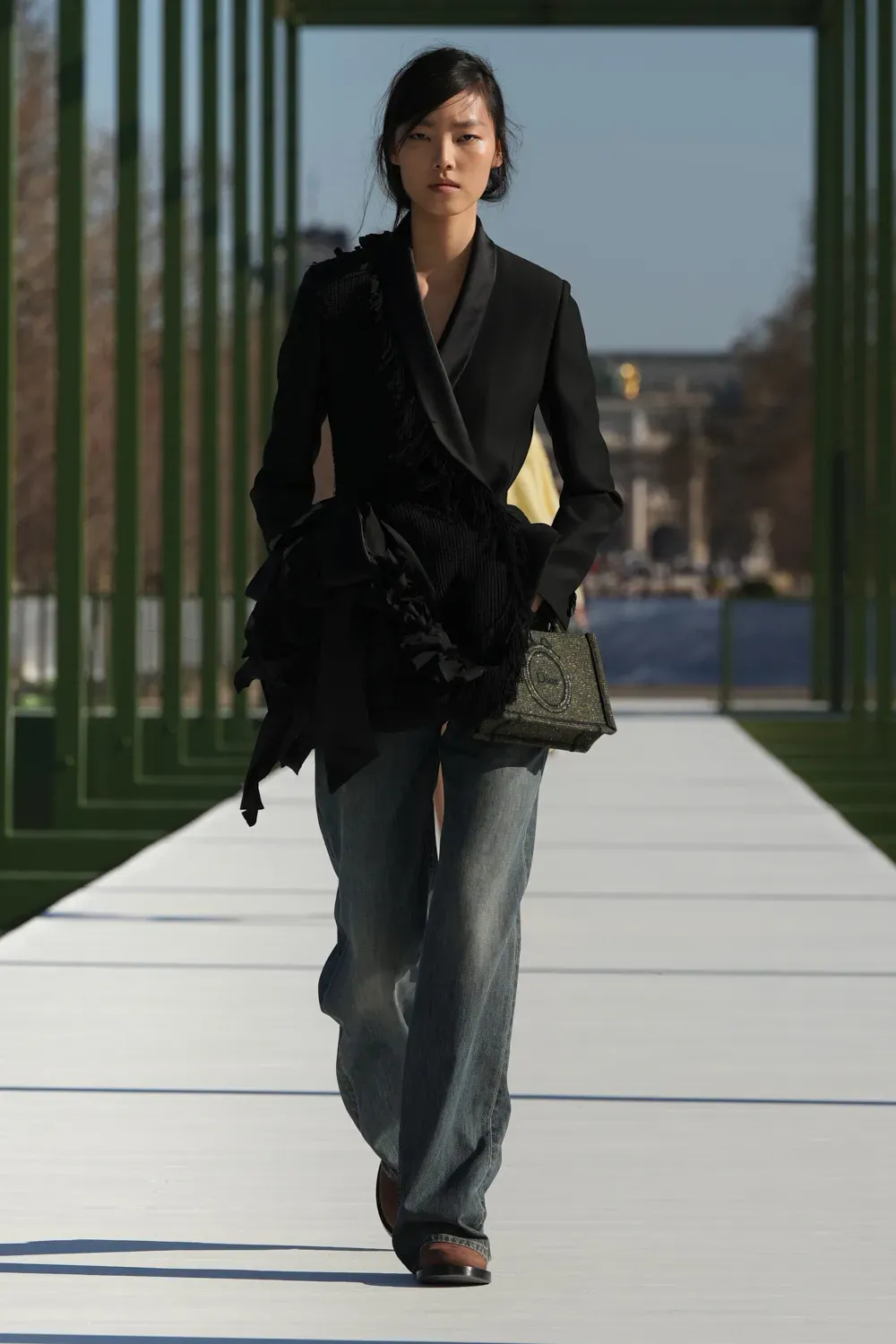 Il tema dello show è stato floreale, come spesso accade da Dior. Mughetti, calle, trombe d’angelo, loti e ninfee: se la passerella fosse stata un prato, le modelle sarebbero state questi fiori. Eppure questo tema botanico praticamente onnipresente, se si pensa che anche le decorazioni di cristalli sui jeans ricordavano le corone d’alloro, era sviluppato in modo concettuale e poco ovvio. Erano infatti le silhouette e gli effetti della stoffa che ricordavano la conformazione dei fiori: prendendo come esempio, uno tra i molti, le giacche-cardigan dal tessuto “arricciato” viste in apertura si può notare come sia la silhouette della giacca ricordasse la corolla di un fiore e sia l’effetto riprodotto sul tessuto ricordasse un accumulo di petali.