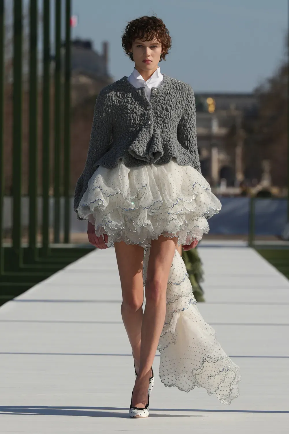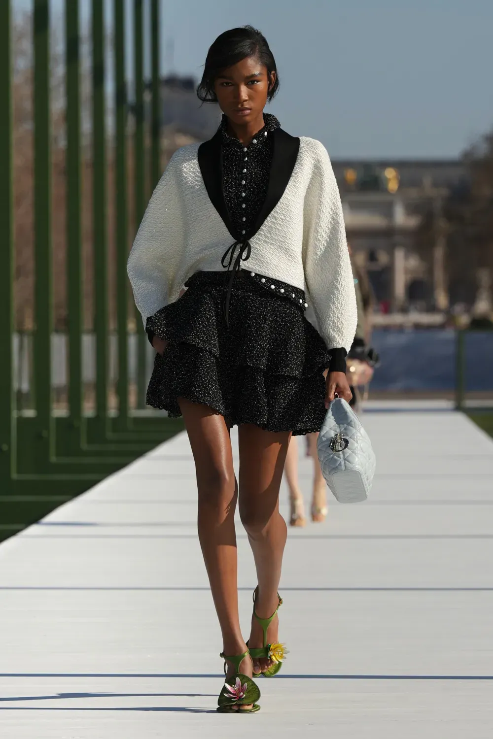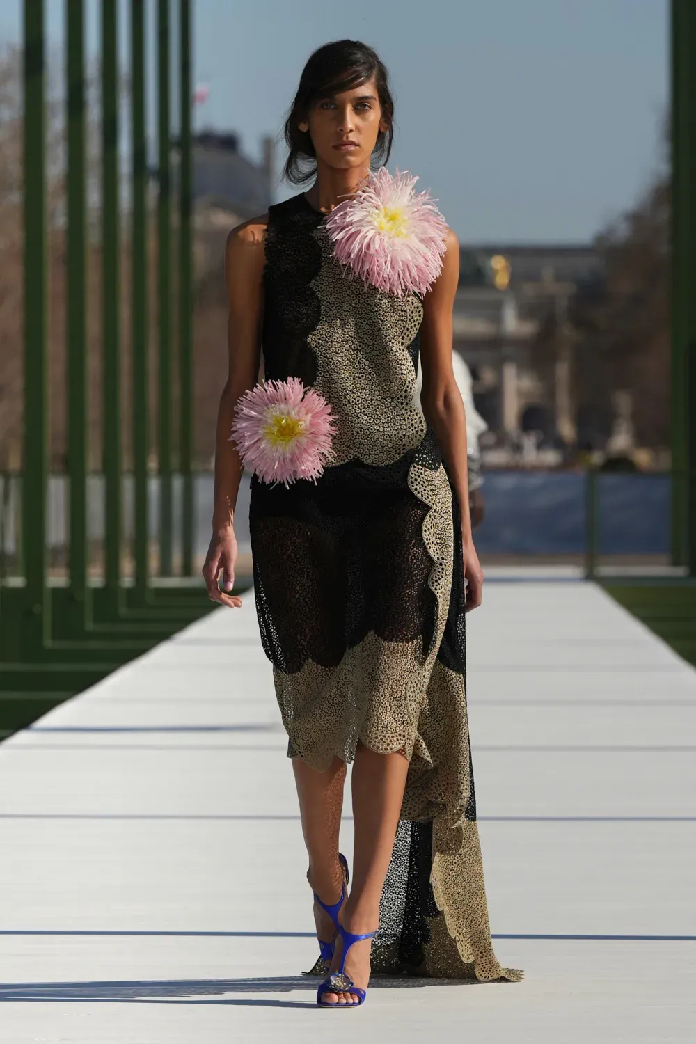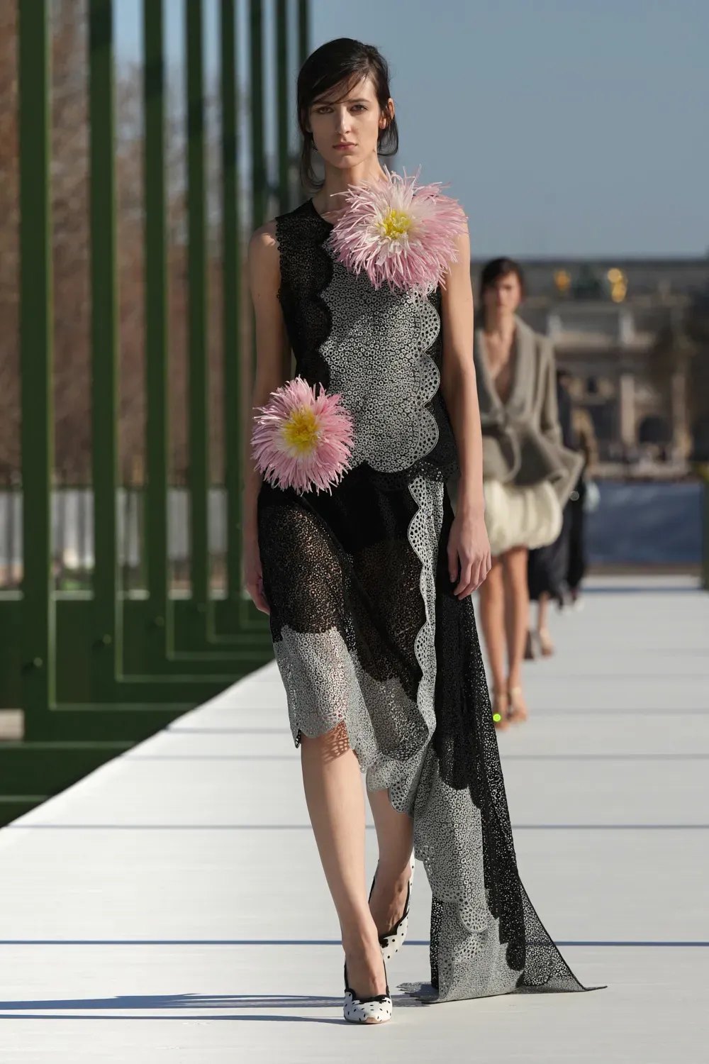 Il tema dello show è stato floreale, come spesso accade da Dior. Mughetti, calle, trombe d’angelo, loti e ninfee: se la passerella fosse stata un prato, le modelle sarebbero state questi fiori. Eppure questo tema botanico praticamente onnipresente, se si pensa che anche le decorazioni di cristalli sui jeans ricordavano le corone d’alloro, era sviluppato in modo concettuale e poco ovvio. Erano infatti le silhouette e gli effetti della stoffa che ricordavano la conformazione dei fiori: prendendo come esempio, uno tra i molti, le giacche-cardigan dal tessuto “arricciato” viste in apertura si può notare come sia la silhouette della giacca ricordasse la corolla di un fiore e sia l’effetto riprodotto sul tessuto ricordasse un accumulo di petali.