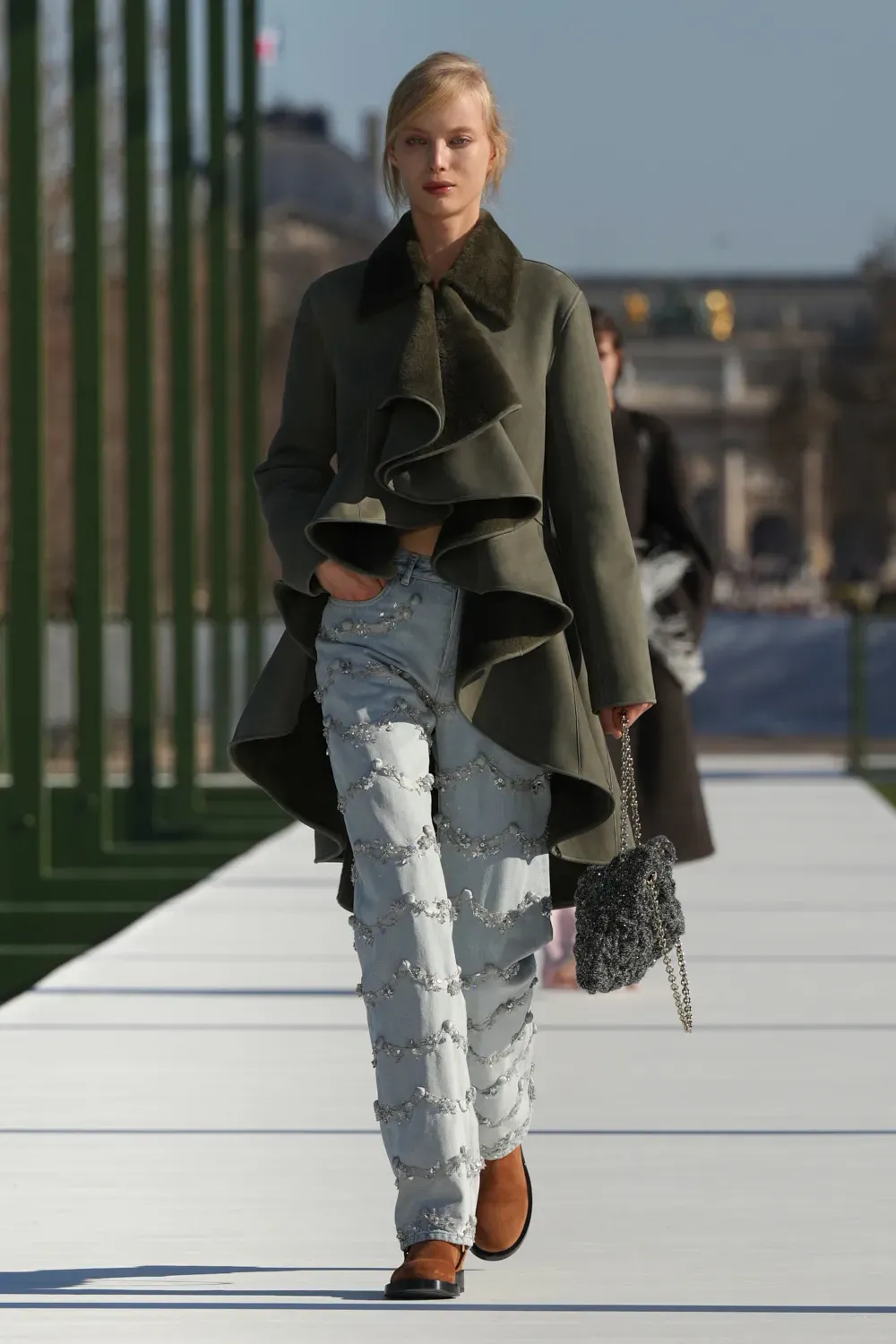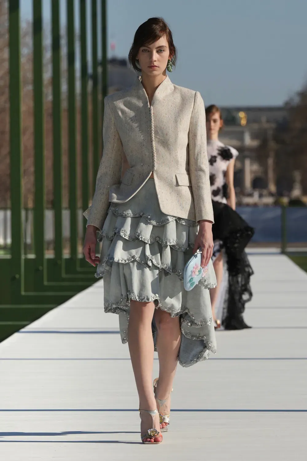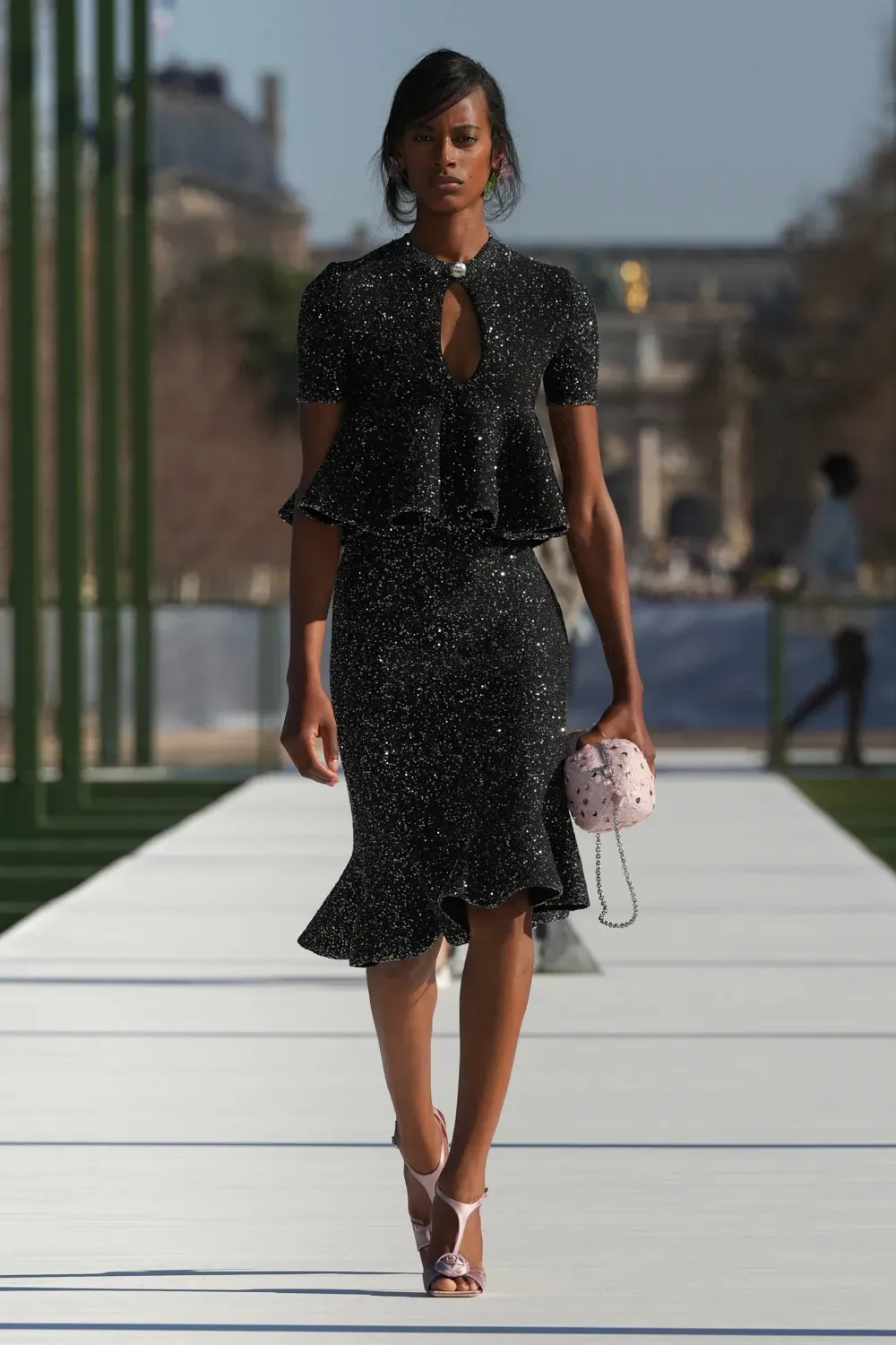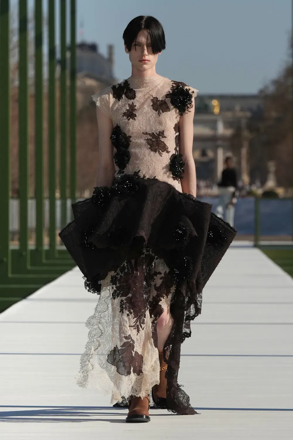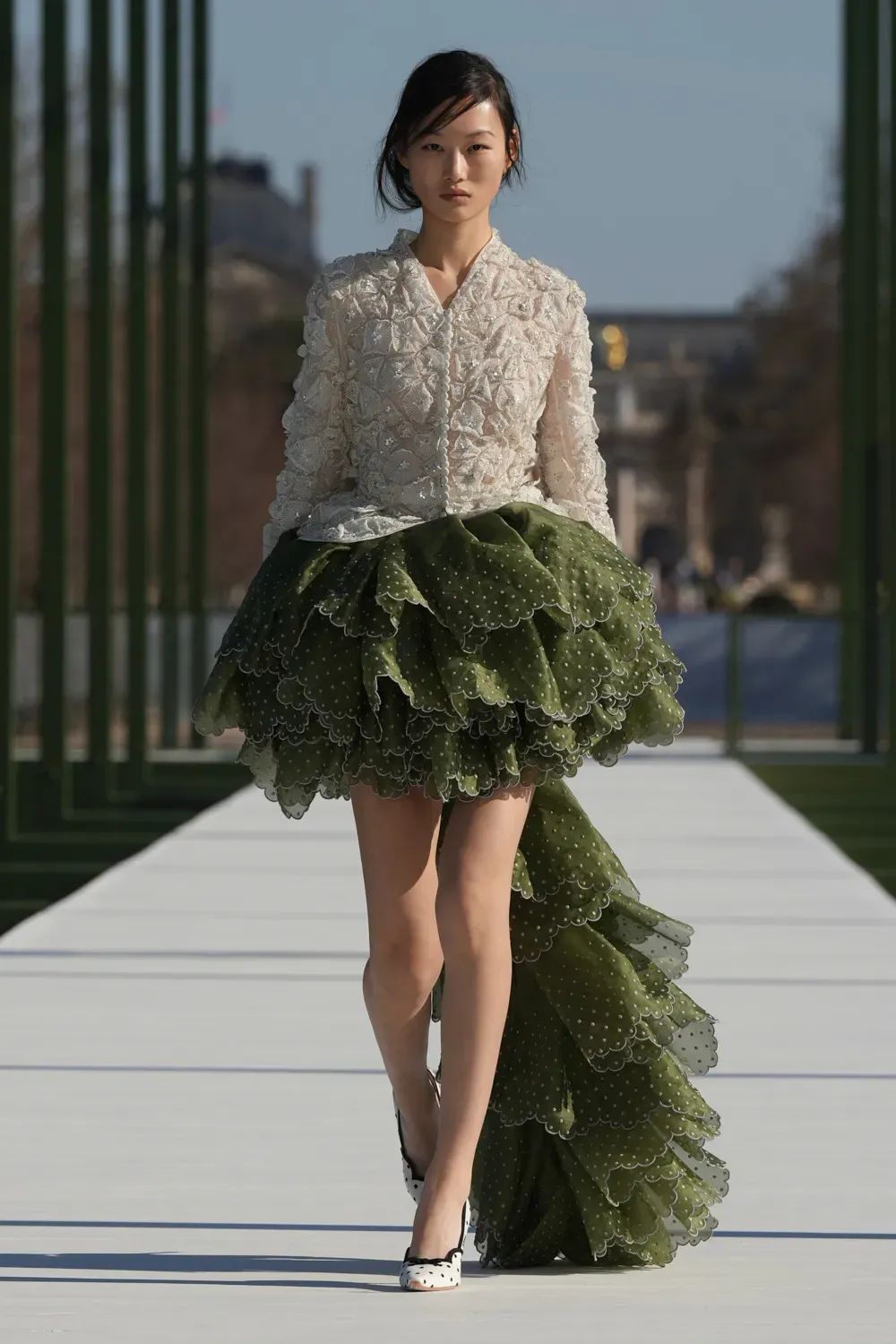 Il tema dello show è stato floreale, come spesso accade da Dior. Mughetti, calle, trombe d’angelo, loti e ninfee: se la passerella fosse stata un prato, le modelle sarebbero state questi fiori. Eppure questo tema botanico praticamente onnipresente, se si pensa che anche le decorazioni di cristalli sui jeans ricordavano le corone d’alloro, era sviluppato in modo concettuale e poco ovvio. Erano infatti le silhouette e gli effetti della stoffa che ricordavano la conformazione dei fiori: prendendo come esempio, uno tra i molti, le giacche-cardigan dal tessuto “arricciato” viste in apertura si può notare come sia la silhouette della giacca ricordasse la corolla di un fiore e sia l’effetto riprodotto sul tessuto ricordasse un accumulo di petali.