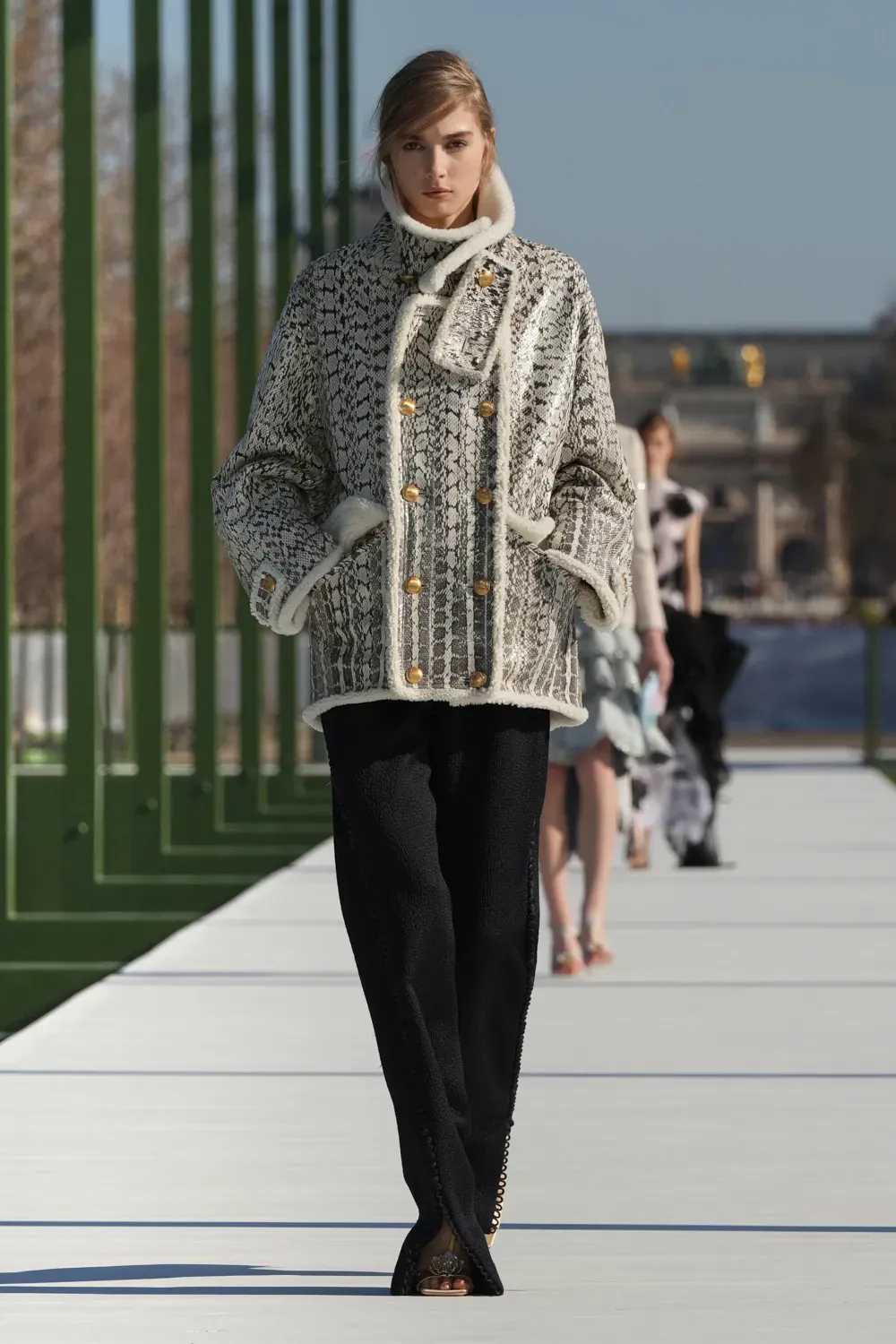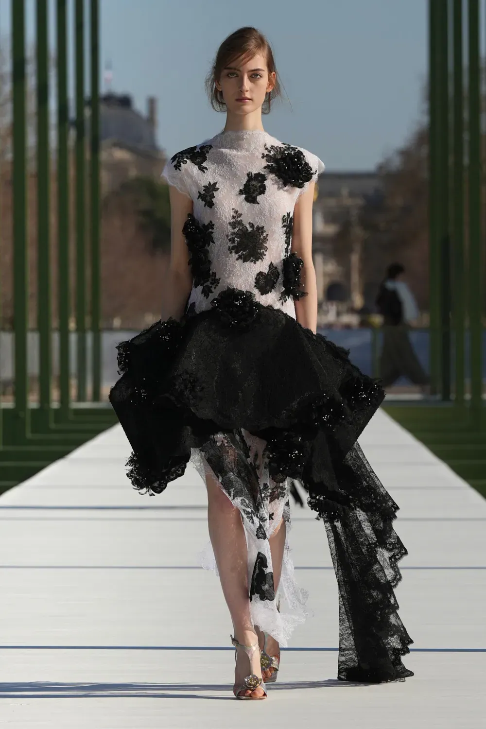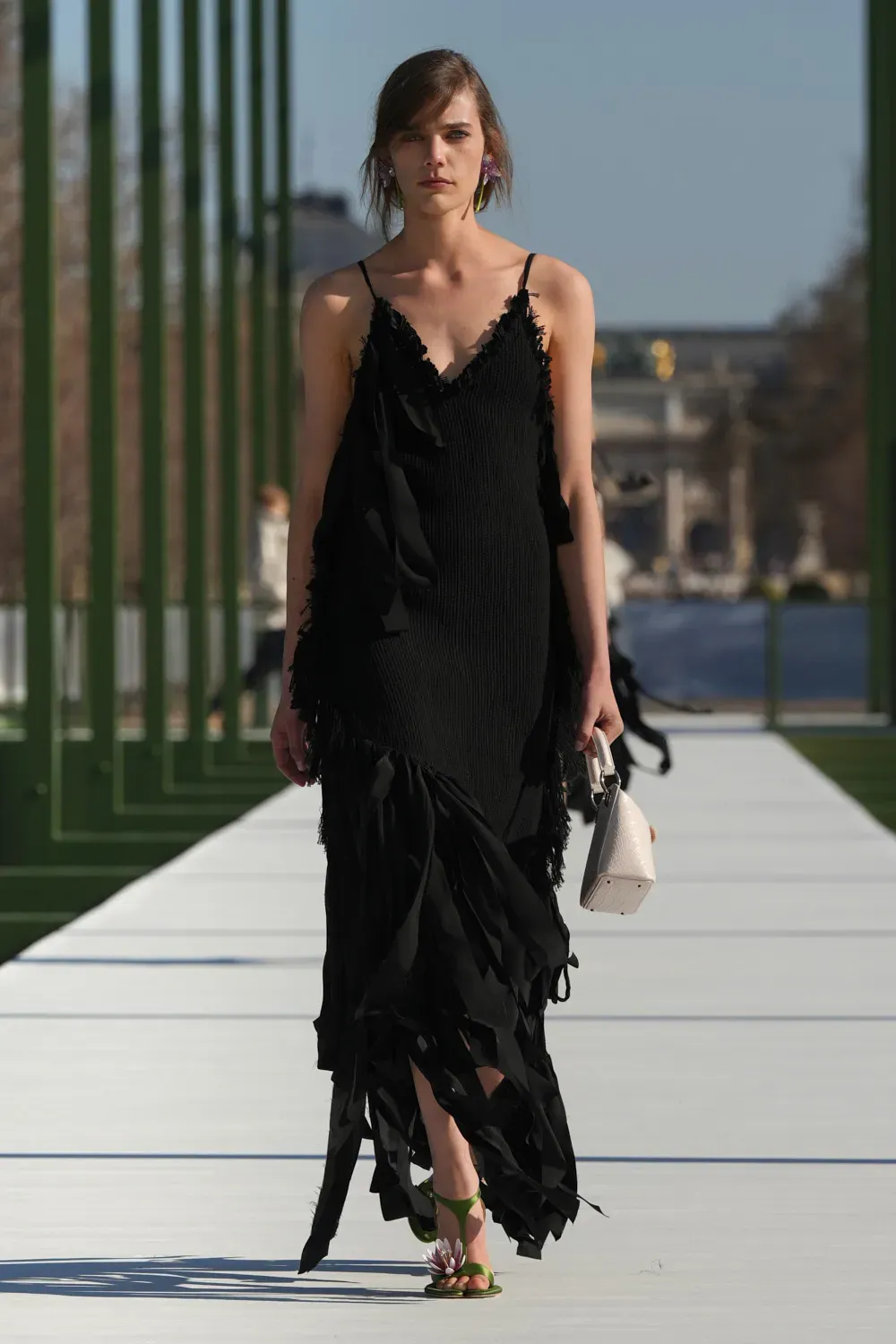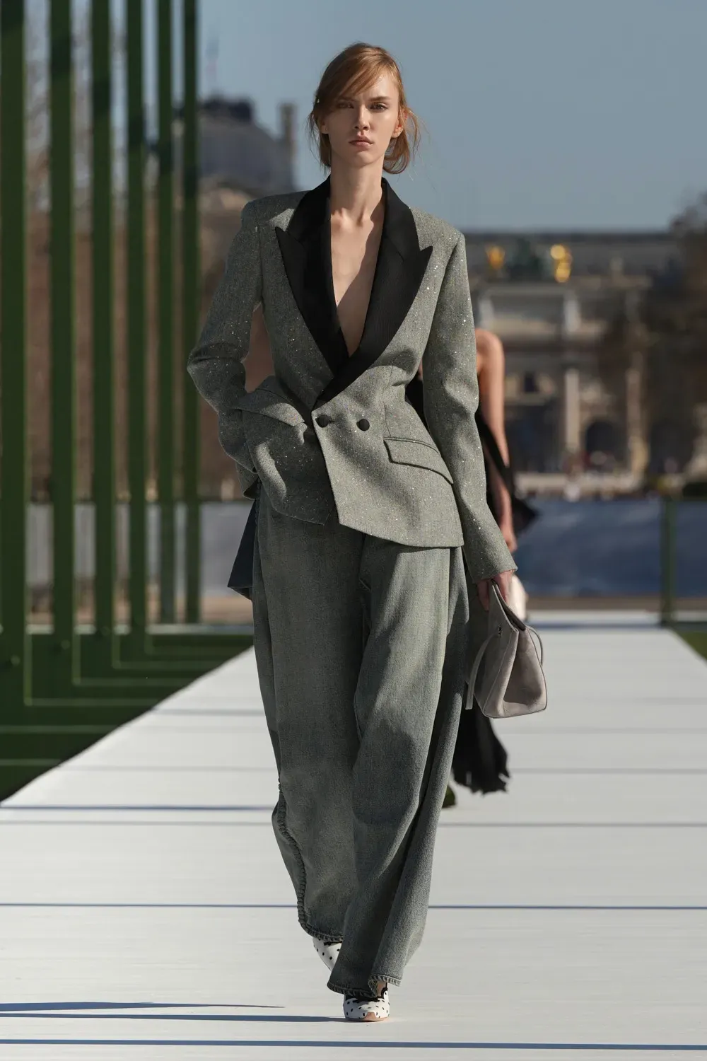 Il tema dello show è stato floreale, come spesso accade da Dior. Mughetti, calle, trombe d’angelo, loti e ninfee: se la passerella fosse stata un prato, le modelle sarebbero state questi fiori. Eppure questo tema botanico praticamente onnipresente, se si pensa che anche le decorazioni di cristalli sui jeans ricordavano le corone d’alloro, era sviluppato in modo concettuale e poco ovvio. Erano infatti le silhouette e gli effetti della stoffa che ricordavano la conformazione dei fiori: prendendo come esempio, uno tra i molti, le giacche-cardigan dal tessuto “arricciato” viste in apertura si può notare come sia la silhouette della giacca ricordasse la corolla di un fiore e sia l’effetto riprodotto sul tessuto ricordasse un accumulo di petali.
