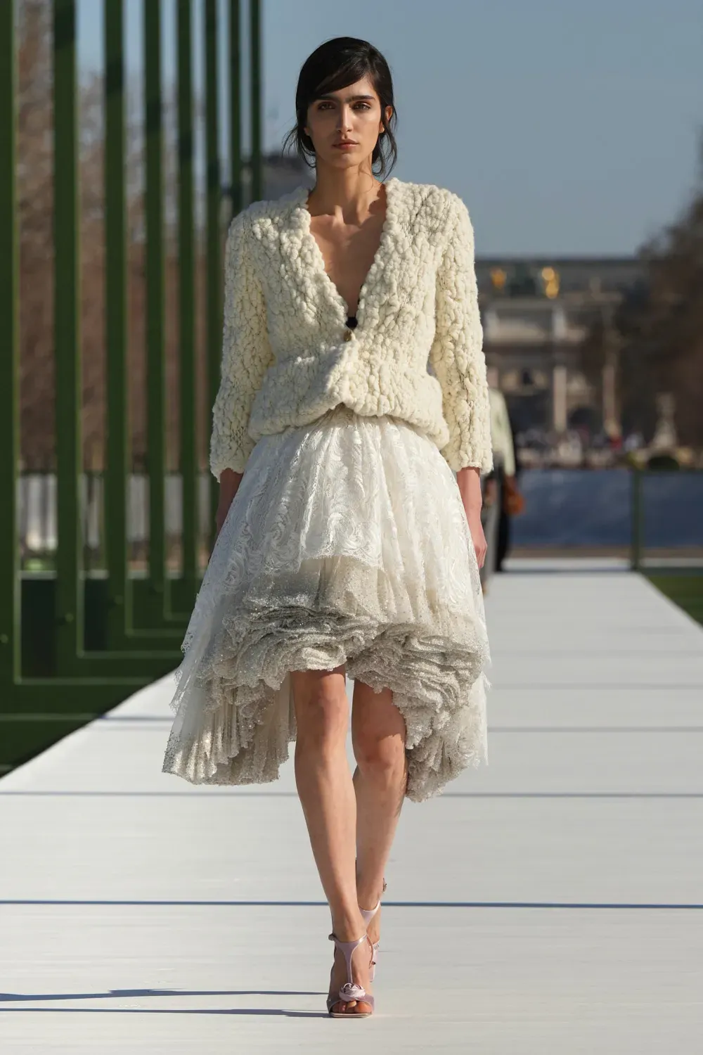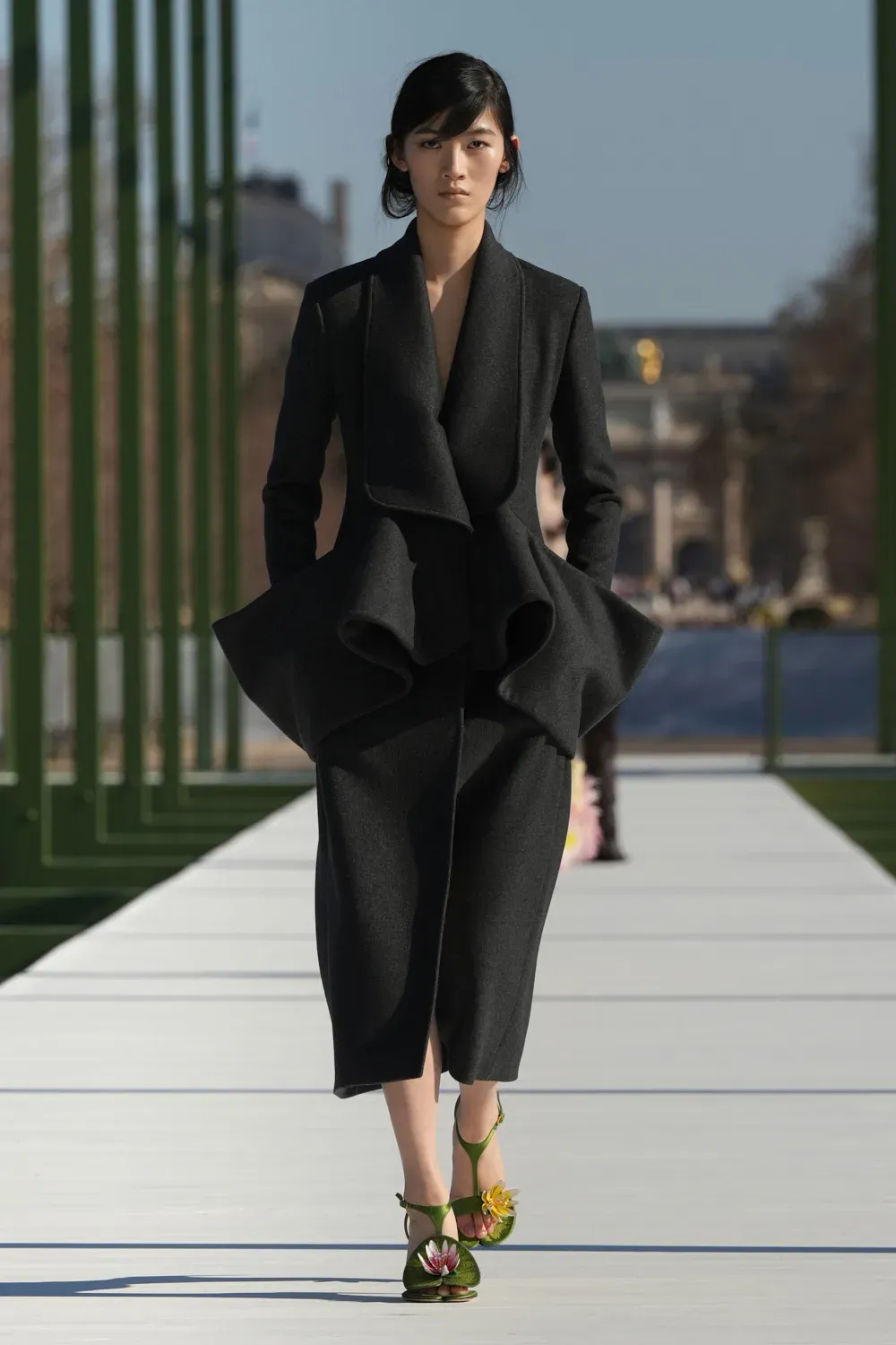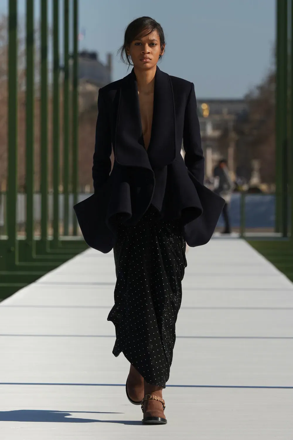 Proprio la silhouette è stata il punto forte della collezione. Se nel primo show femminile ne avevamo viste di molto varie e di molto esagerate, oggi la loro varietà era più coerente. Si è senza dubbio notata una spinta sui vestiti più indossabili, ma in generale la varietà di silhouette proposte è parsa più disciplinata e concisa. È tornata la nuova versione della Bar Jacket, ristretta e con un altissimo punto vita; ma anche quella tondeggiante e allungata dei pantaloni e di certi capispalla e vestaglie che creavano come un bozzolo. Le gonne e gli abiti allacciati asimmetricamente, così come anche le giacche la cui struttura sul retro, riproducevano il rigonfiamento di una tournure ottocentesca.