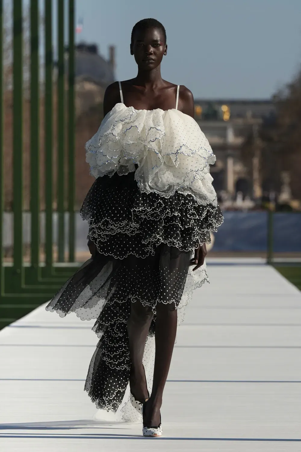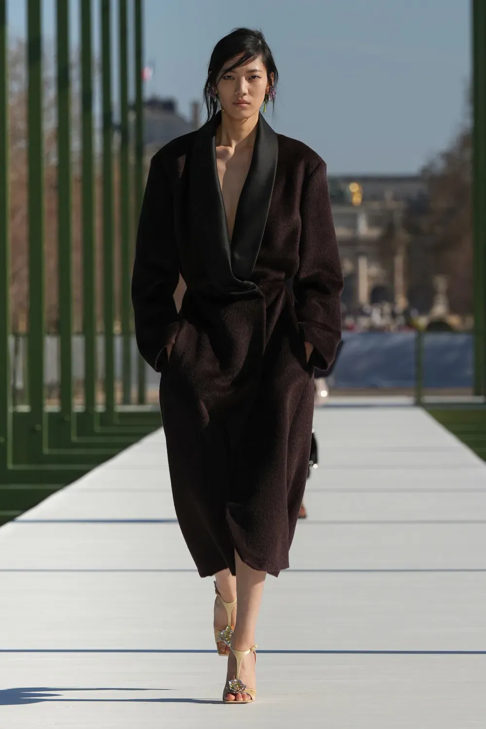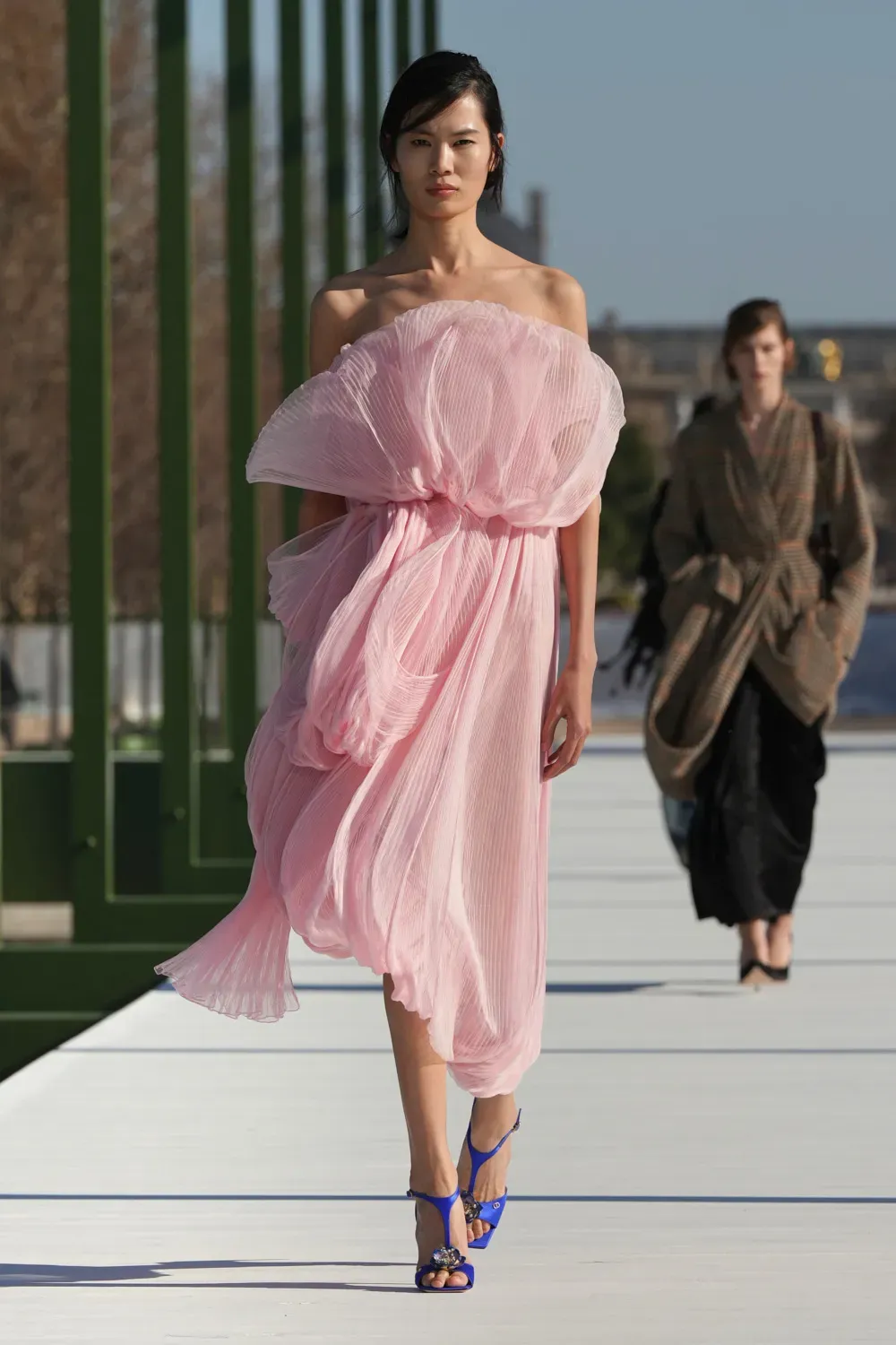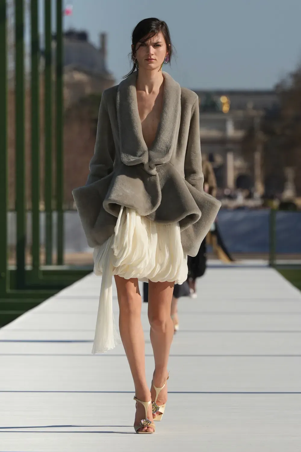Proprio la silhouette è stata il punto forte della collezione. Se nel primo show femminile ne avevamo viste di molto varie e di molto esagerate, oggi la loro varietà era più coerente. Si è senza dubbio notata una spinta sui vestiti più indossabili, ma in generale la varietà di silhouette proposte è parsa più disciplinata e concisa. È tornata la nuova versione della Bar Jacket, ristretta e con un altissimo punto vita; ma anche quella tondeggiante e allungata dei pantaloni e di certi capispalla e vestaglie che creavano come un bozzolo. Le gonne e gli abiti allacciati asimmetricamente, così come anche le giacche la cui struttura sul retro, riproducevano il rigonfiamento di una tournure ottocentesca.