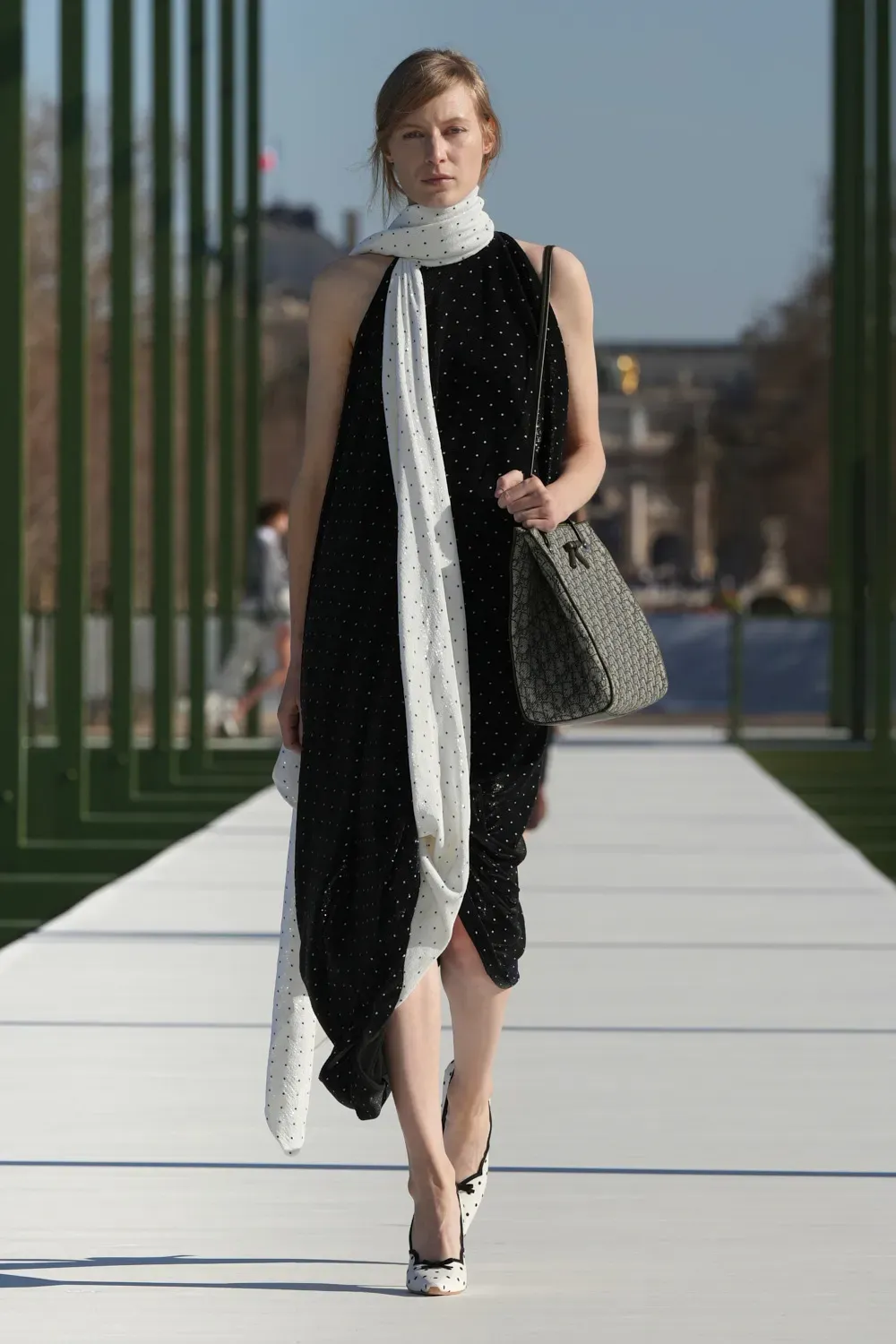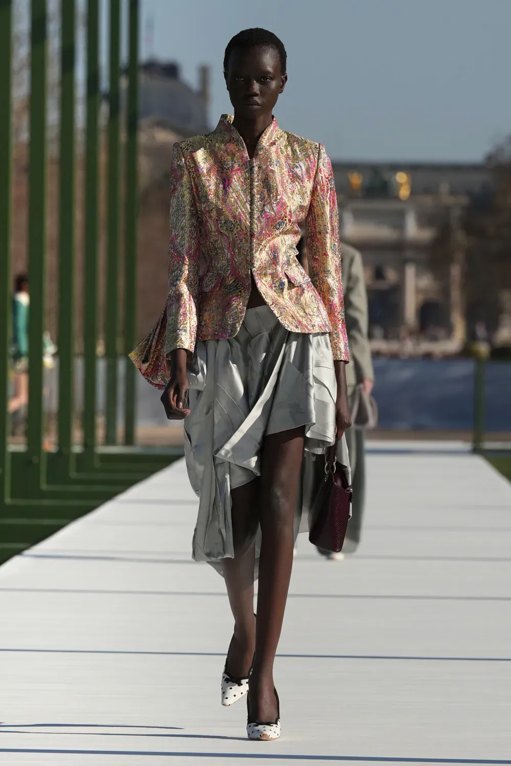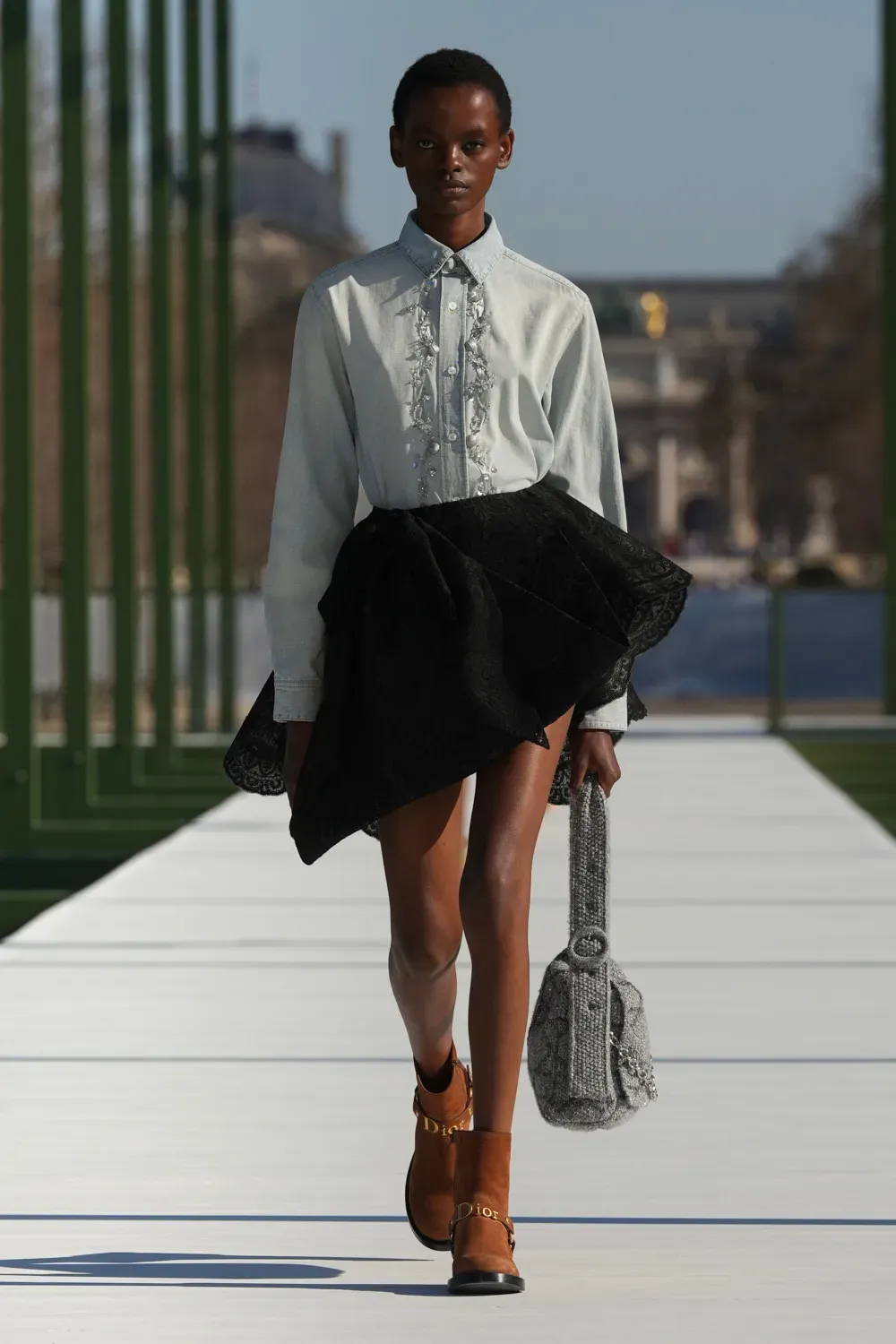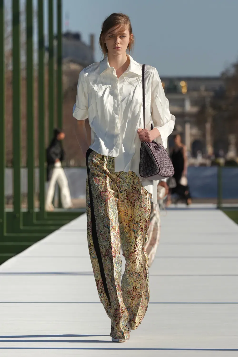 Al netto dei singoli capi e della loro costruzione più o meno anti-convenzionale, un altro elemento molto più a fuoco in questa collezione che nelle precedenti è l’archetipo della nuova donna Dior che, lungi dallo stare vestita in crinoline come una dama d’altri tempi, ha un guardaroba pensato per la vita contemporanea, anche se non estraneo a certe seduzioni nostalgiche per l’antica aristocrazia francese. È una donna indubbiamente elegante, che apprezza le proprie giacche squisite, le proprie opulente camicie di seta e ha un senso semplice del vestire con abiti che però sono complicati. Nello scarto tra la semplicità della concezione e nella sofisticazione della costruzione si può misurare l’originalità di spirito, oltre che l’eleganza, della nuova donna Dior.