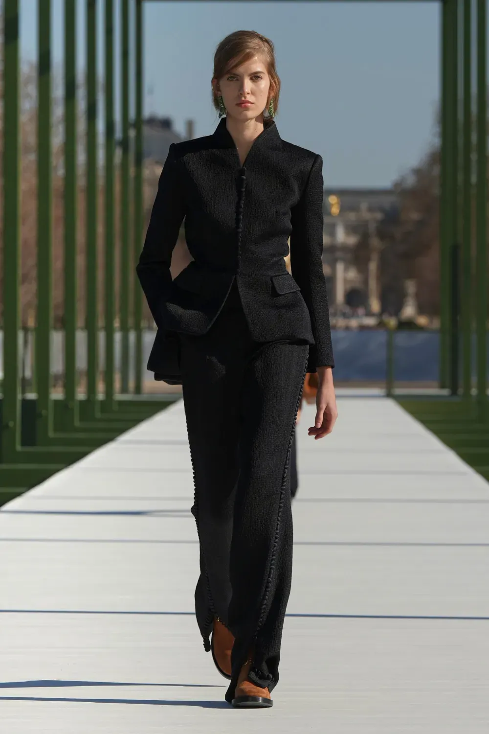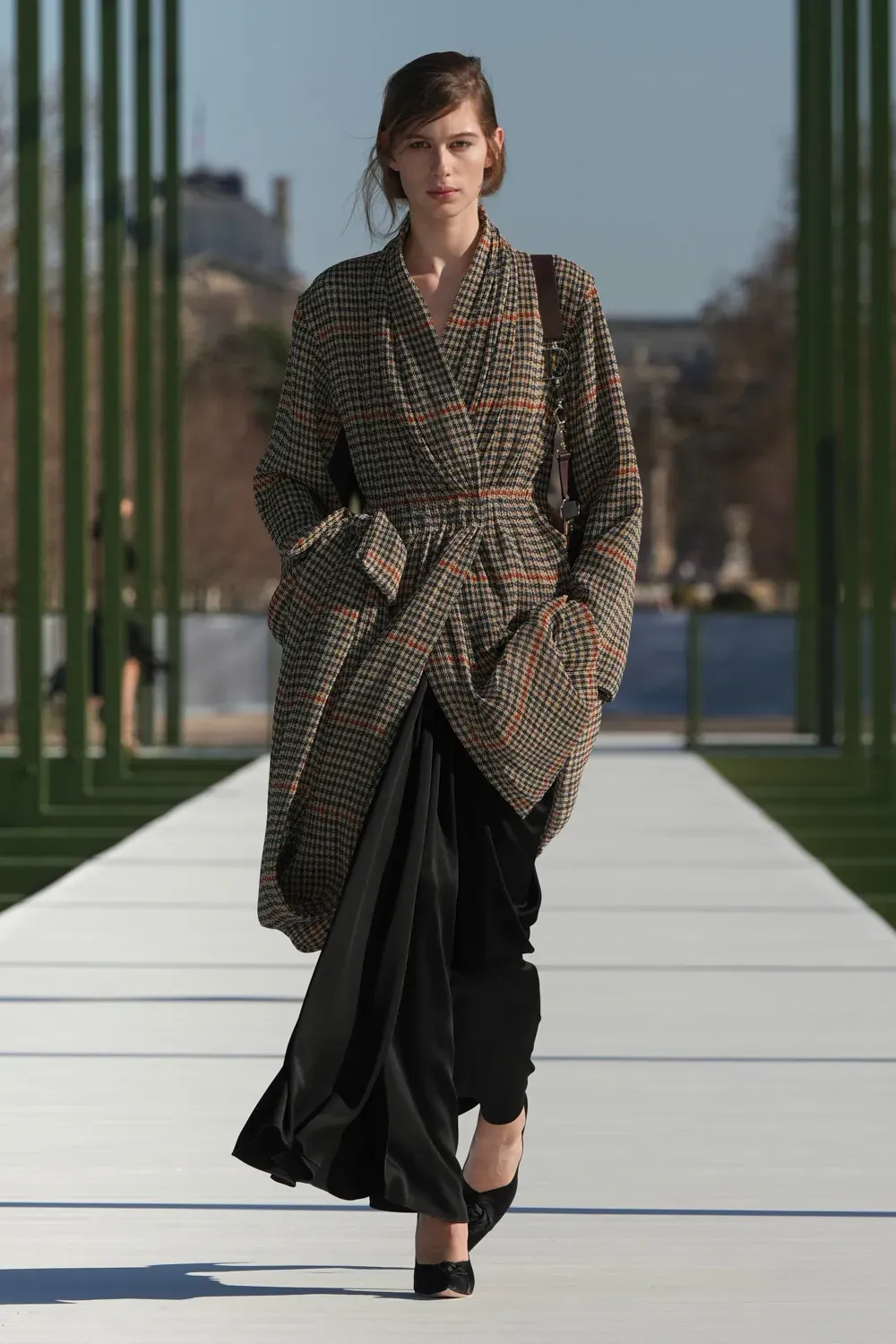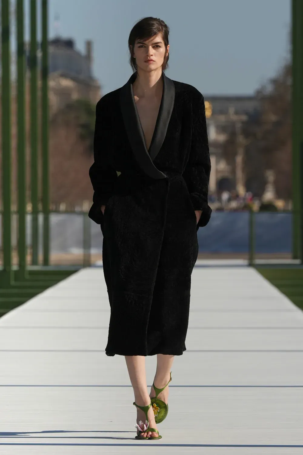 Al netto dei singoli capi e della loro costruzione più o meno anti-convenzionale, un altro elemento molto più a fuoco in questa collezione che nelle precedenti è l’archetipo della nuova donna Dior che, lungi dallo stare vestita in crinoline come una dama d’altri tempi, ha un guardaroba pensato per la vita contemporanea, anche se non estraneo a certe seduzioni nostalgiche per l’antica aristocrazia francese. È una donna indubbiamente elegante, che apprezza le proprie giacche squisite, le proprie opulente camicie di seta e ha un senso semplice del vestire con abiti che però sono complicati. Nello scarto tra la semplicità della concezione e nella sofisticazione della costruzione si può misurare l’originalità di spirito, oltre che l’eleganza, della nuova donna Dior.