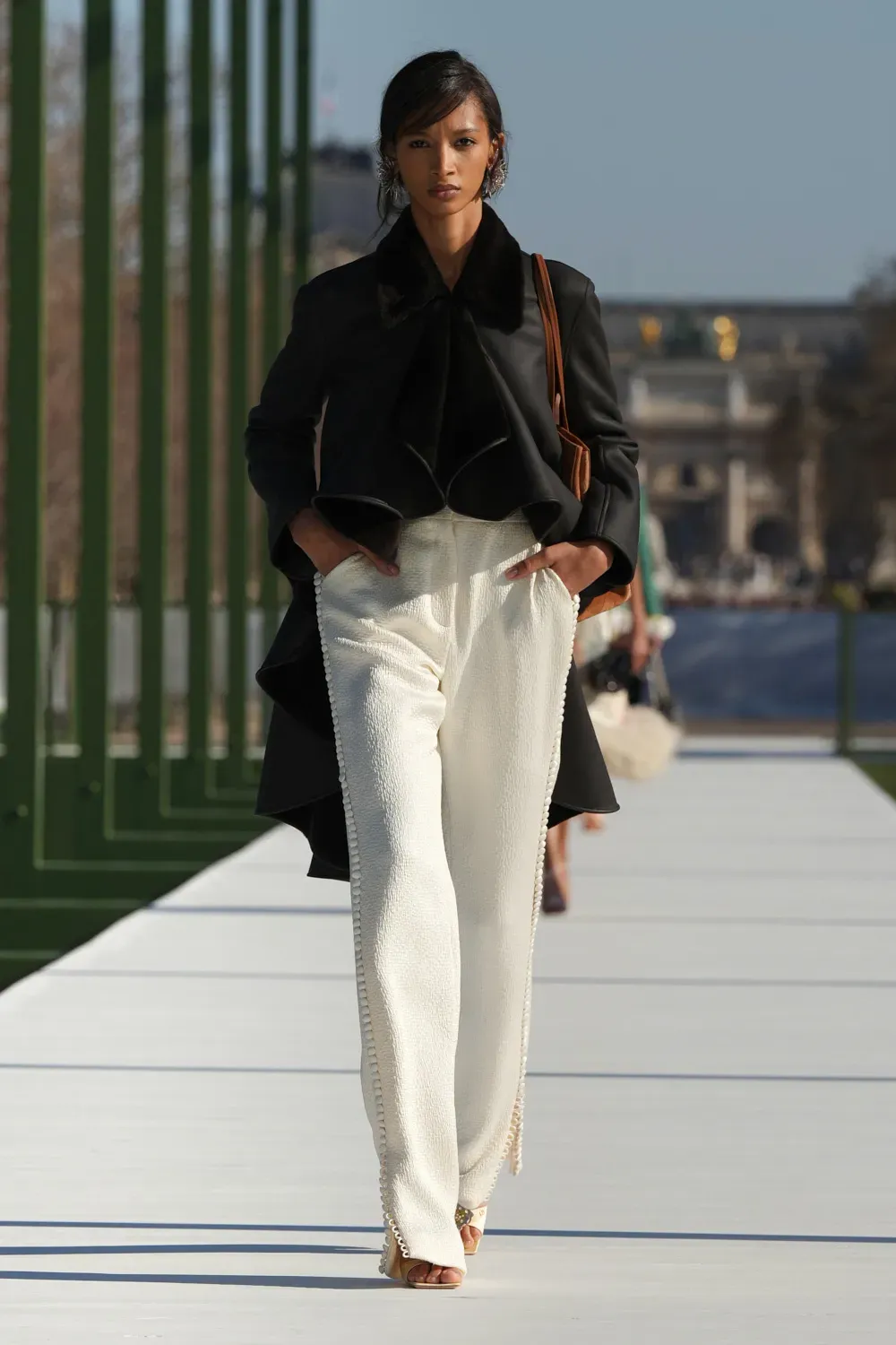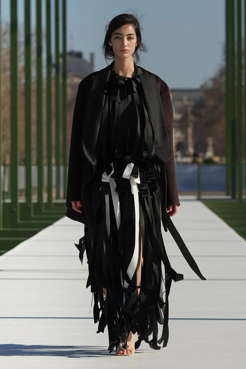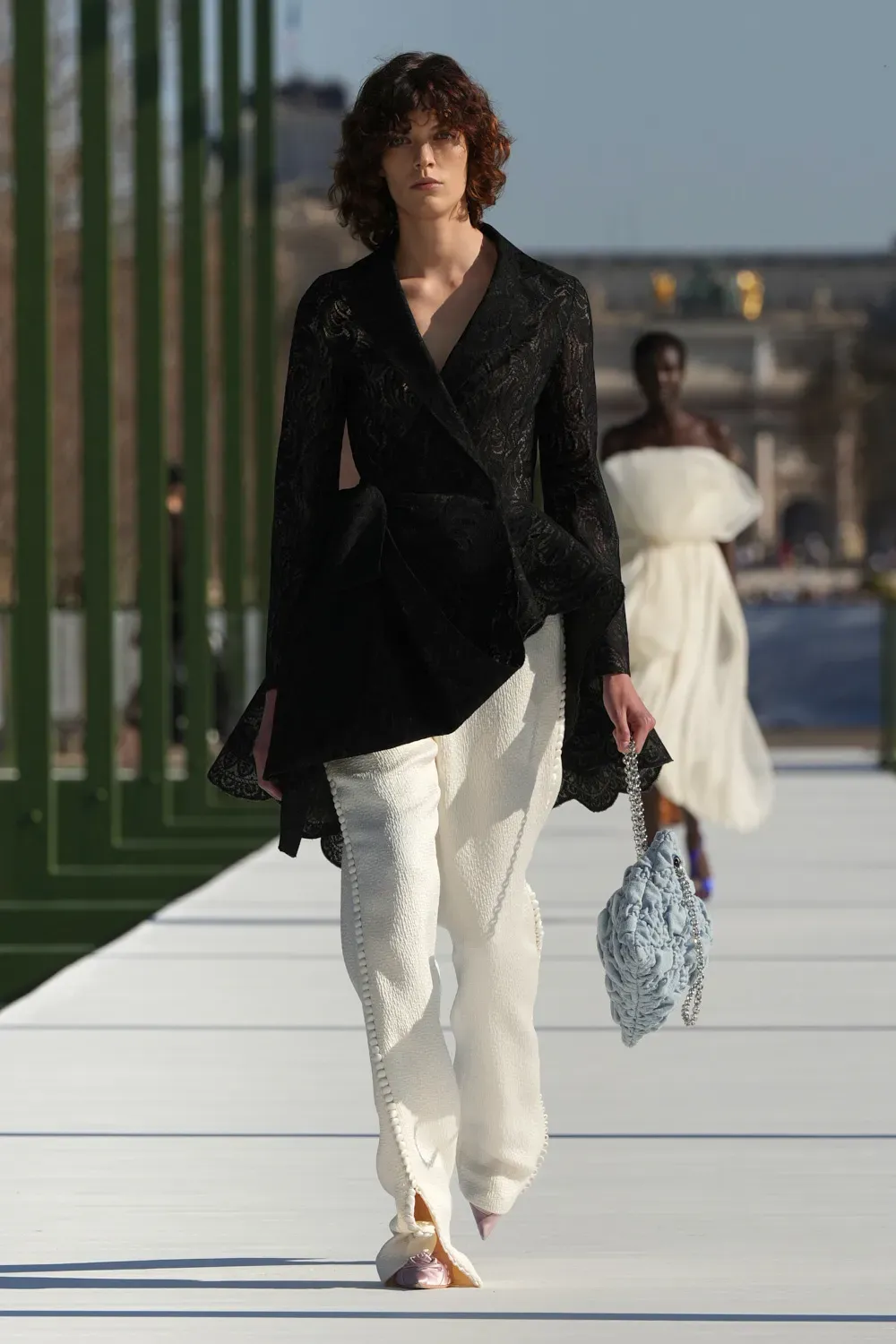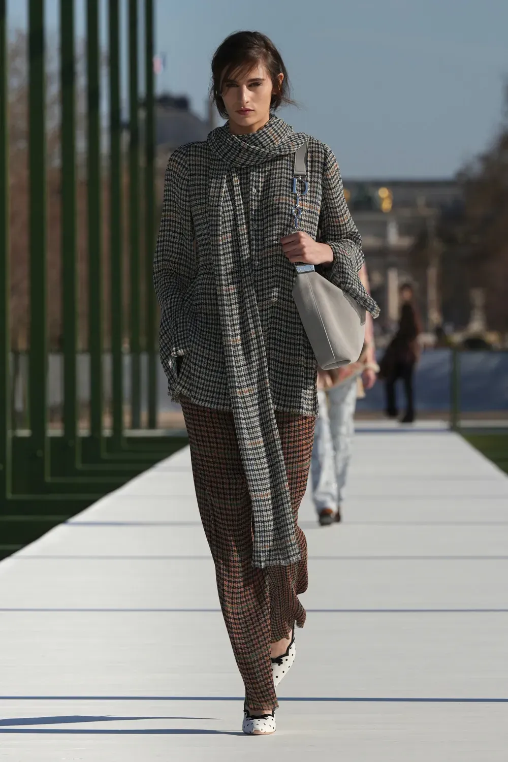 Al netto dei singoli capi e della loro costruzione più o meno anti-convenzionale, un altro elemento molto più a fuoco in questa collezione che nelle precedenti è l’archetipo della nuova donna Dior che, lungi dallo stare vestita in crinoline come una dama d’altri tempi, ha un guardaroba pensato per la vita contemporanea, anche se non estraneo a certe seduzioni nostalgiche per l’antica aristocrazia francese. È una donna indubbiamente elegante, che apprezza le proprie giacche squisite, le proprie opulente camicie di seta e ha un senso semplice del vestire con abiti che però sono complicati. Nello scarto tra la semplicità della concezione e nella sofisticazione della costruzione si può misurare l’originalità di spirito, oltre che l’eleganza, della nuova donna Dior.
