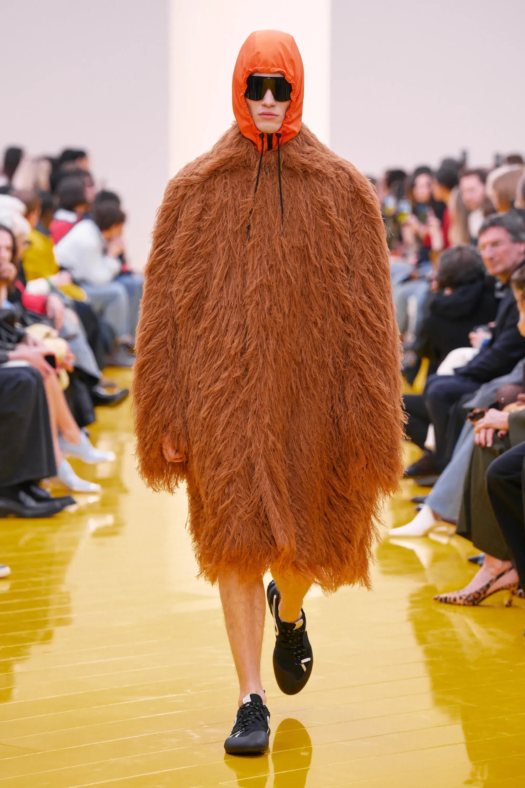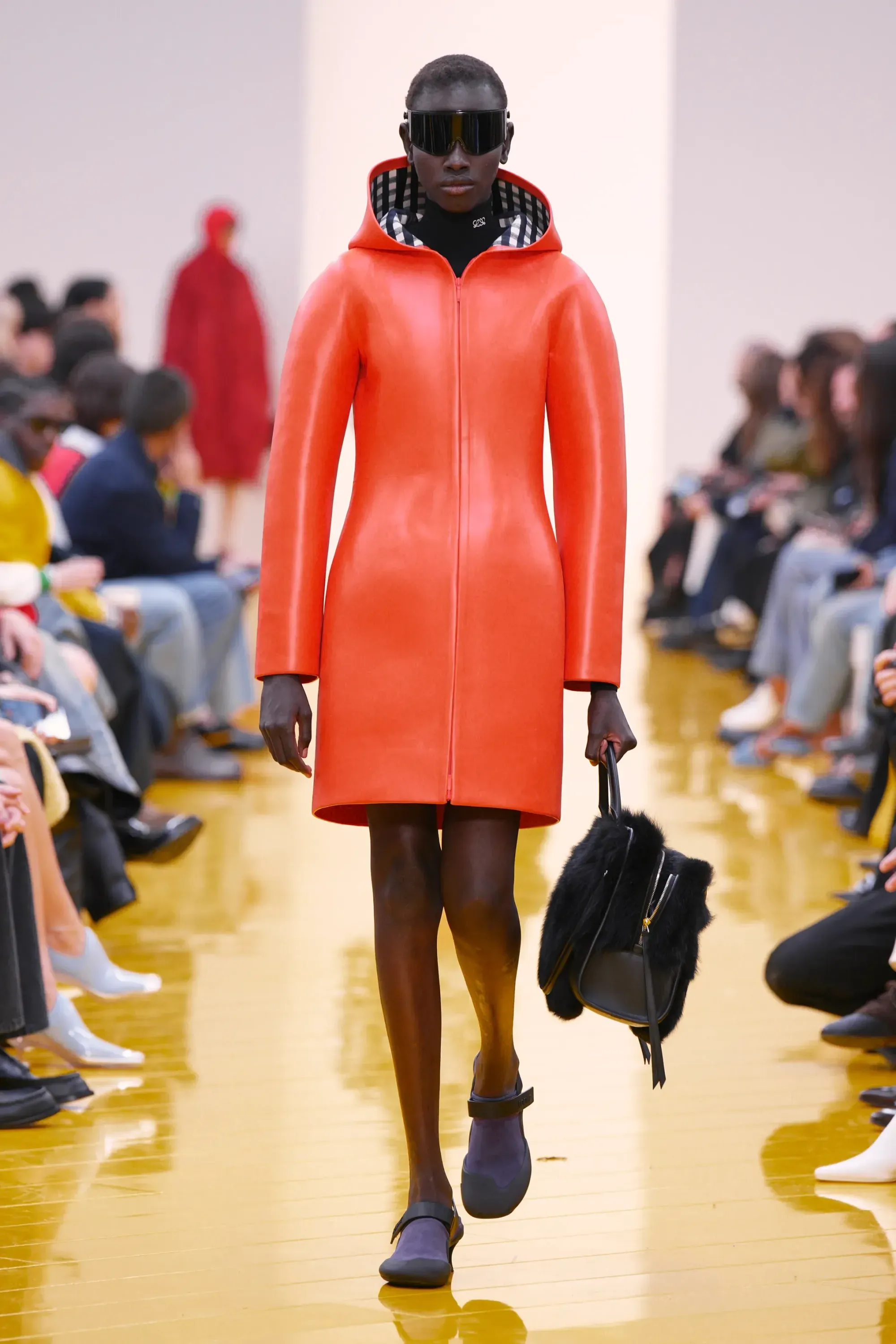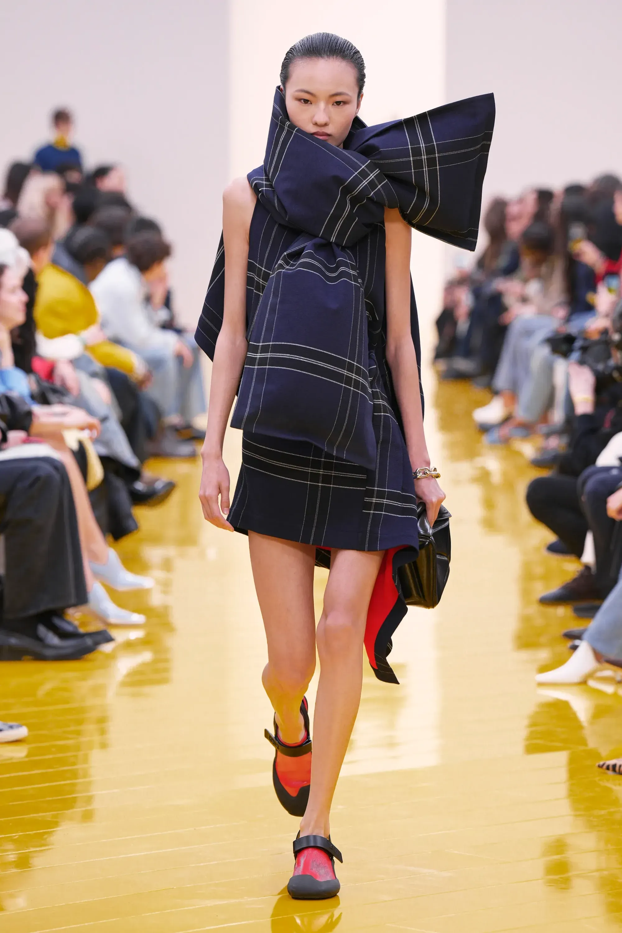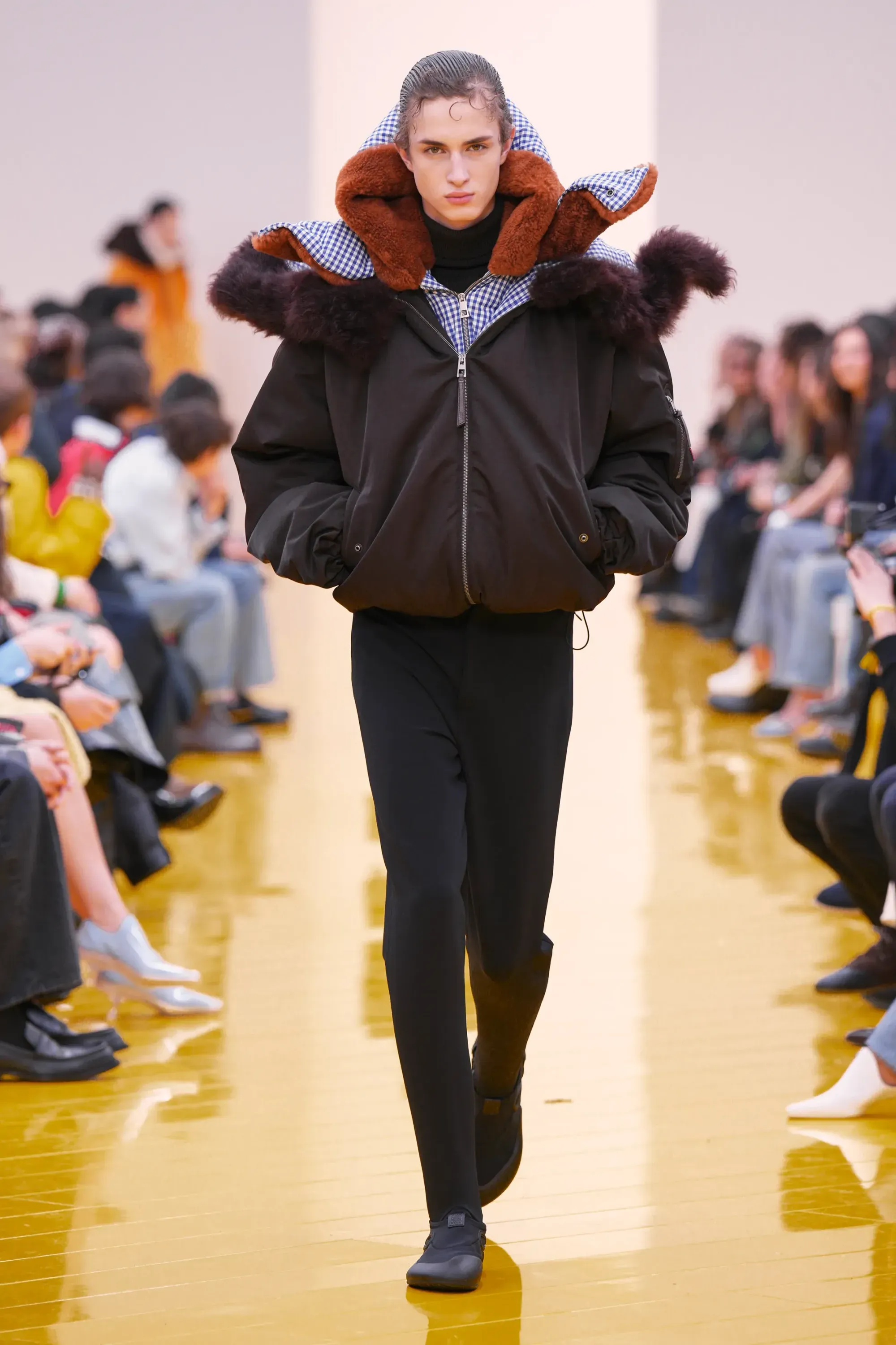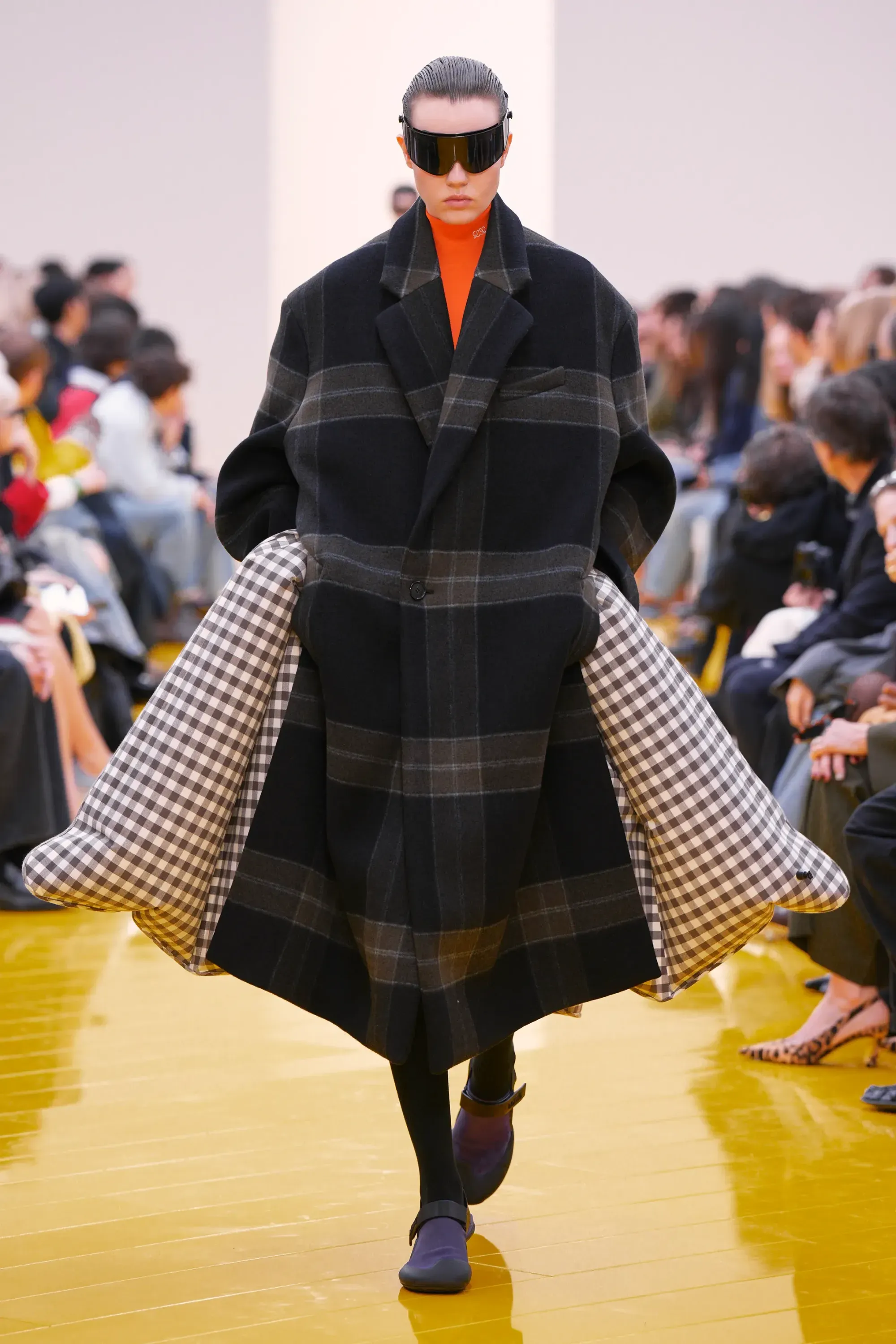 L’immaginario in cui ci si catapulta è quello di un nuovo gorp-core, con capispalla tecnici, occhiali a mascherina, décolleté che imitano la forma degli scarpini da bouldering e cappucci stretti abbinati però a lunghe e ampie pellicce, mini dress in tartan e leggings fluo. Le lavorazioni della pelle pressata, i volumi surreali e le forme morbide erano tutti presenti, eppure eseguiti in maniera piuttosto mediocre.