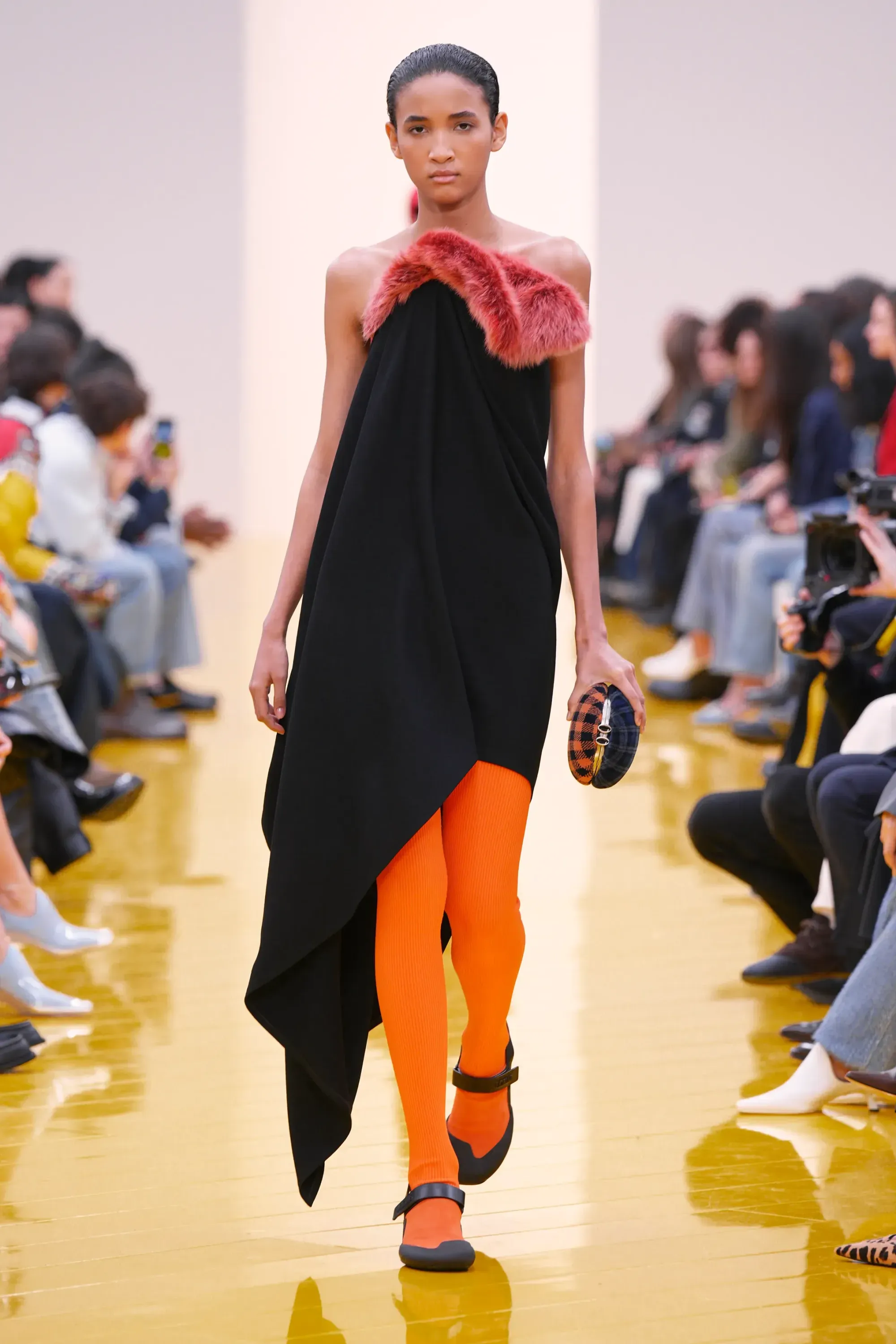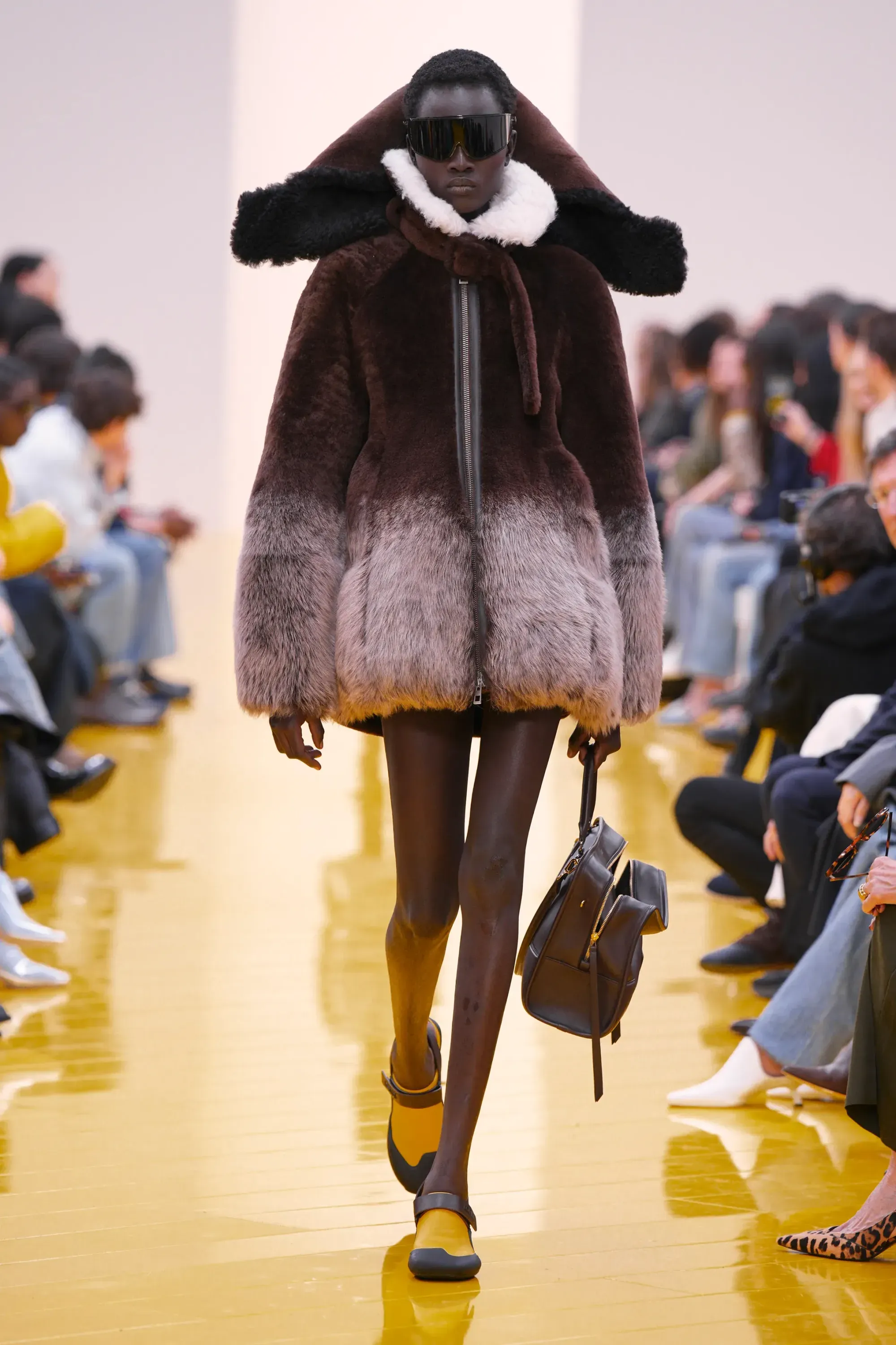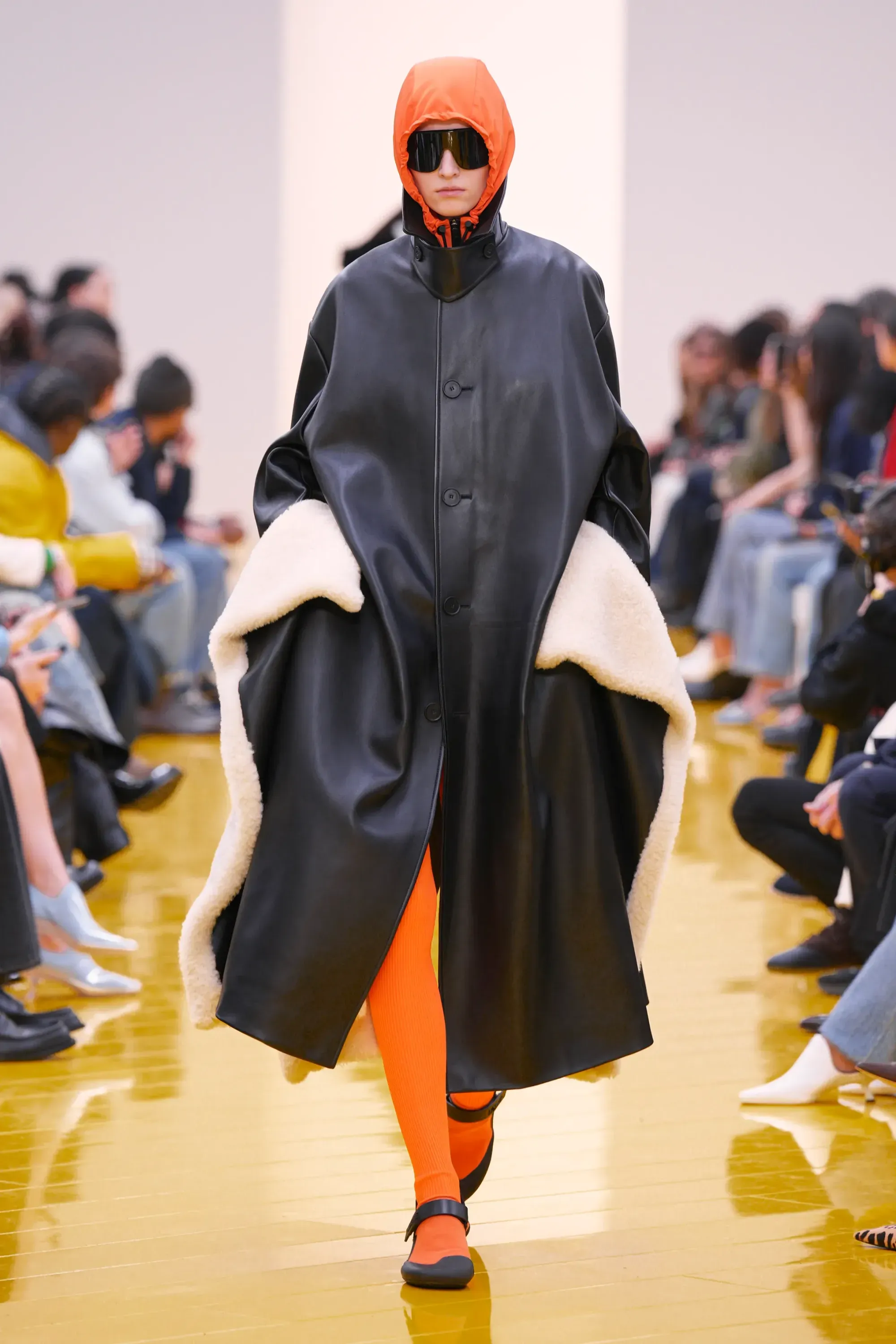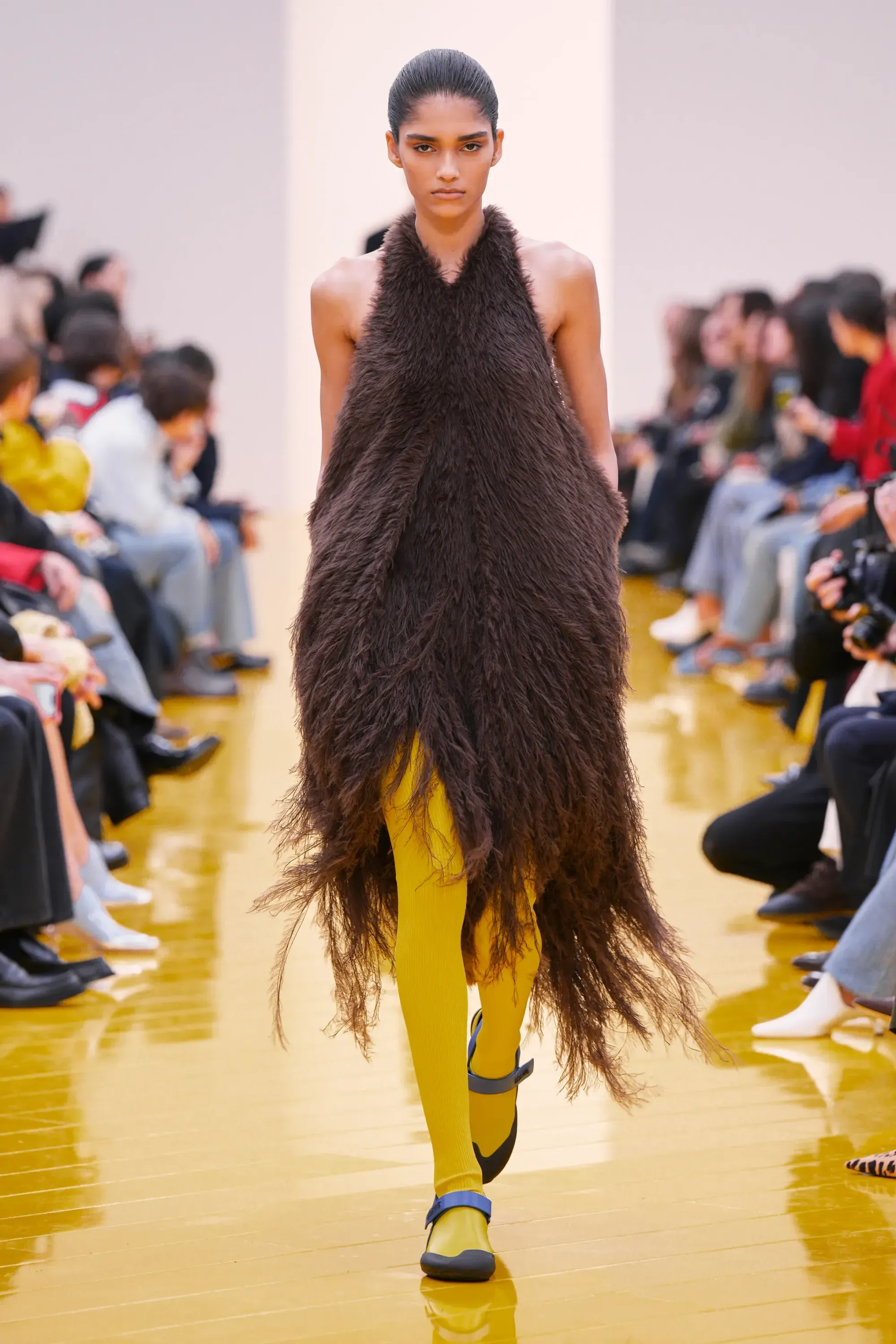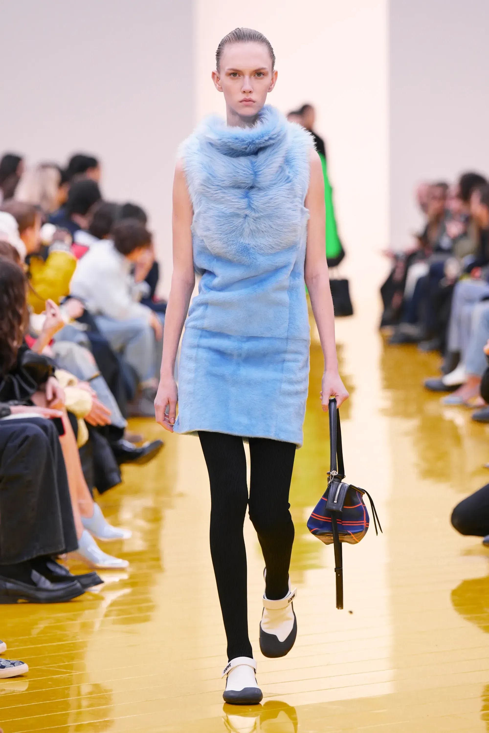 L’immaginario in cui ci si catapulta è quello di un nuovo gorp-core, con capispalla tecnici, occhiali a mascherina, décolleté che imitano la forma degli scarpini da bouldering e cappucci stretti abbinati però a lunghe e ampie pellicce, mini dress in tartan e leggings fluo. Le lavorazioni della pelle pressata, i volumi surreali e le forme morbide erano tutti presenti, eppure eseguiti in maniera piuttosto mediocre.