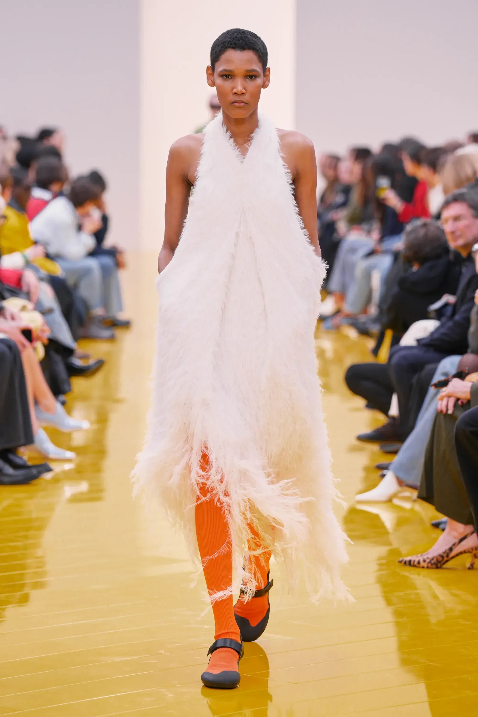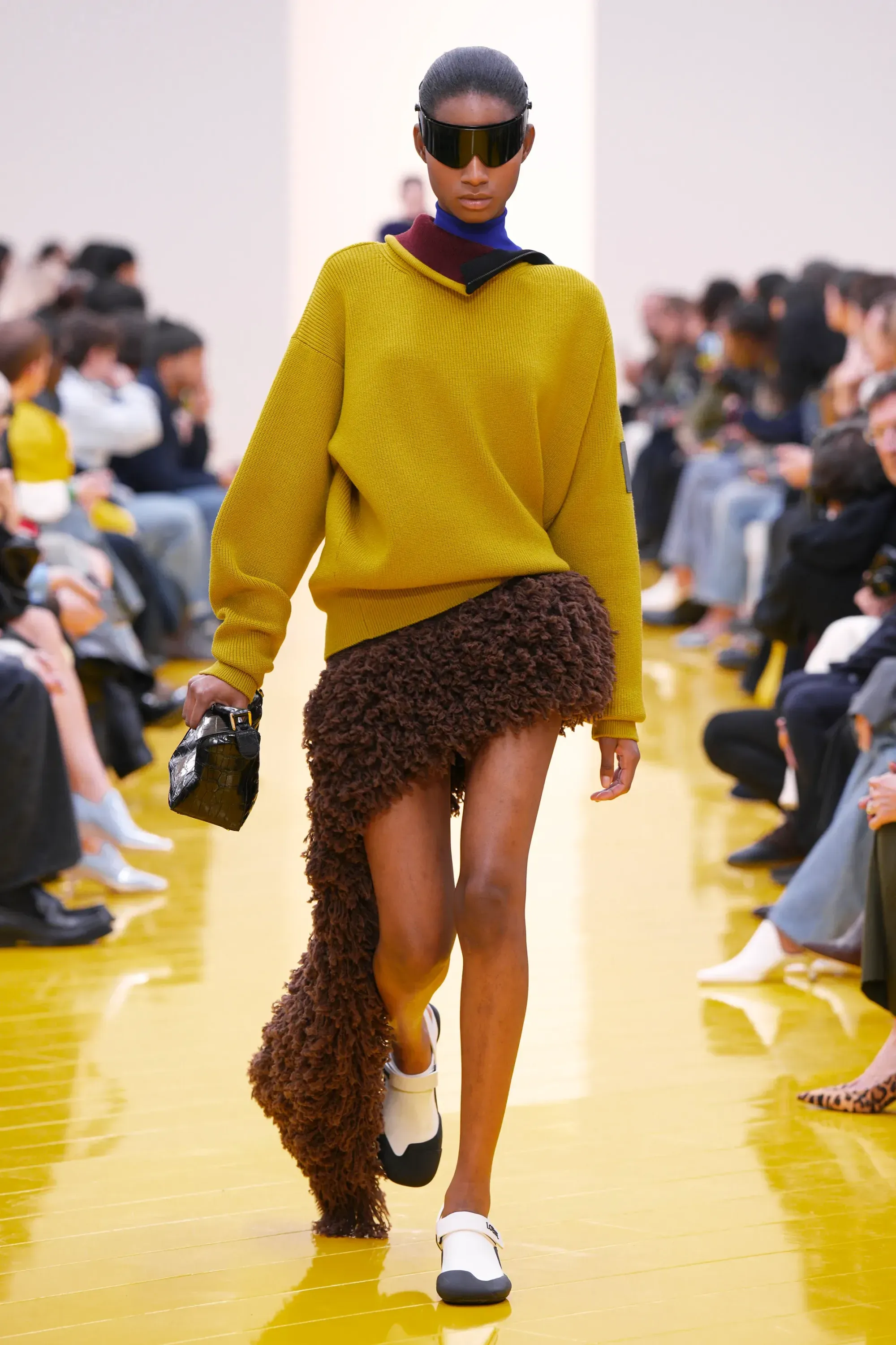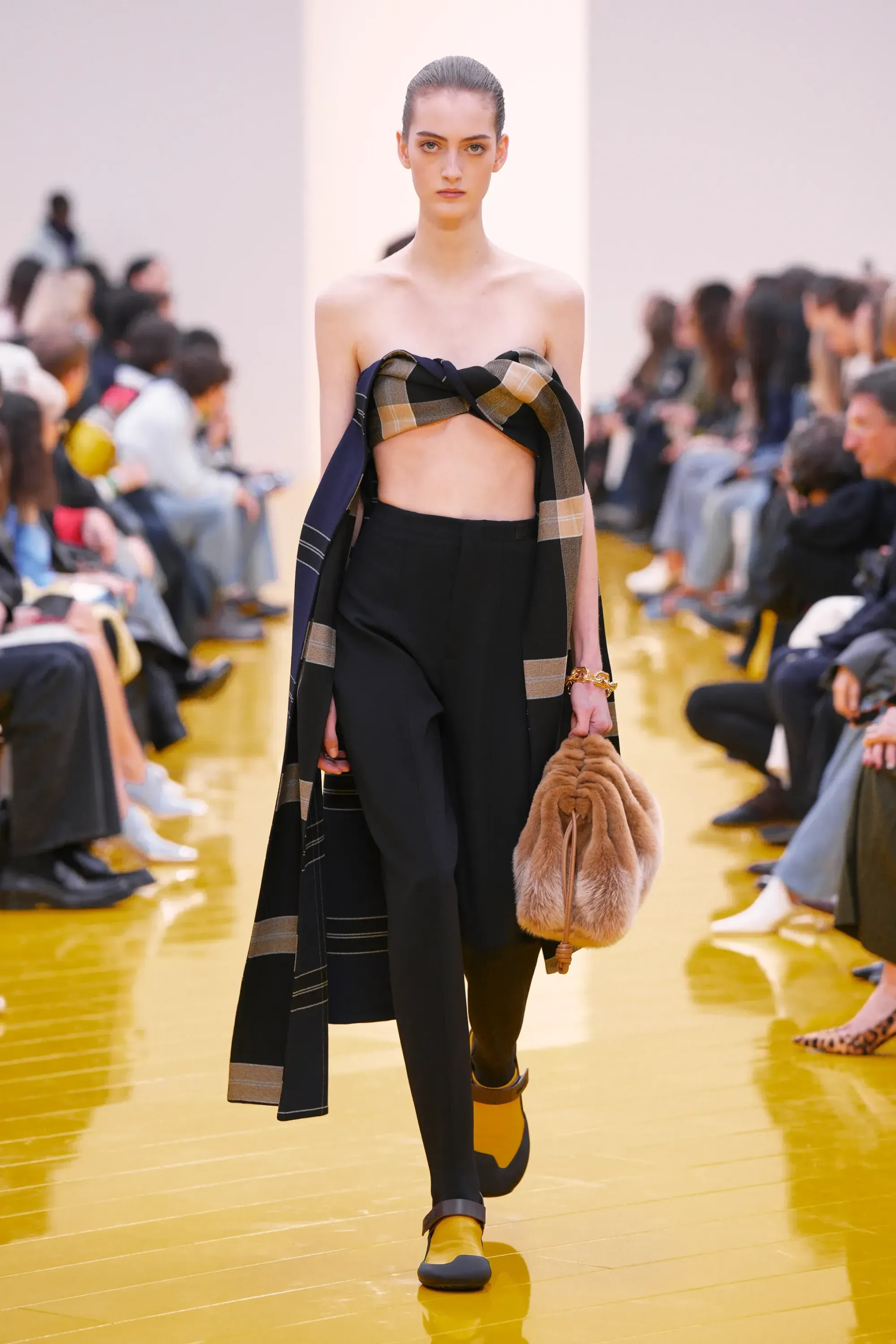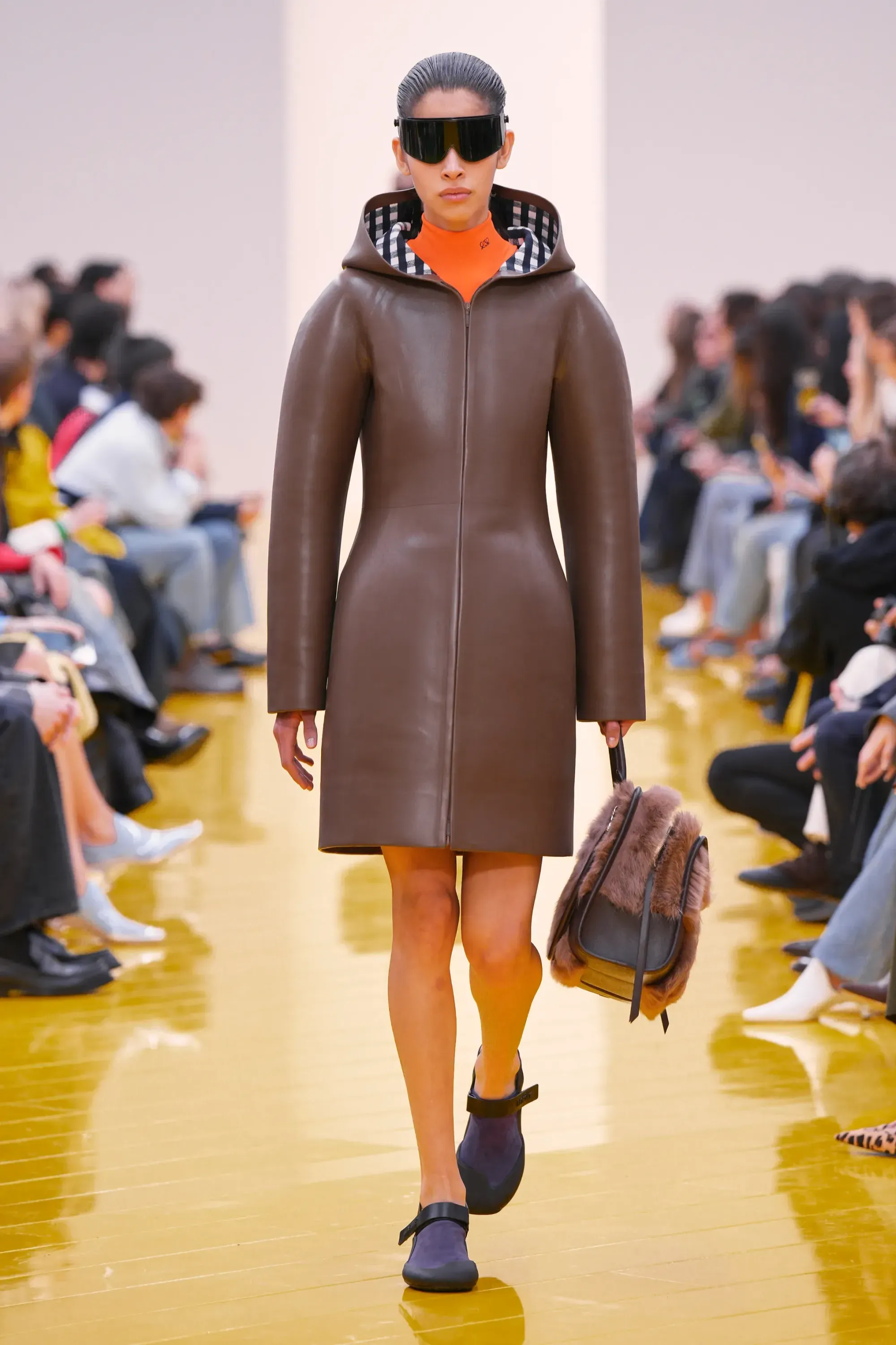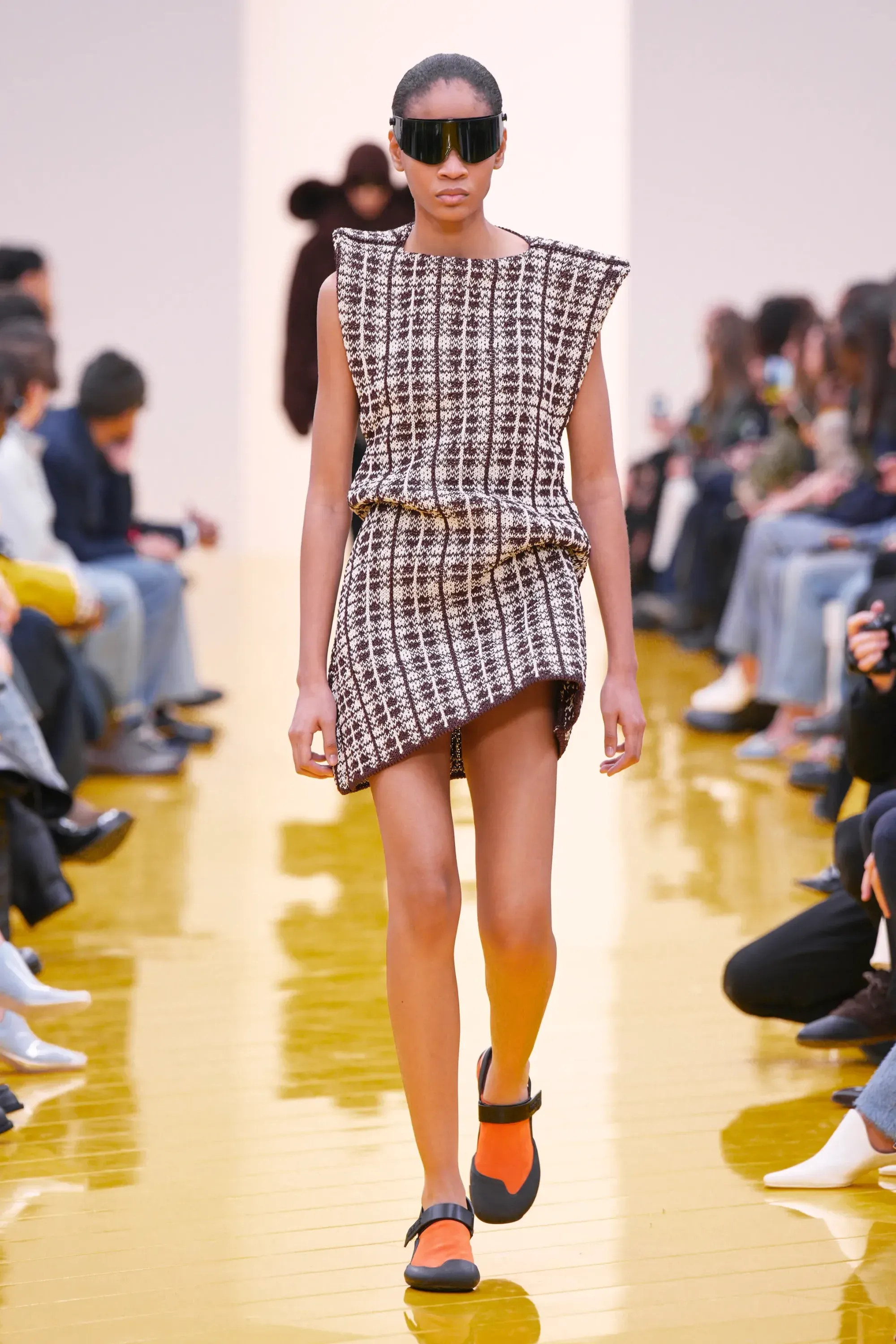 L’immaginario in cui ci si catapulta è quello di un nuovo gorp-core, con capispalla tecnici, occhiali a mascherina, décolleté che imitano la forma degli scarpini da bouldering e cappucci stretti abbinati però a lunghe e ampie pellicce, mini dress in tartan e leggings fluo. Le lavorazioni della pelle pressata, i volumi surreali e le forme morbide erano tutti presenti, eppure eseguiti in maniera piuttosto mediocre.