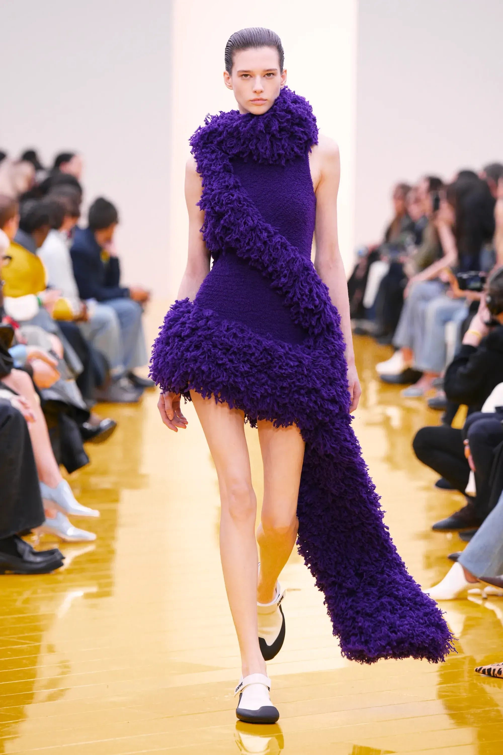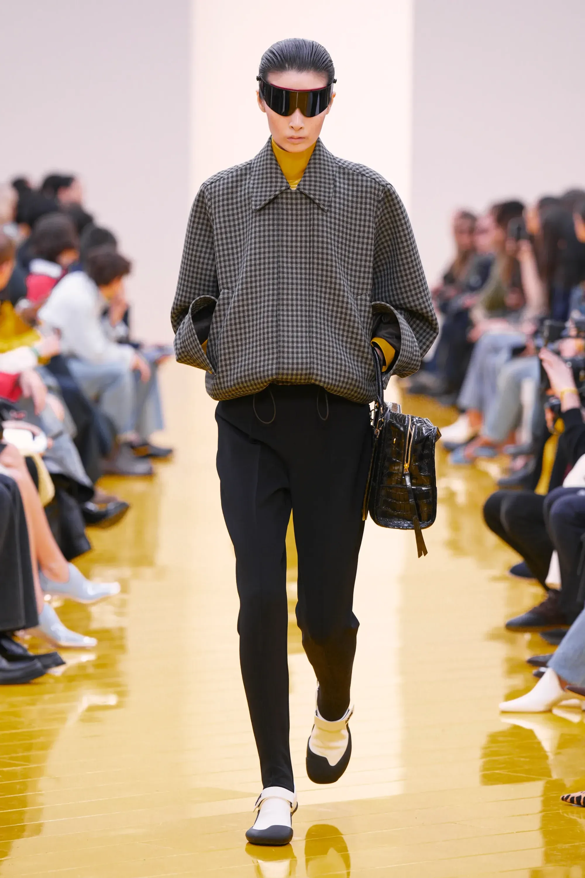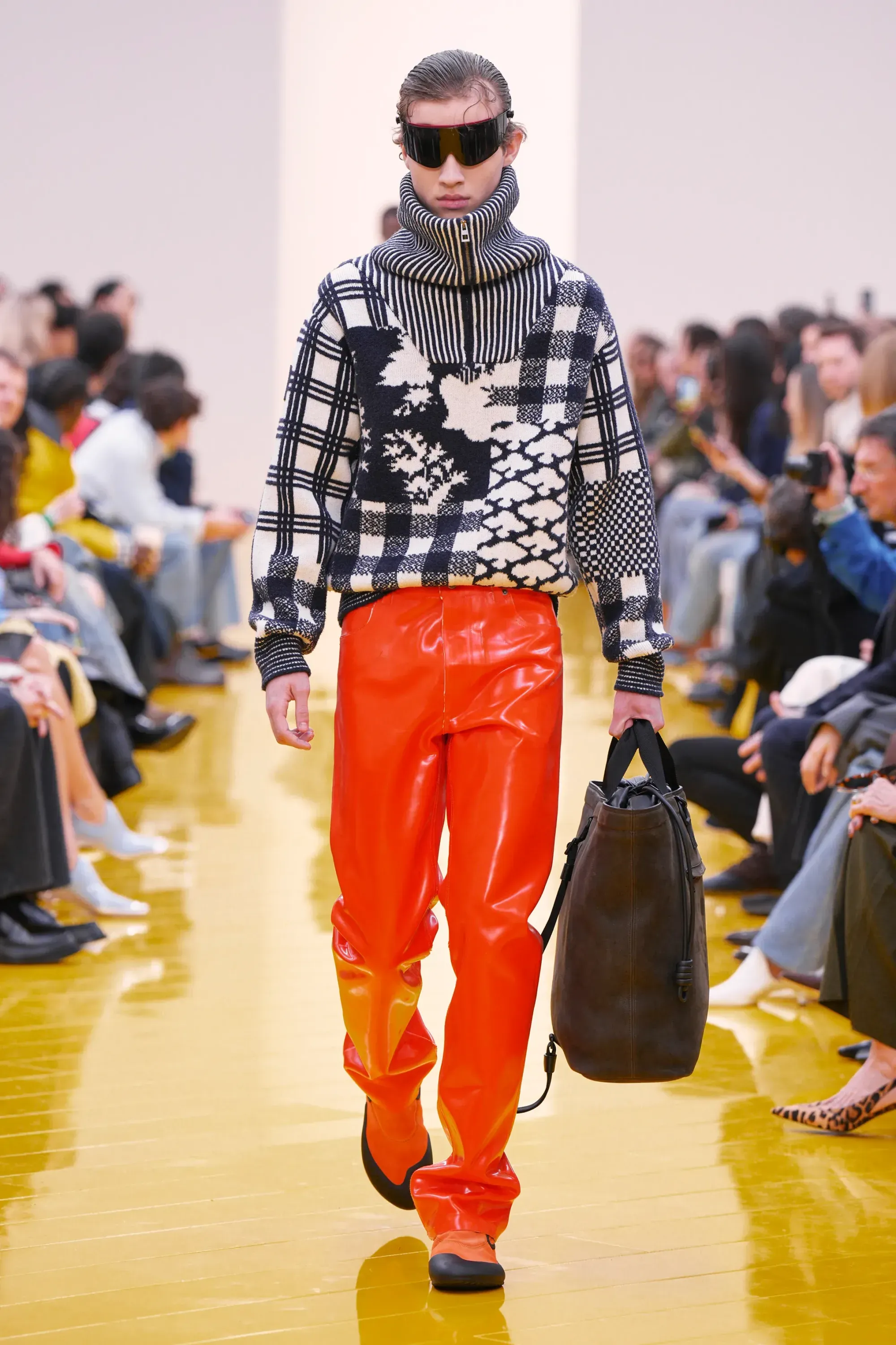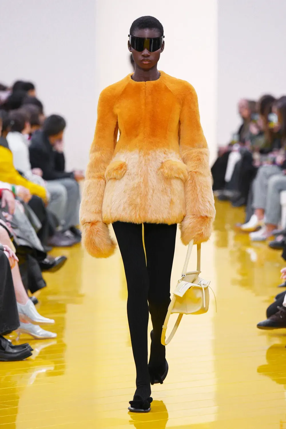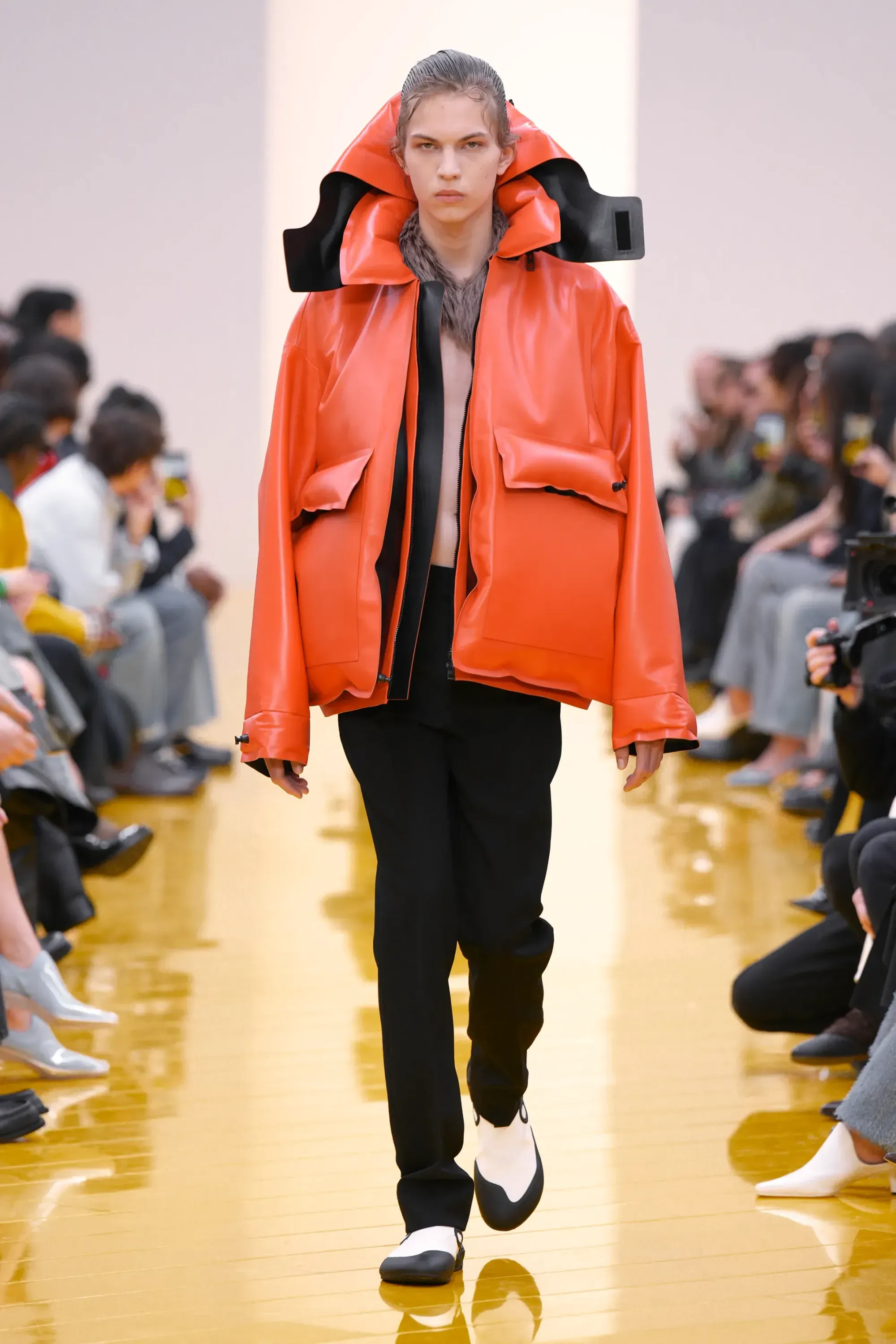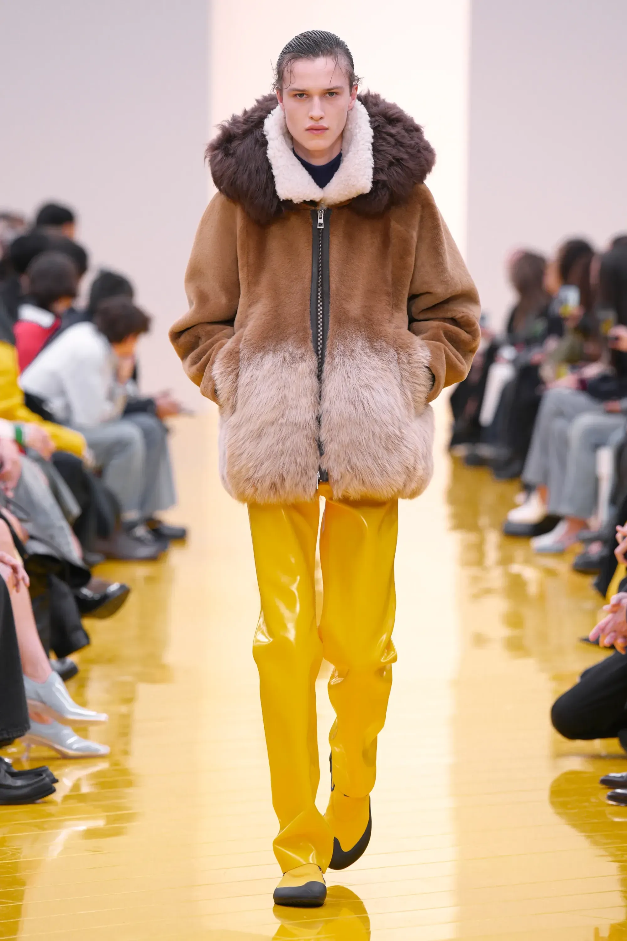 L’immaginario in cui ci si catapulta è quello di un nuovo gorp-core, con capispalla tecnici, occhiali a mascherina, décolleté che imitano la forma degli scarpini da bouldering e cappucci stretti abbinati però a lunghe e ampie pellicce, mini dress in tartan e leggings fluo. Le lavorazioni della pelle pressata, i volumi surreali e le forme morbide erano tutti presenti, eppure eseguiti in maniera piuttosto mediocre.
