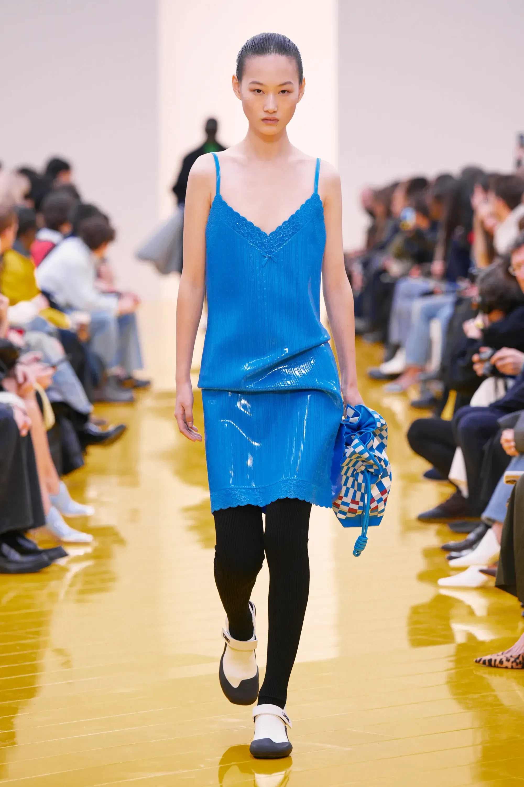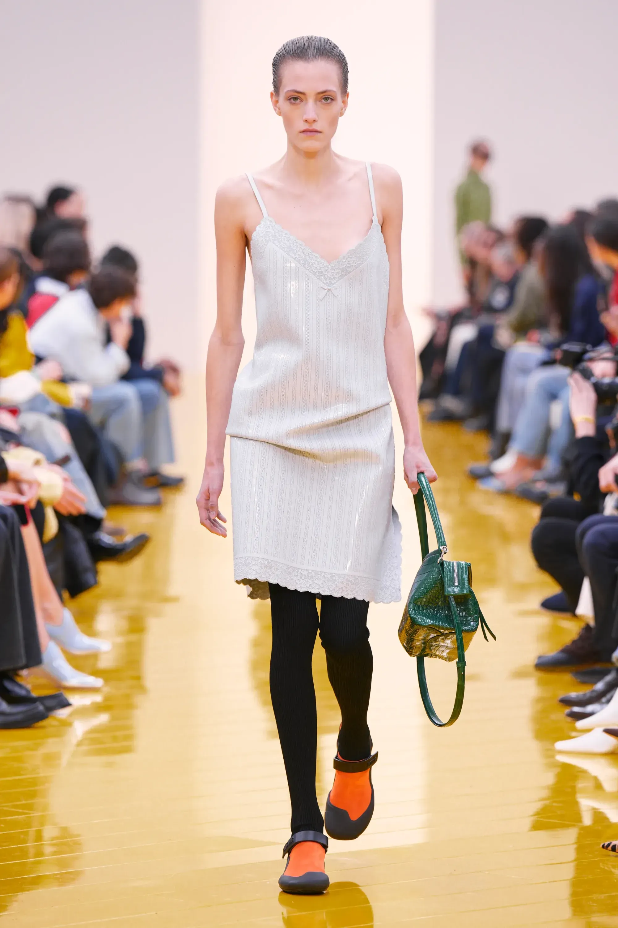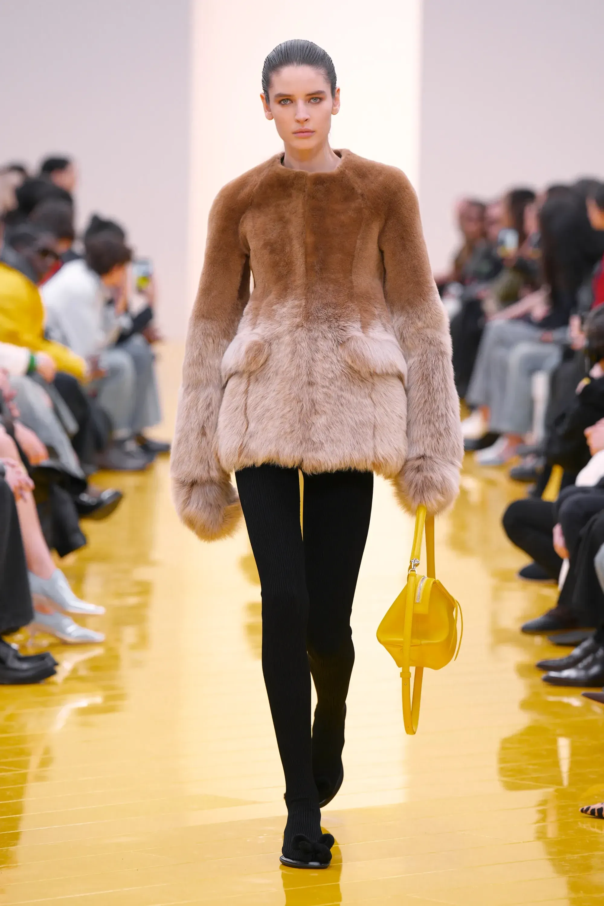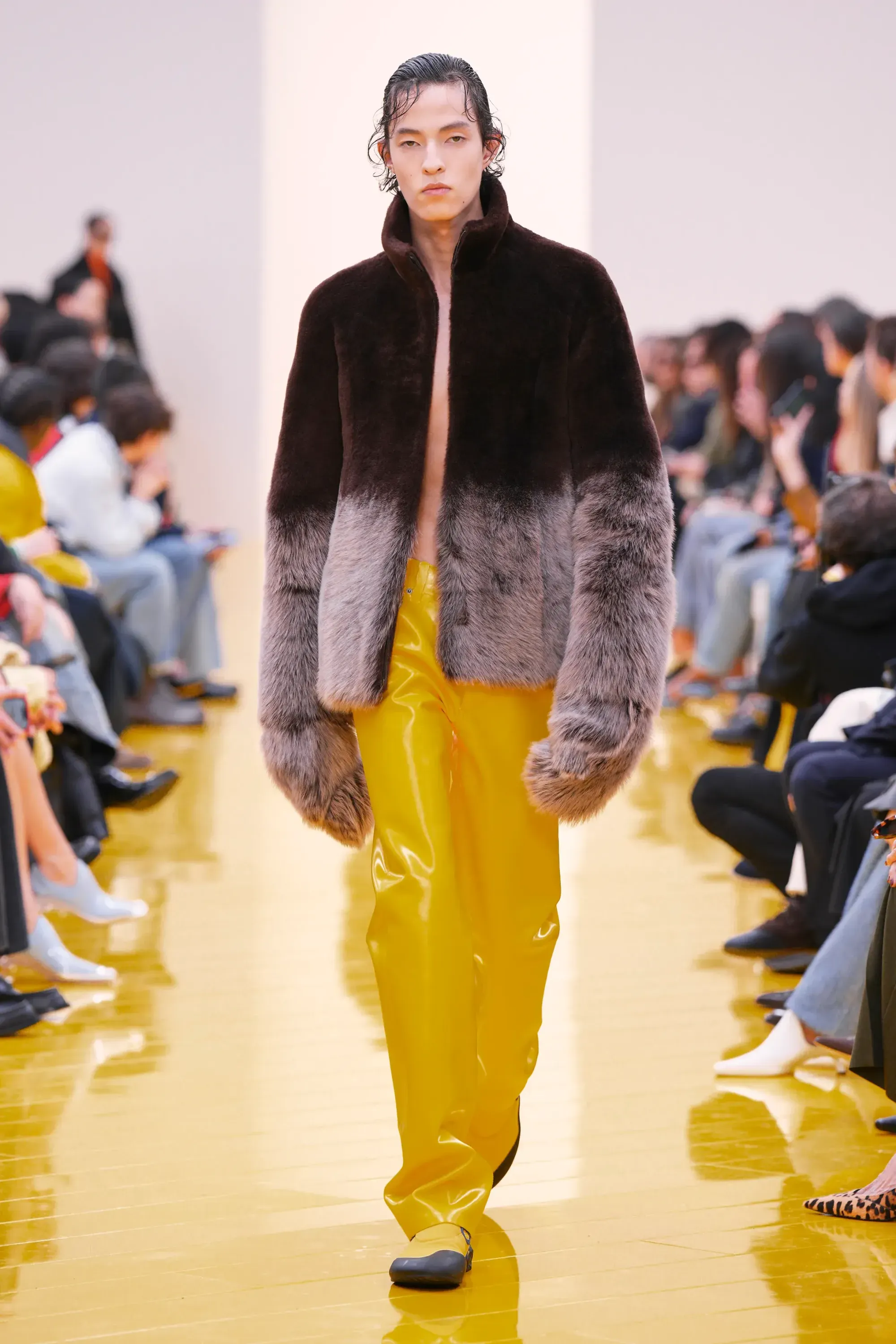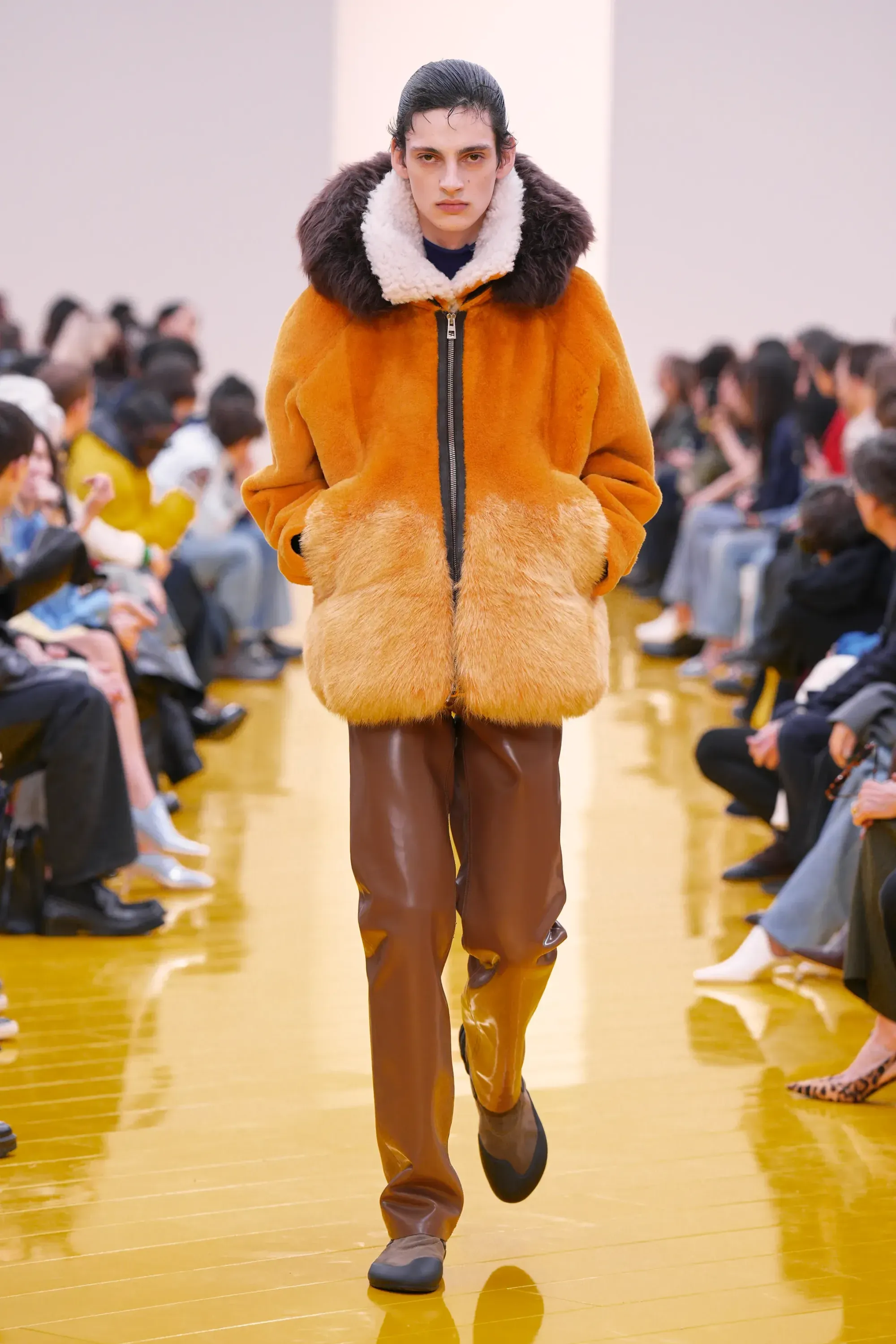 L’immaginario in cui ci si catapulta è quello di un nuovo gorp-core, con capispalla tecnici, occhiali a mascherina, décolleté che imitano la forma degli scarpini da bouldering e cappucci stretti abbinati però a lunghe e ampie pellicce, mini dress in tartan e leggings fluo. Le lavorazioni della pelle pressata, i volumi surreali e le forme morbide erano tutti presenti, eppure eseguiti in maniera piuttosto mediocre.