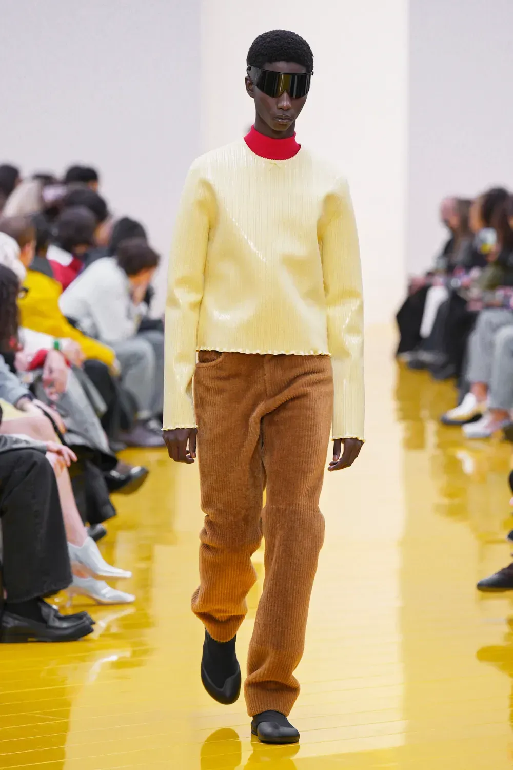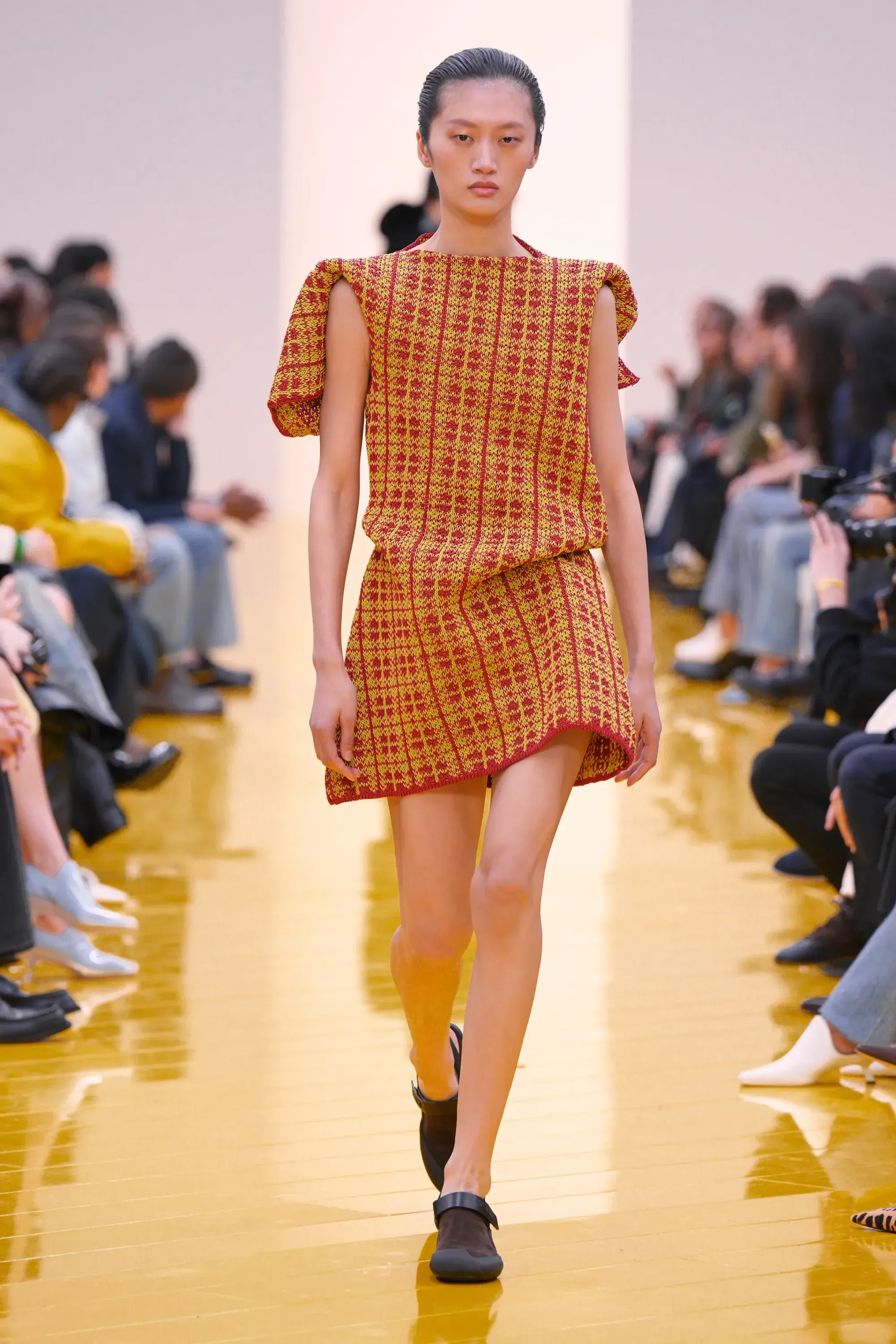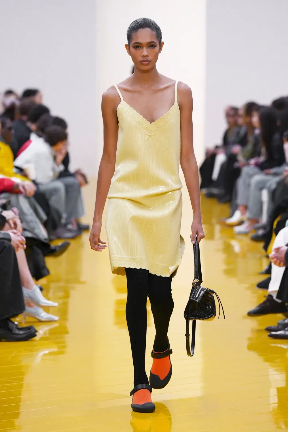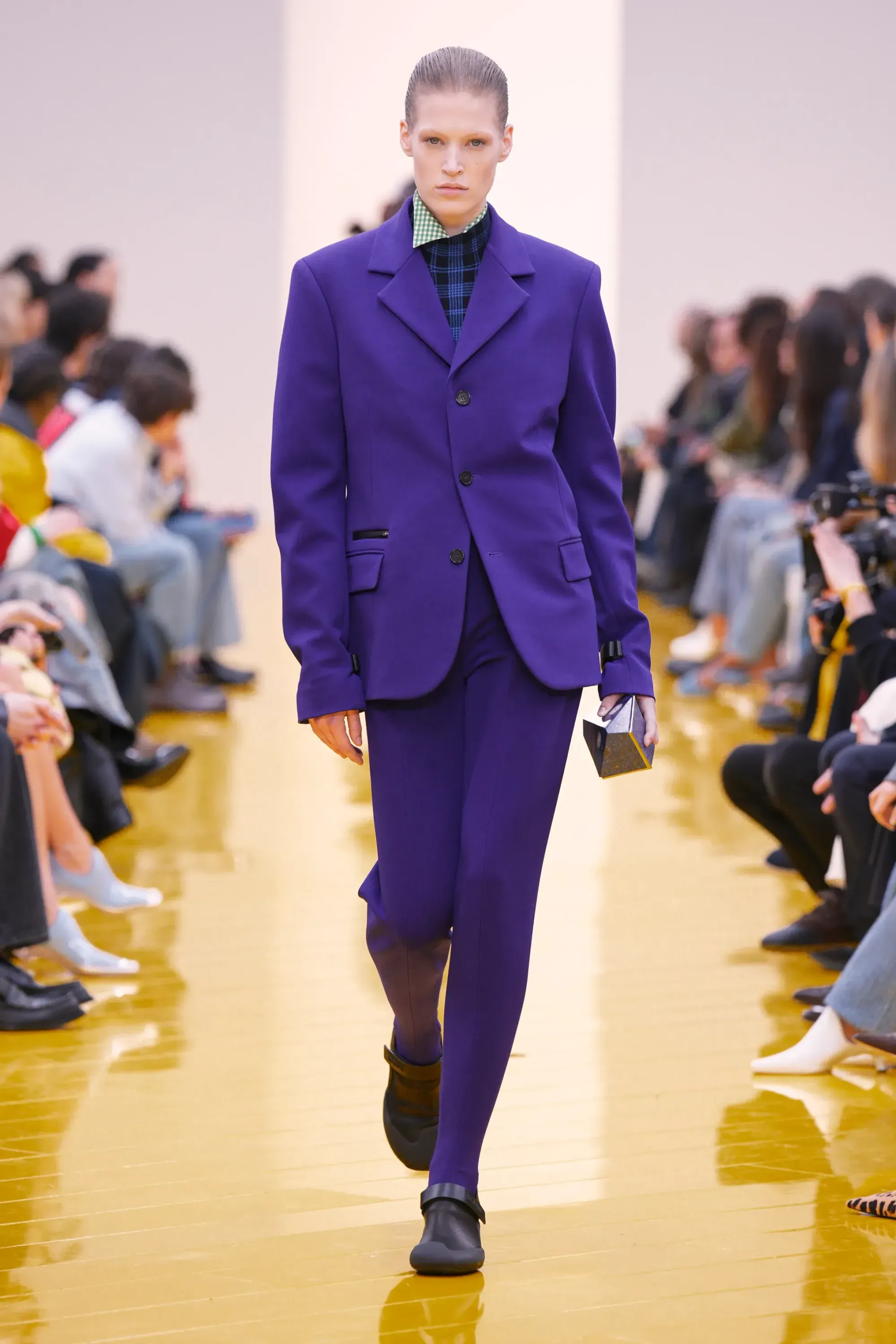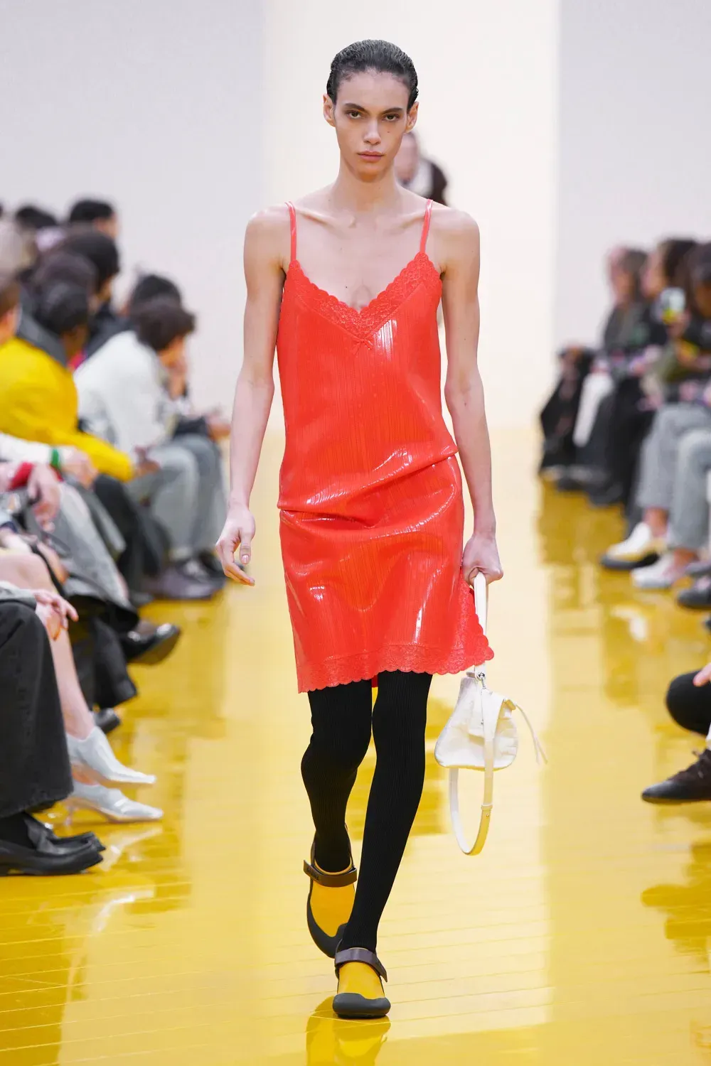 L’immaginario in cui ci si catapulta è quello di un nuovo gorp-core, con capispalla tecnici, occhiali a mascherina, décolleté che imitano la forma degli scarpini da bouldering e cappucci stretti abbinati però a lunghe e ampie pellicce, mini dress in tartan e leggings fluo. Le lavorazioni della pelle pressata, i volumi surreali e le forme morbide erano tutti presenti, eppure eseguiti in maniera piuttosto mediocre.