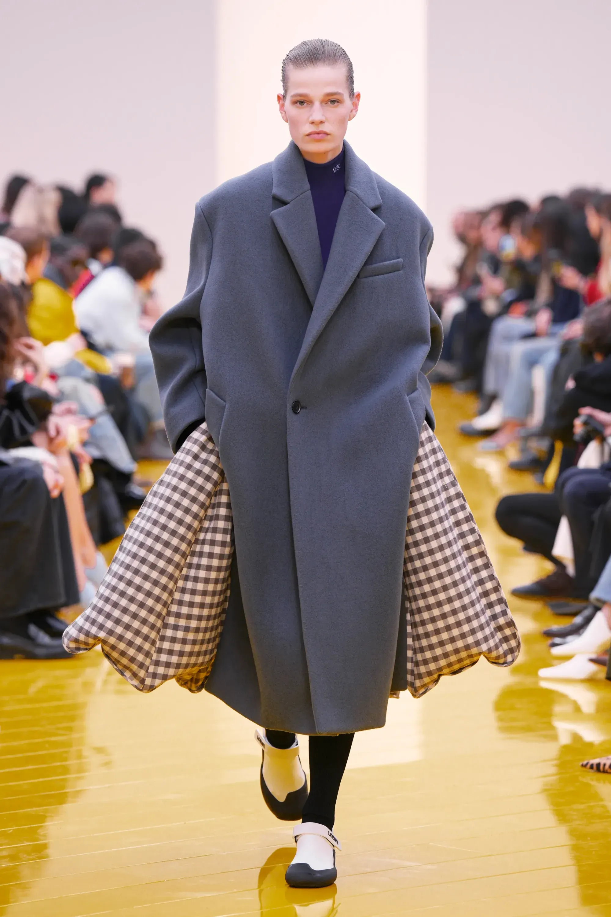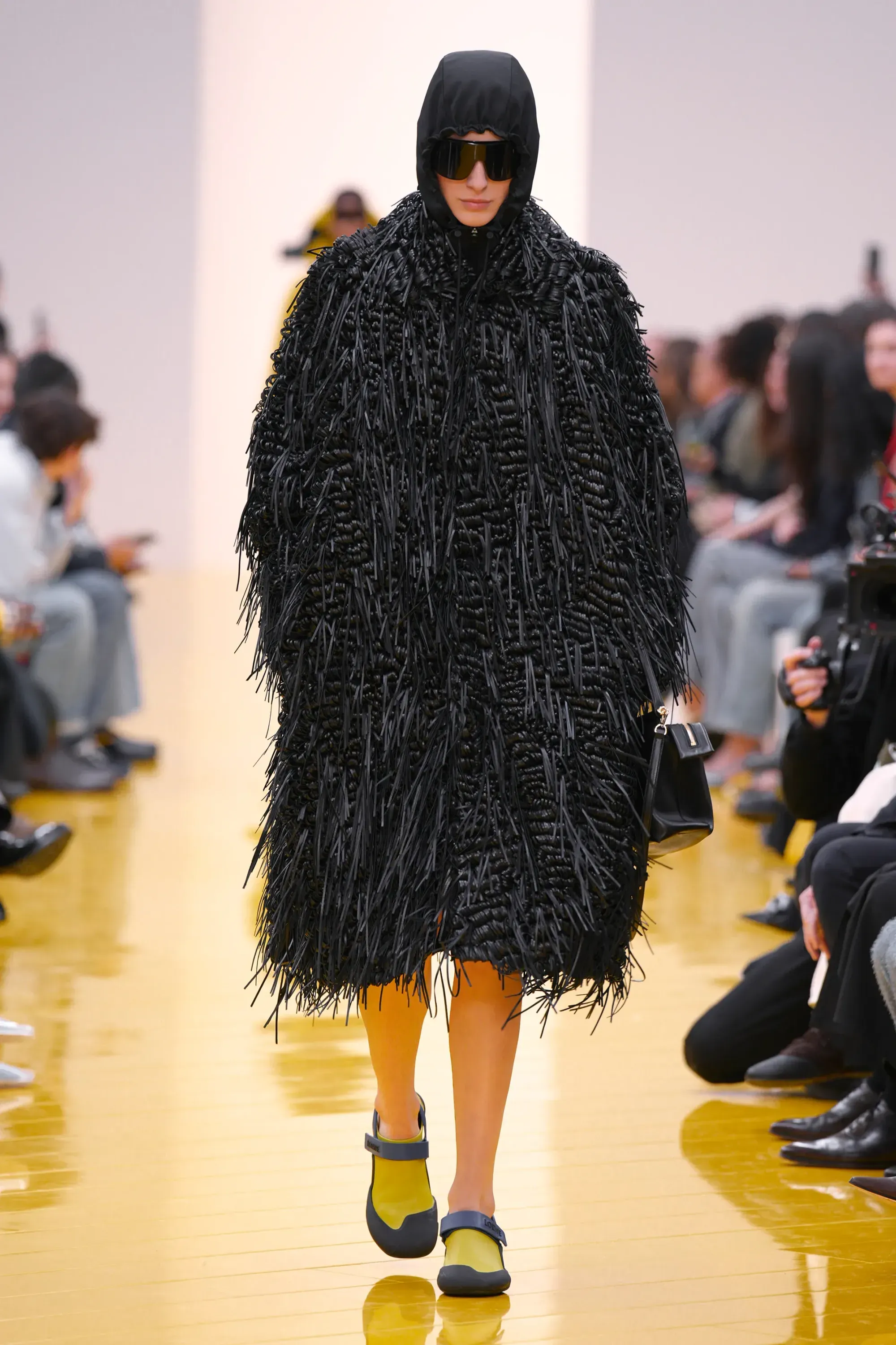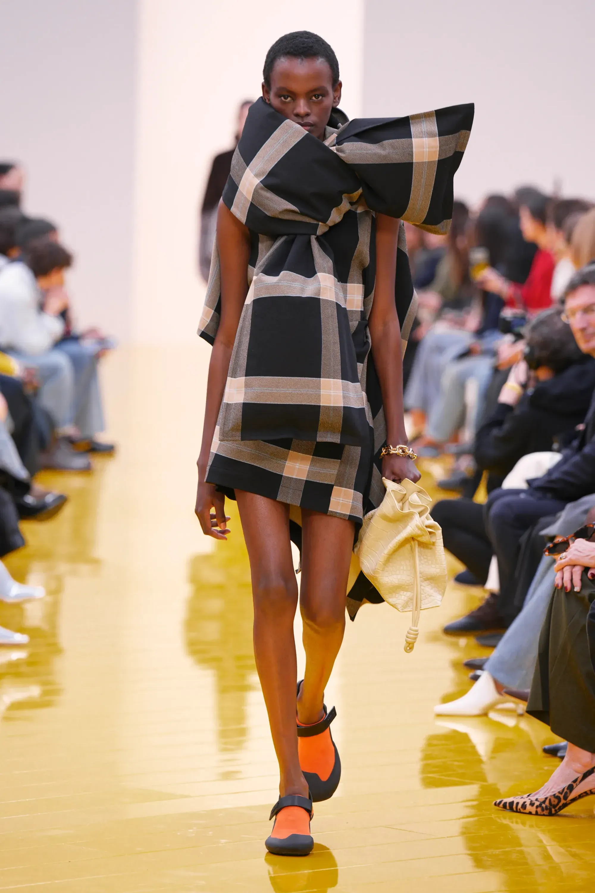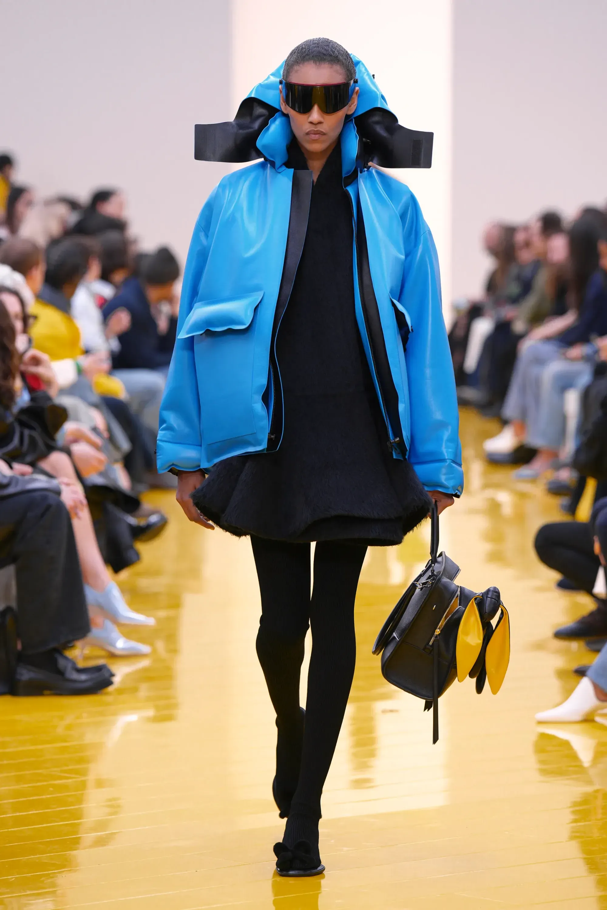 Perché in tutta la sfilata non c’è stato un momento disruptive alla Loewe (se non per delle scarpe a forma di cuscino), né nella collezione né negli accessori: è stato tutto, o quantomeno quasi, okay. Nessun pomodoro, nessuna rosa, nessun piccione, solo una sfilza di borse anonime ma comunque belle. Una continuità, forse troppo pesante, con la loro collezione di debutto. Stesso color-blocking, stesso gioco con i colletti lasciati per metà fuori, stessi cartamodelli per i vestiti drappeggiati, stesso layering per i cappucci. Va bene la signature, ma forse qui potremmo parlare quasi di pigrizia.