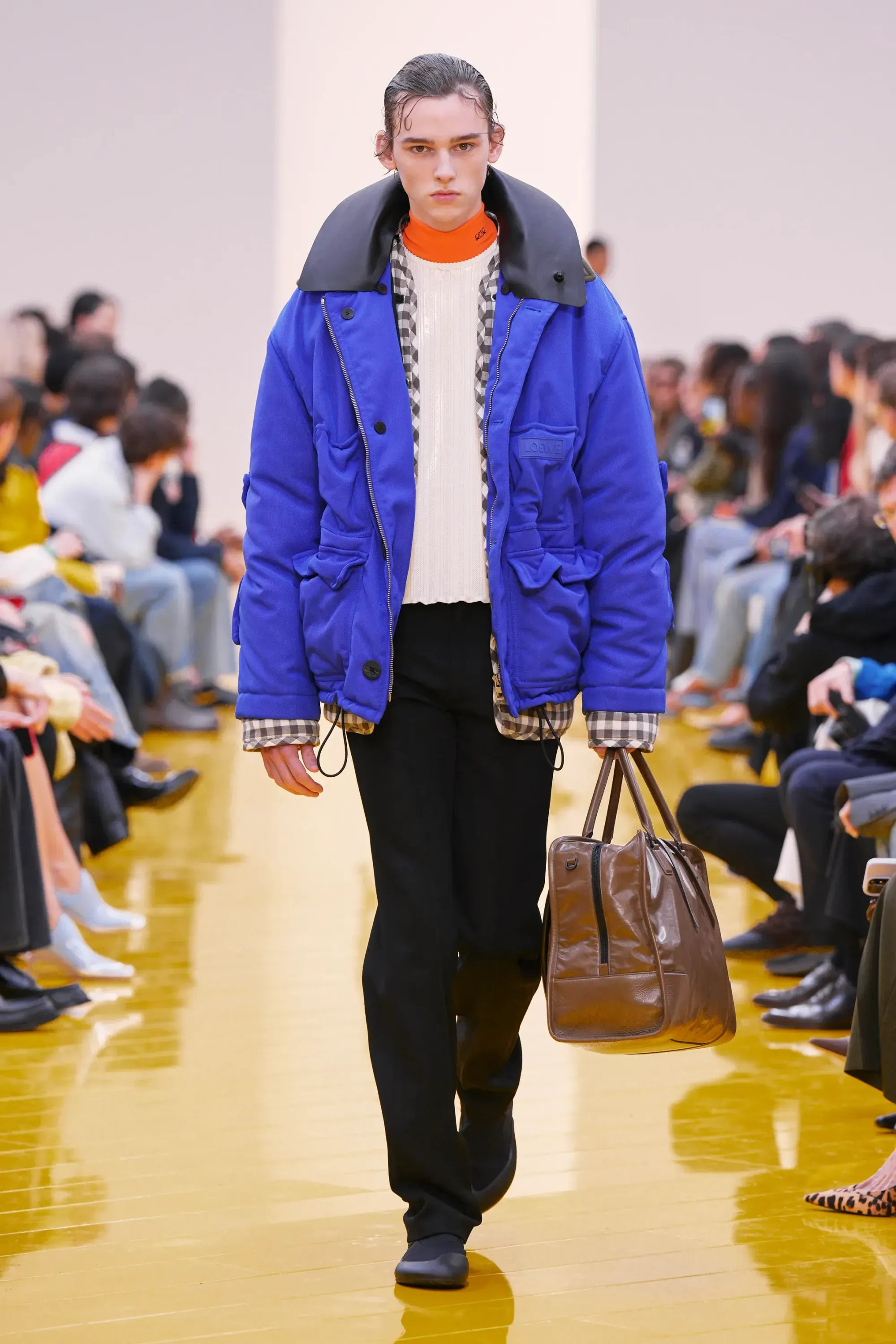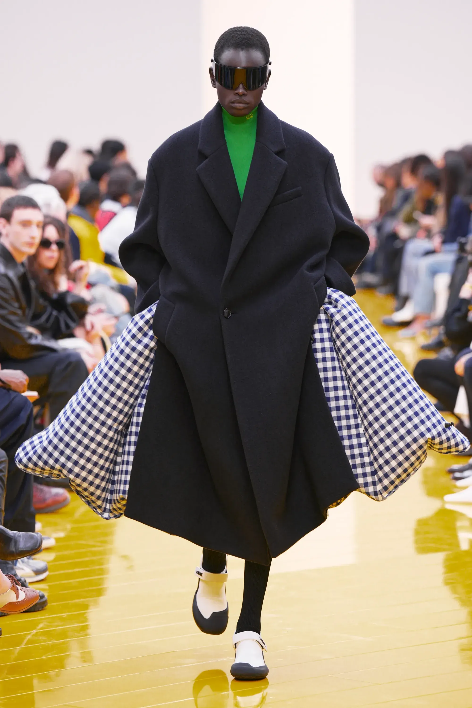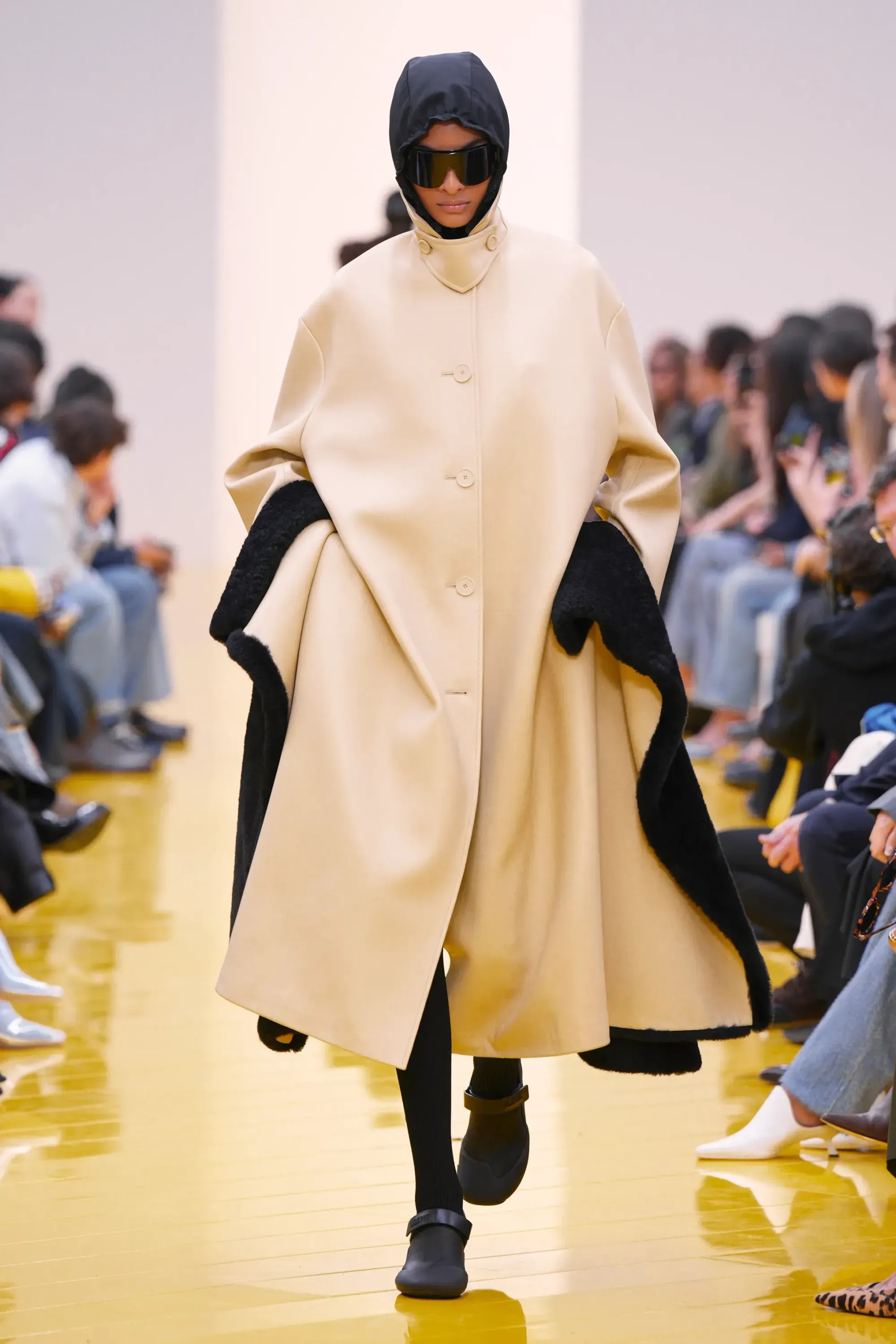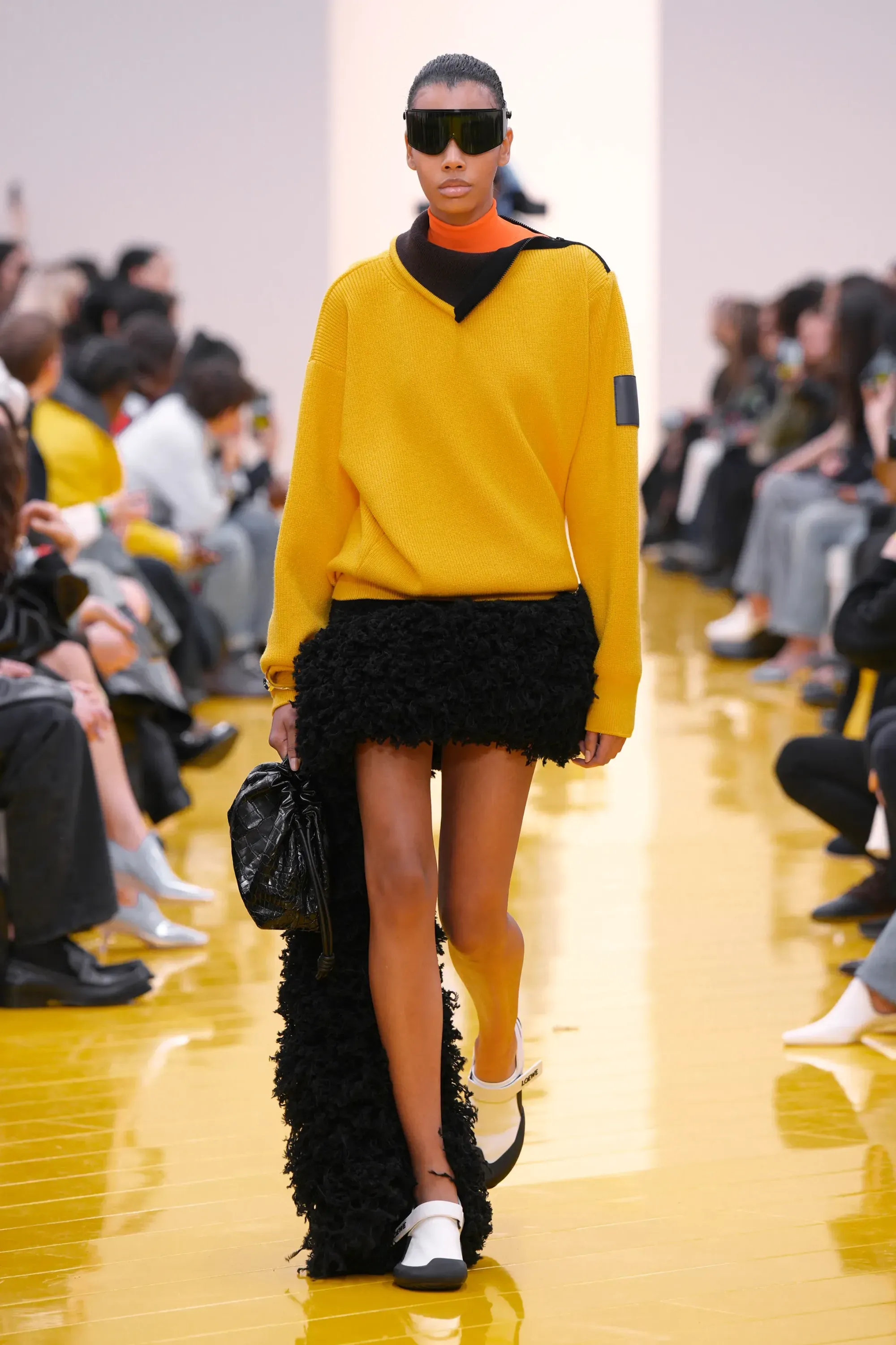 Perché in tutta la sfilata non c’è stato un momento disruptive alla Loewe (se non per delle scarpe a forma di cuscino), né nella collezione né negli accessori: è stato tutto, o quantomeno quasi, okay. Nessun pomodoro, nessuna rosa, nessun piccione, solo una sfilza di borse anonime ma comunque belle. Una continuità, forse troppo pesante, con la loro collezione di debutto. Stesso color-blocking, stesso gioco con i colletti lasciati per metà fuori, stessi cartamodelli per i vestiti drappeggiati, stesso layering per i cappucci. Va bene la signature, ma forse qui potremmo parlare quasi di pigrizia.