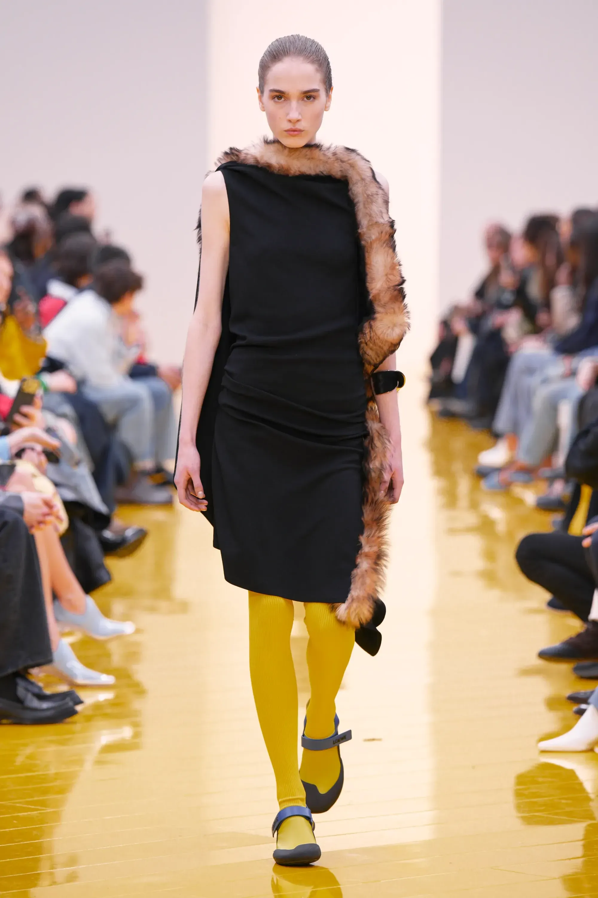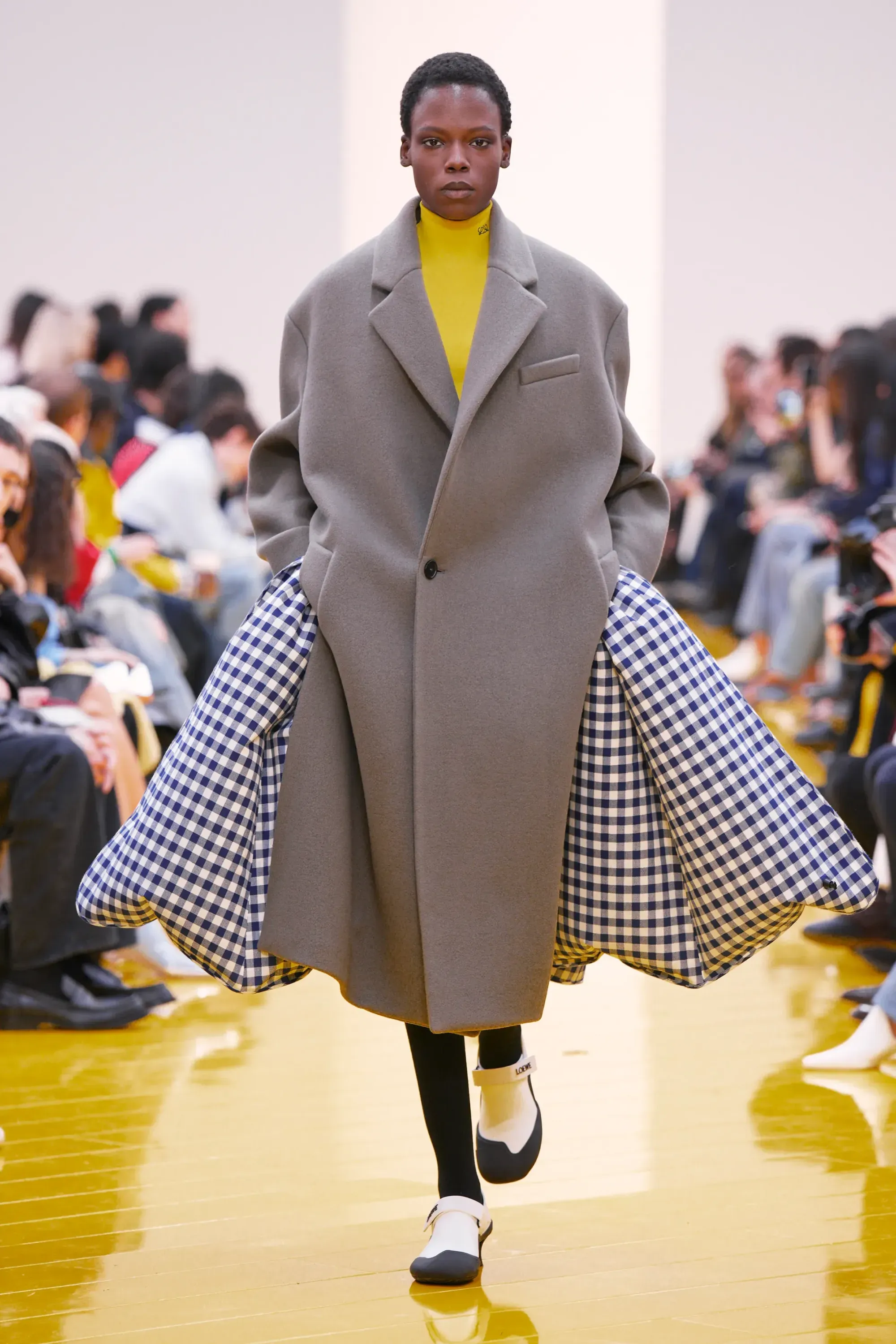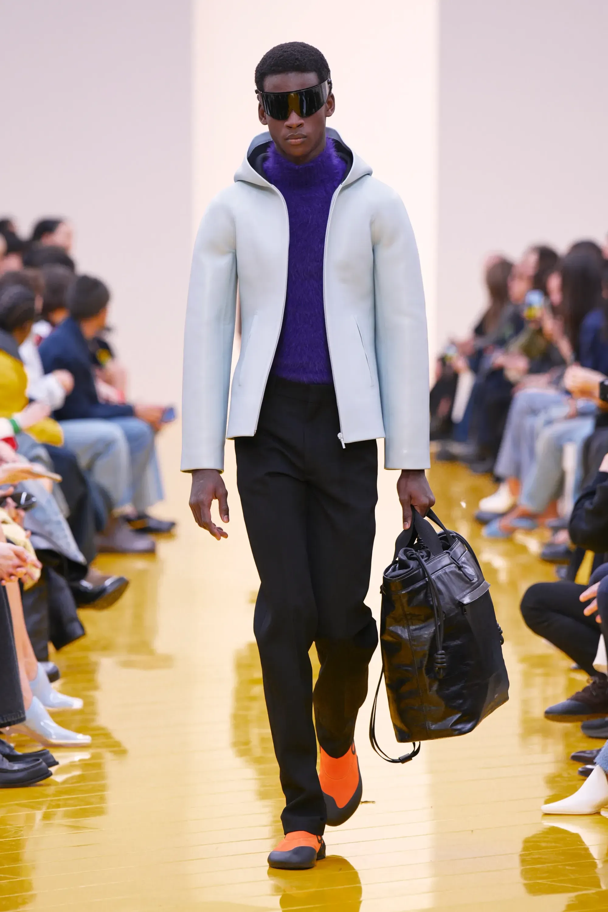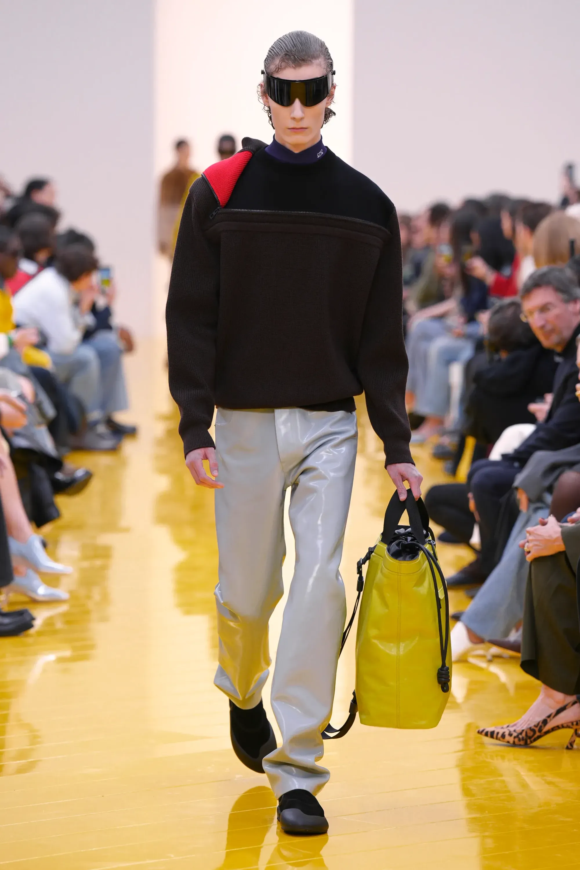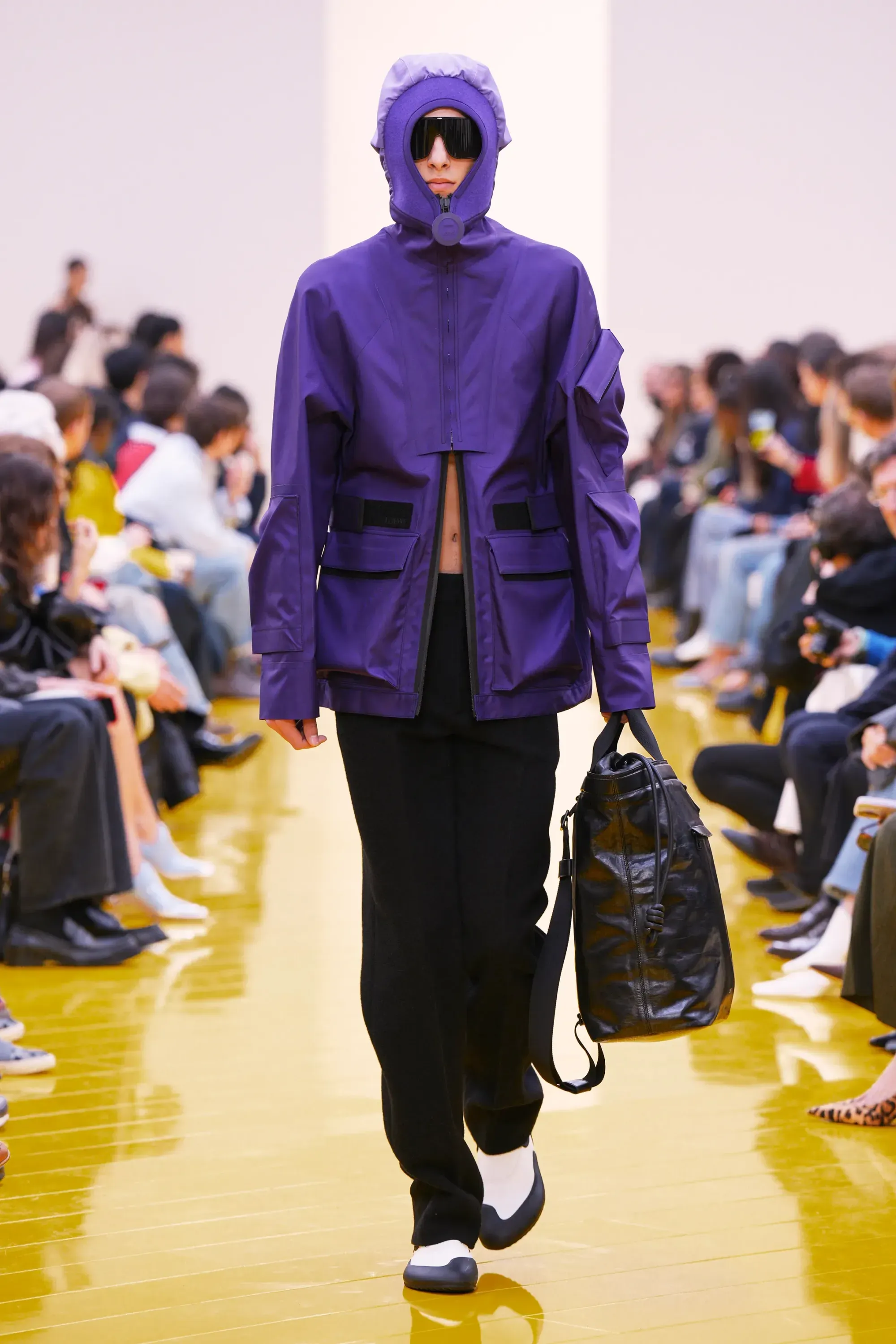 Perché in tutta la sfilata non c’è stato un momento disruptive alla Loewe (se non per delle scarpe a forma di cuscino), né nella collezione né negli accessori: è stato tutto, o quantomeno quasi, okay. Nessun pomodoro, nessuna rosa, nessun piccione, solo una sfilza di borse anonime ma comunque belle. Una continuità, forse troppo pesante, con la loro collezione di debutto. Stesso color-blocking, stesso gioco con i colletti lasciati per metà fuori, stessi cartamodelli per i vestiti drappeggiati, stesso layering per i cappucci. Va bene la signature, ma forse qui potremmo parlare quasi di pigrizia.