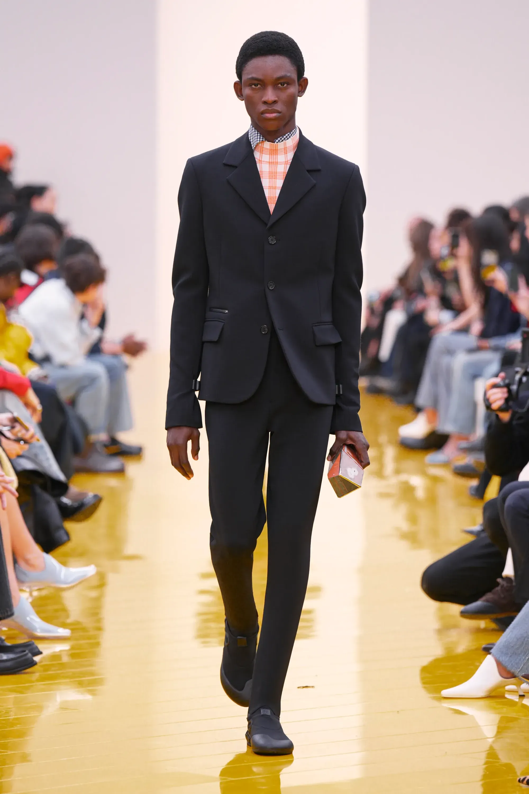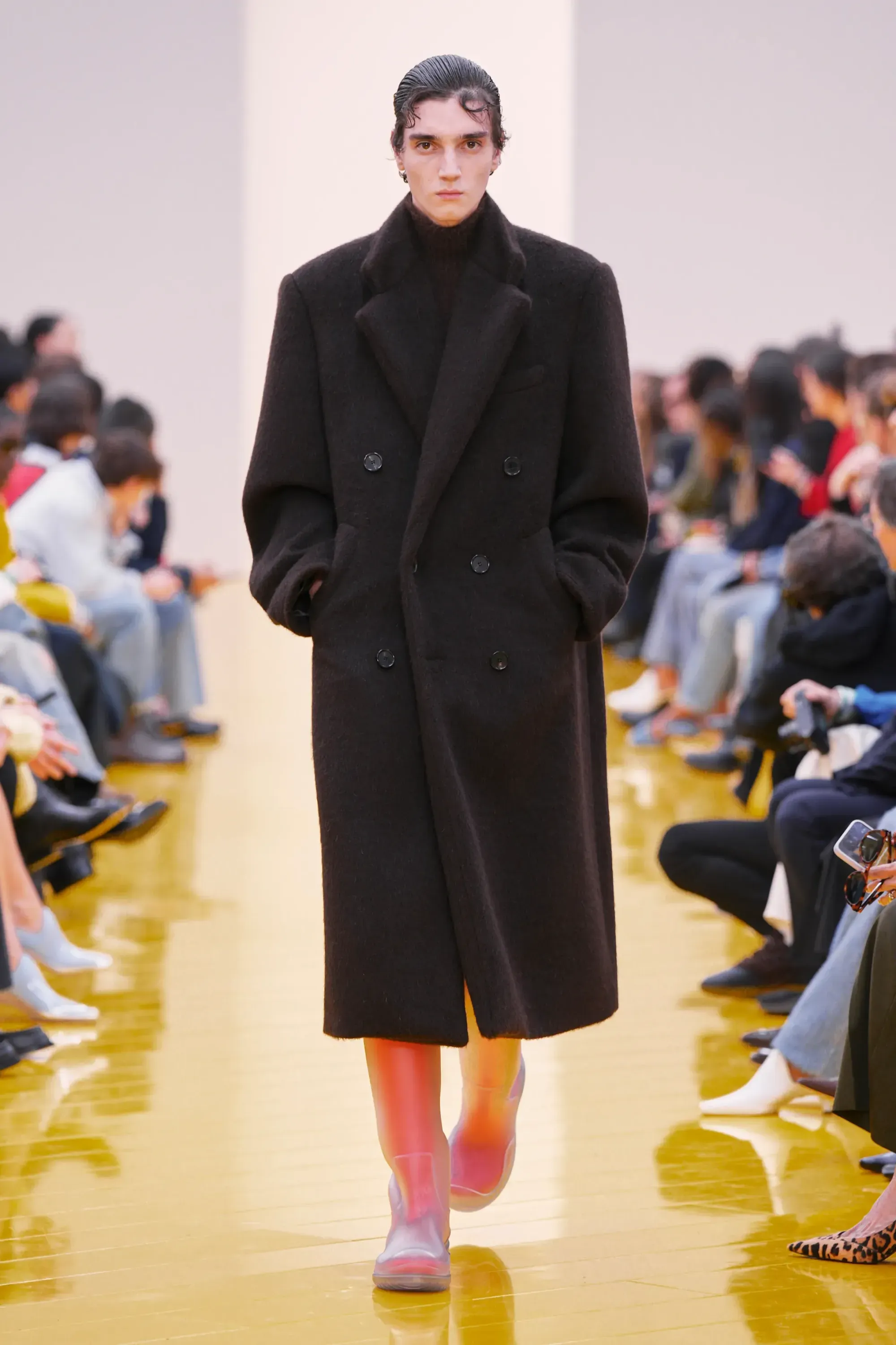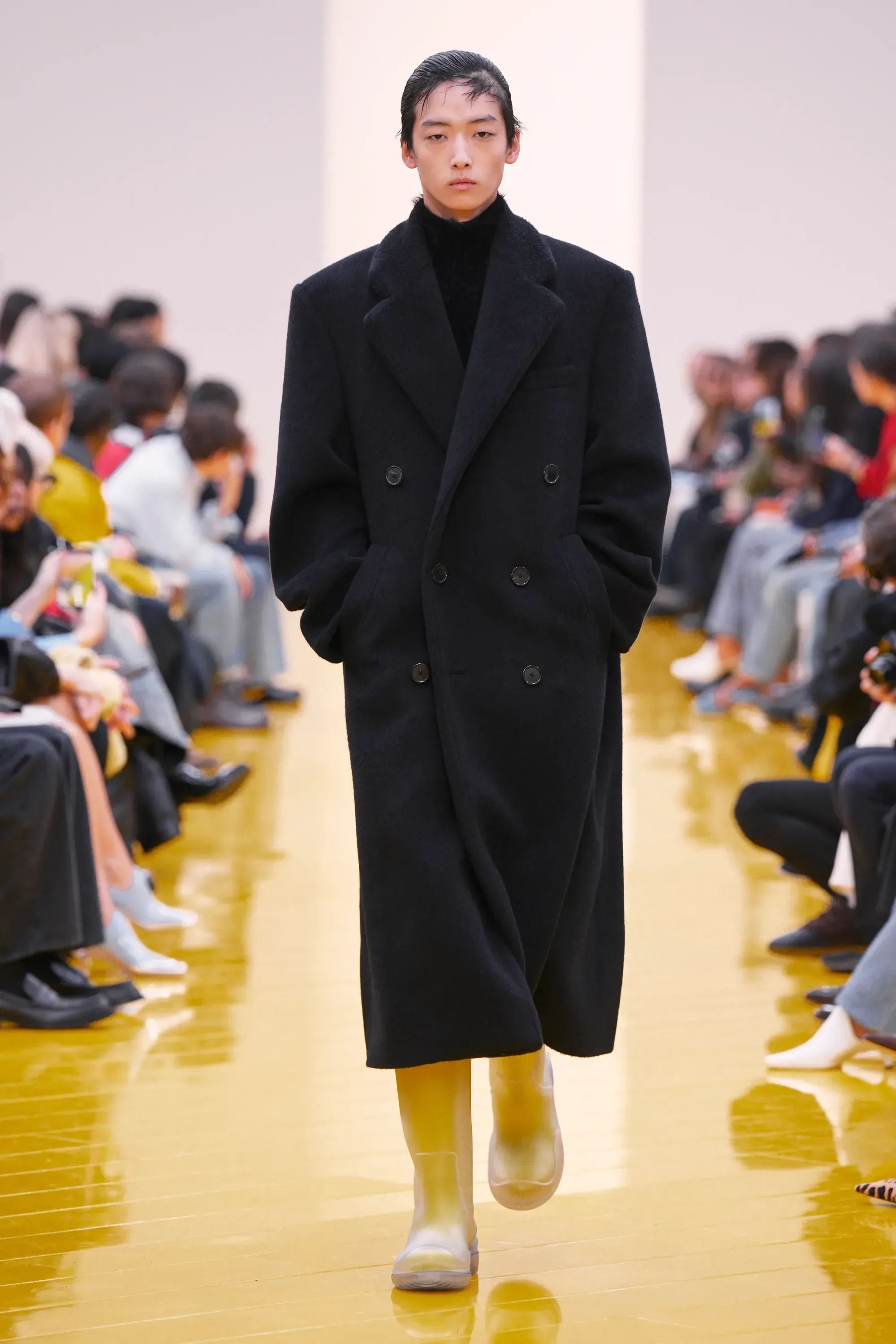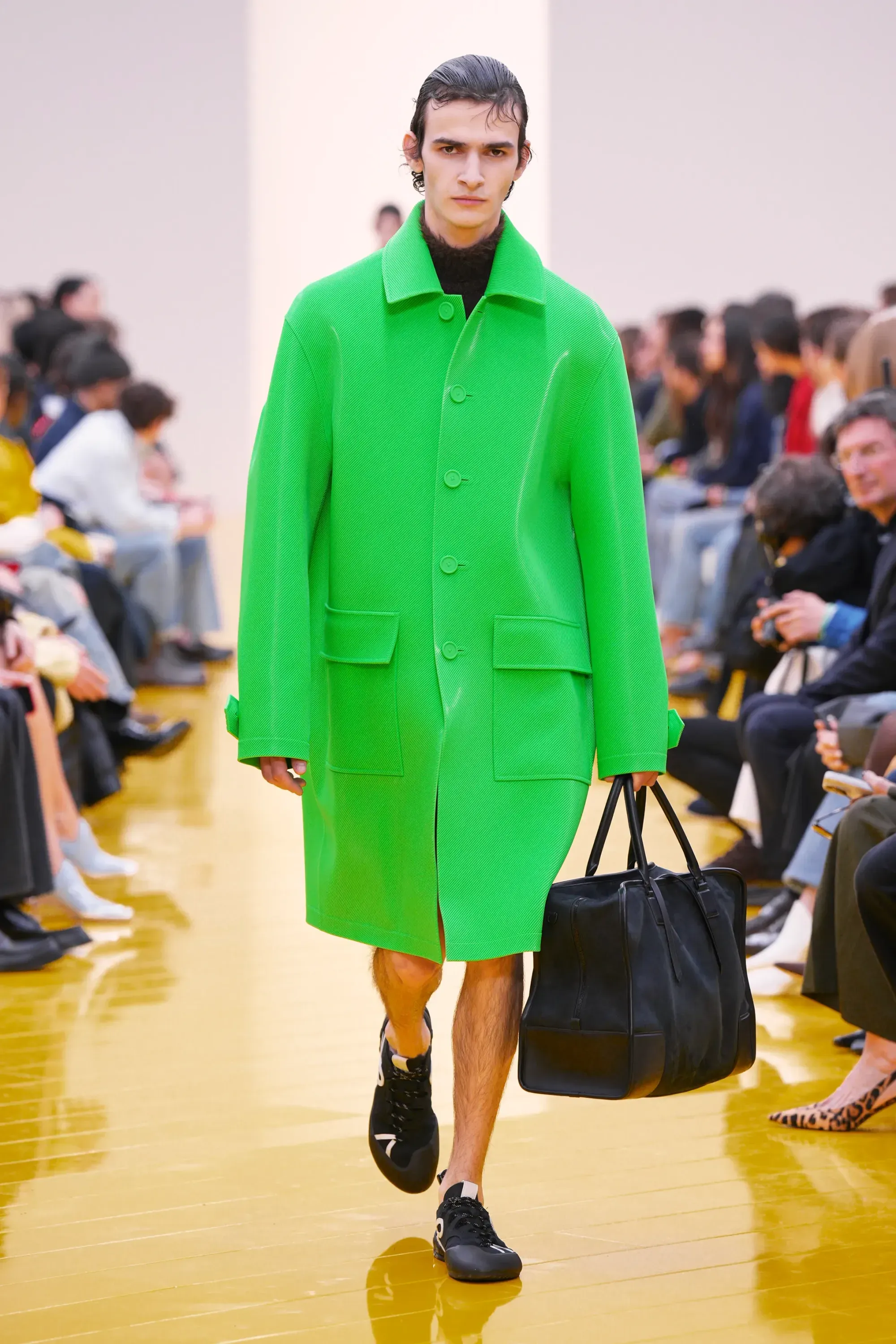 Perché in tutta la sfilata non c’è stato un momento disruptive alla Loewe (se non per delle scarpe a forma di cuscino), né nella collezione né negli accessori: è stato tutto, o quantomeno quasi, okay. Nessun pomodoro, nessuna rosa, nessun piccione, solo una sfilza di borse anonime ma comunque belle. Una continuità, forse troppo pesante, con la loro collezione di debutto. Stesso color-blocking, stesso gioco con i colletti lasciati per metà fuori, stessi cartamodelli per i vestiti drappeggiati, stesso layering per i cappucci. Va bene la signature, ma forse qui potremmo parlare quasi di pigrizia.