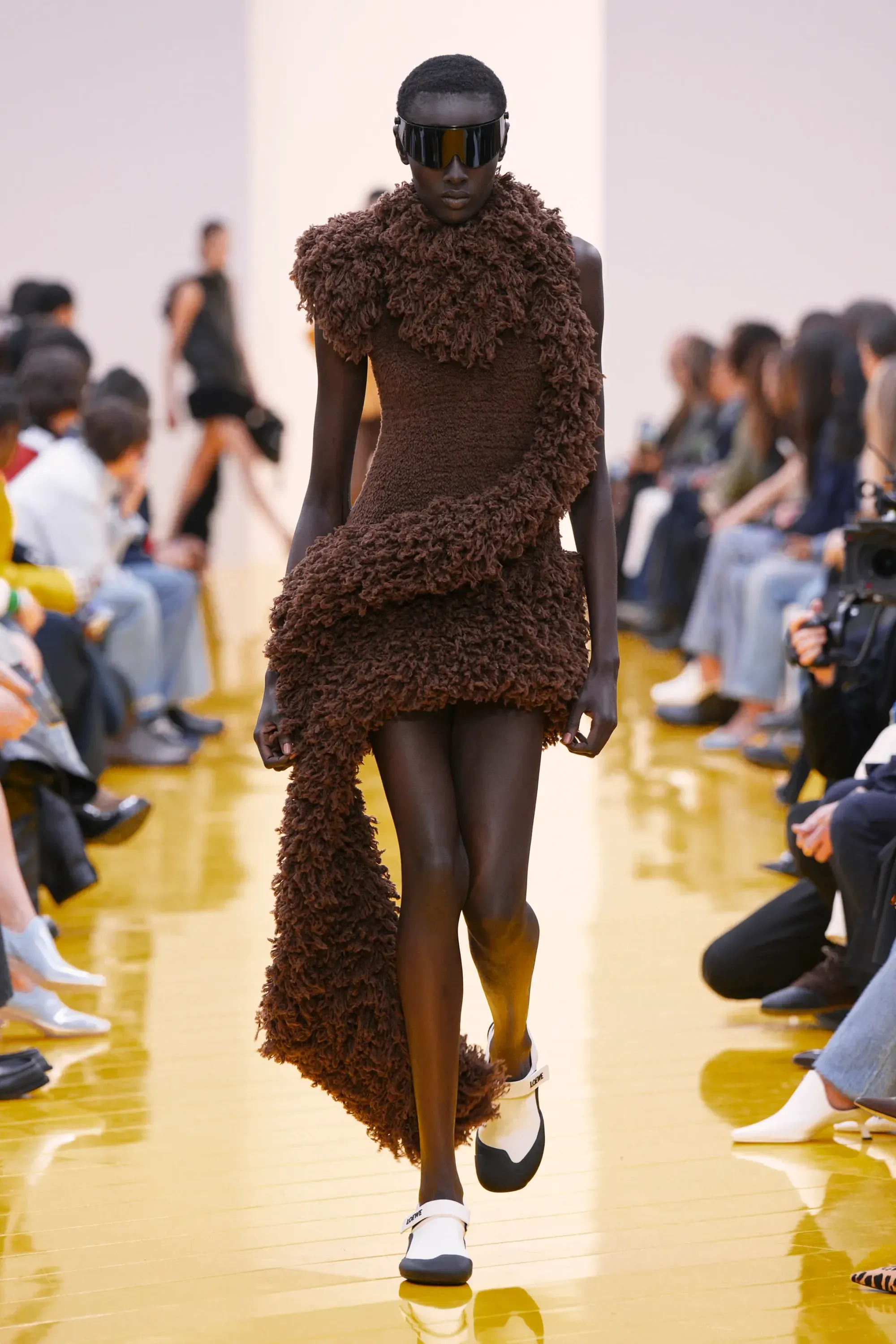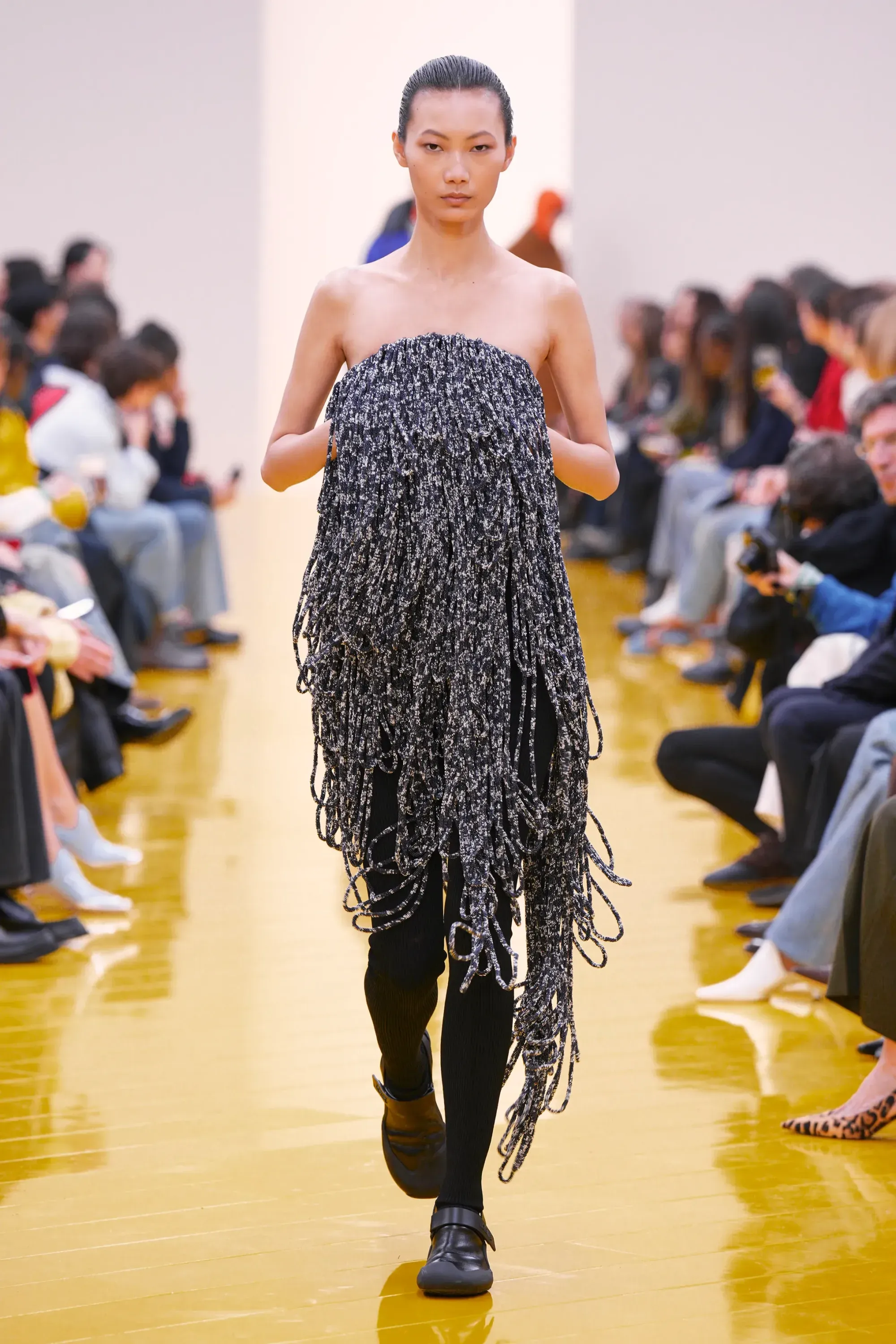 Nella venue invece era presente una serie di sculture morbide che raffiguravano animali marini, realizzate come enormi peluche in velluto scuro. Una foca distesa, un’aragosta con le chele allungate, un'orca che si innalza i e perfino un cane stilizzato con orecchie appuntite, tutti con quella qualità tattile e quasi infantile che negli ultimi anni è diventata una delle cifre più riconoscibili dell’immaginario Loewe.