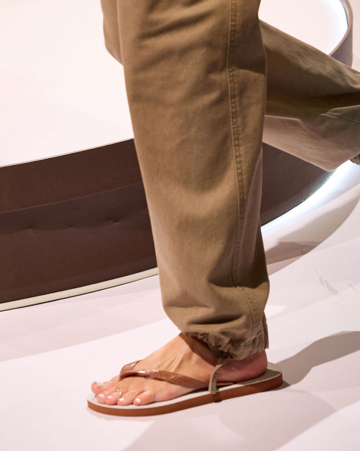 La musica ha rappresentato un altro elemento centrale del lancio: il cantante brasiliano João Gomes si è esibito dal vivo portando sul palco i ritmi del piseiro, rafforzando il legame tra le infradito e la cultura quotidiana del Paese, richiamando quell’immaginario popolare e autentico da cui il modello ha avuto origine. Inoltre, Havaianas ha presentato anche un’installazione ispirata all’architettura modernista brasiliana. Lo spazio metteva in risalto i codici visivi del design originale, tra cui il classico Tradi Blue e il Traditional Brown, quest’ultimo introdotto attraverso una capsule edition limitata che accompagna il rilancio.