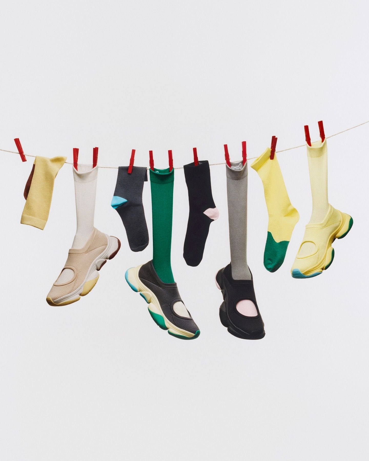 Sono disponibili quattro diverse varianti di colore, in una versatile palette di nero, rosa, giallo, verde, blu, beige e grigio. Ogni paio di scarpe è dotato di due paia di calzini in tonalità abbinate o a contrasto, invitando chi lo indossa a mixare, abbinare e personalizzare il look.
