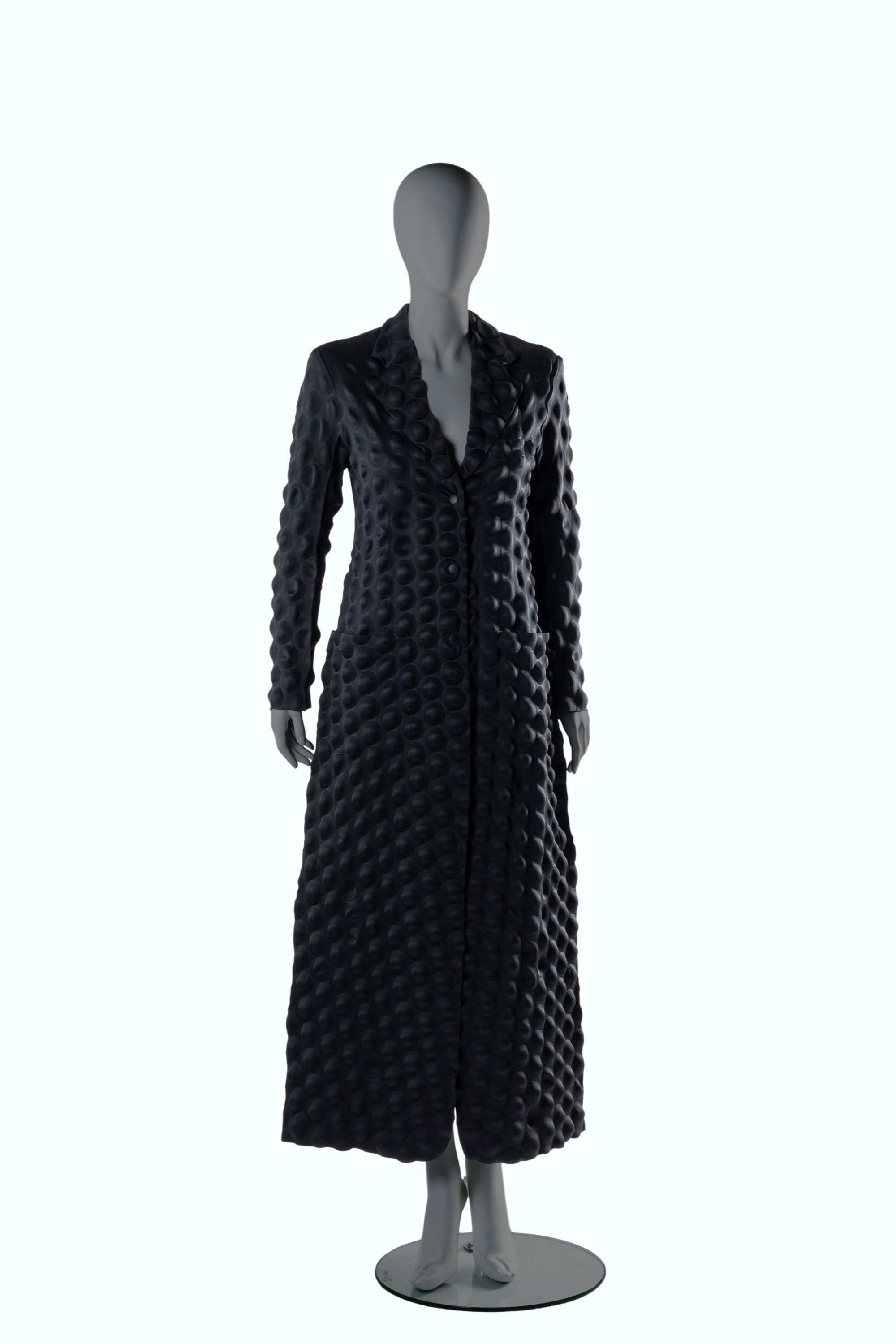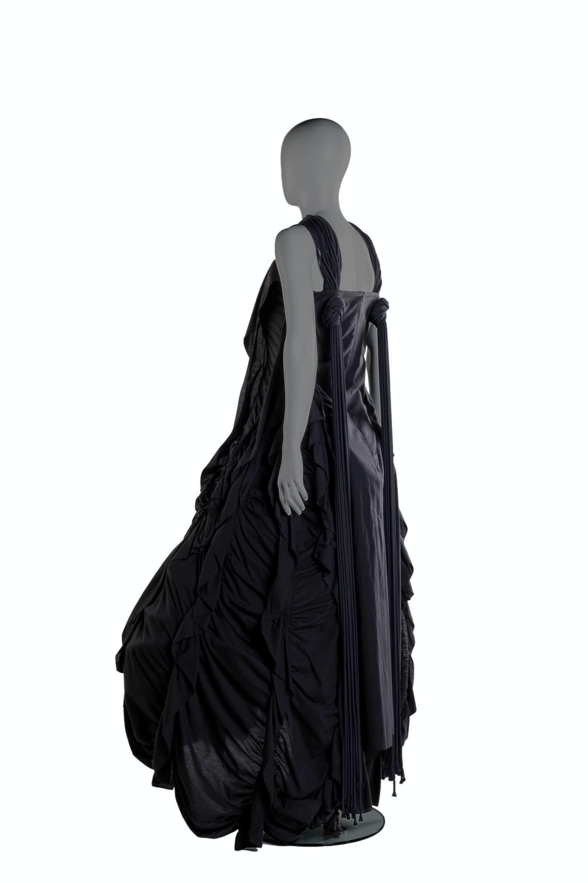 Il nero giapponese non è mai davvero “nero”. È ombra, è profondità, è variazione infinita. Come scrive Jun’ichirō Tanizaki, nel suo Libro d’ombra, la bellezza non sta nella luce piena, ma nei chiaroscuri, nelle zone intermedie. È lì che le cose accadono. Traslato nella moda, questo significa una cosa precisa: non mostrare tutto. Suggerire, evocare, lasciare spazio. Il nero diventa quindi un linguaggio silenzioso, quasi anti-comunicativo e la moda diventa una forma di comunicazione silenziosa, un linguaggio espressivo che non necessita di parole. In un momento storico in cui tutto è iper-visibile e condiviso, questa mostra arriva come una pausa: un invito a rallentare, a guardare meglio, per entrare nelle pieghe delle cose. Perché alla fine il nero, qui, non è mai assenza, ma apre al concetto di possibilità con inedite potenzialità espressive.