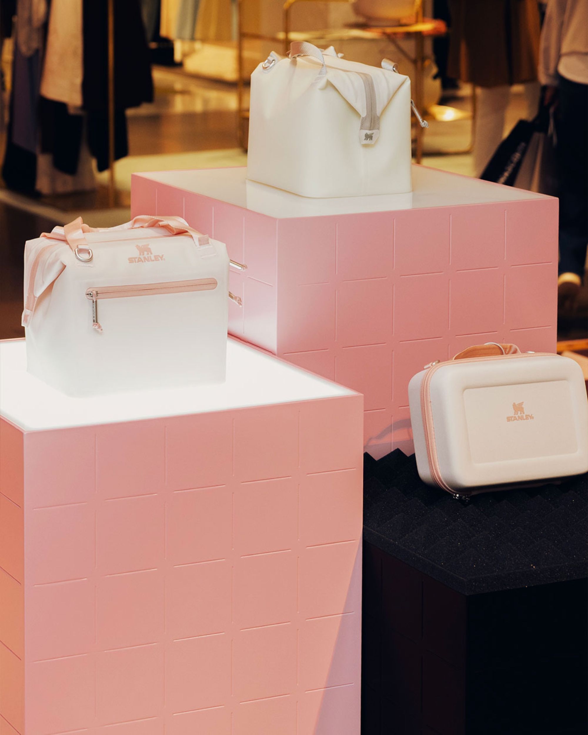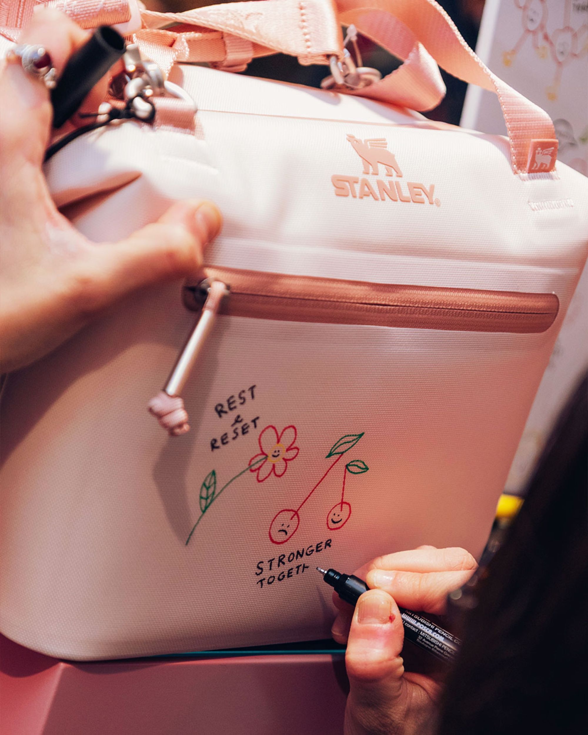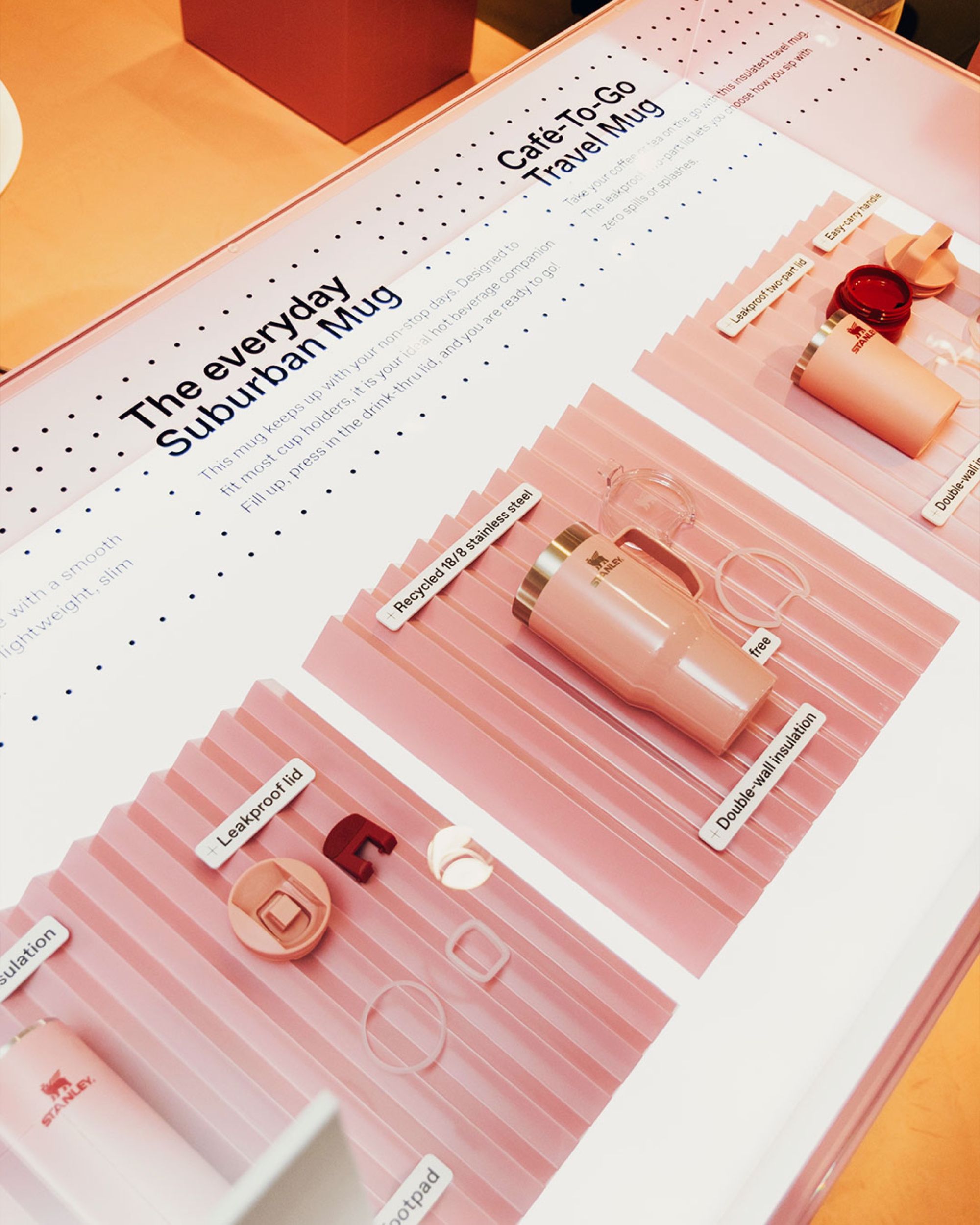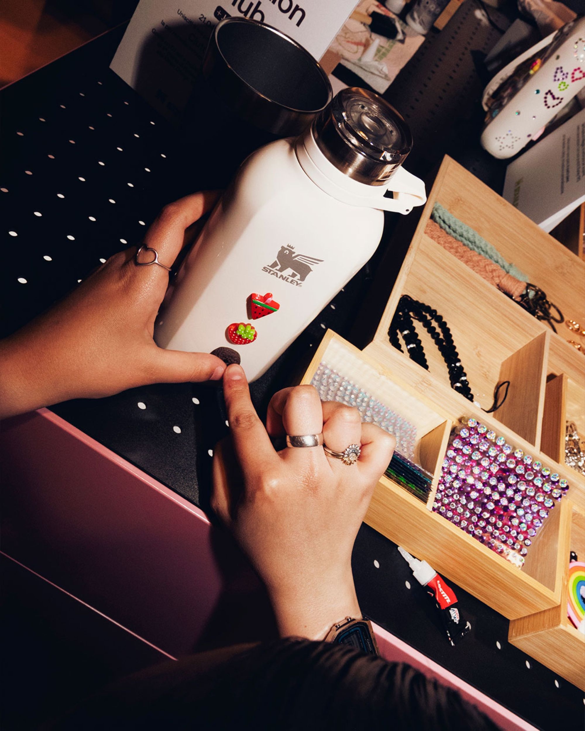 Il progetto si sviluppa attorno a tre prodotti iconici del brand, ognuno protagonista di una settimana dedicata: la Julienne Mini Cooler Bag, la Clutch Bottle e la Fliptop Mug. A unire l’intero percorso c'è il Charms Bar, un’area DIY sempre attiva che ha permesso ai visitatori di personalizzare i propri acquisti con charm, sticker e dettagli decorativi, rendendo ogni pezzo unico. In concomitanza con la Milano Art Week, la Julienne Mini Cooler Bag è stata al centro di una collaborazione con l’illustratrice Giulia Nava, che ha realizzato sessioni live di personalizzazione in-store. La seconda settimana, allineata alla Milano Design Week, ha visto protagonista la Clutch Bottle, proposta in una versione più premium grazie a un servizio di incisione laser su tag metallici. In questi giorni Stanley introdurrà anche la On-the-Go Challenge, un gioco che coinvolgerà il pubblico anche fuori dallo store con reward dedicati.