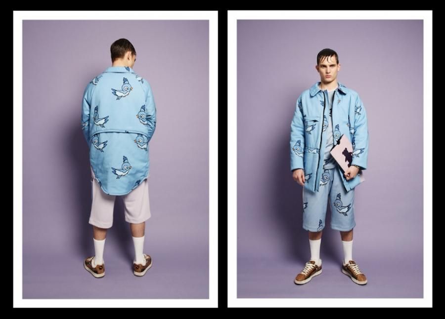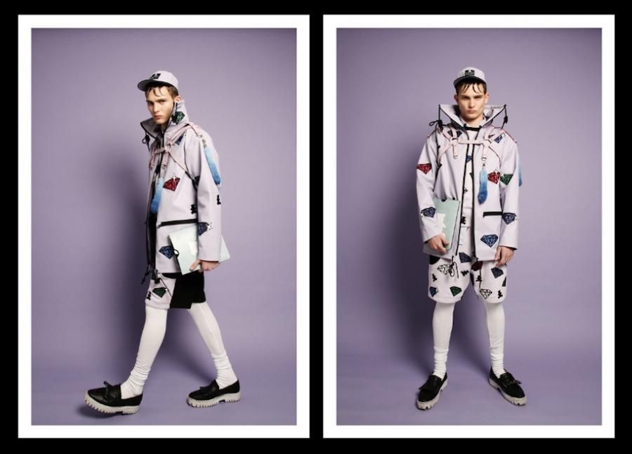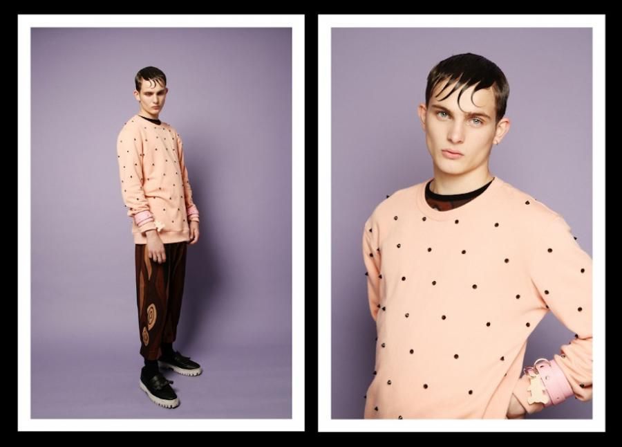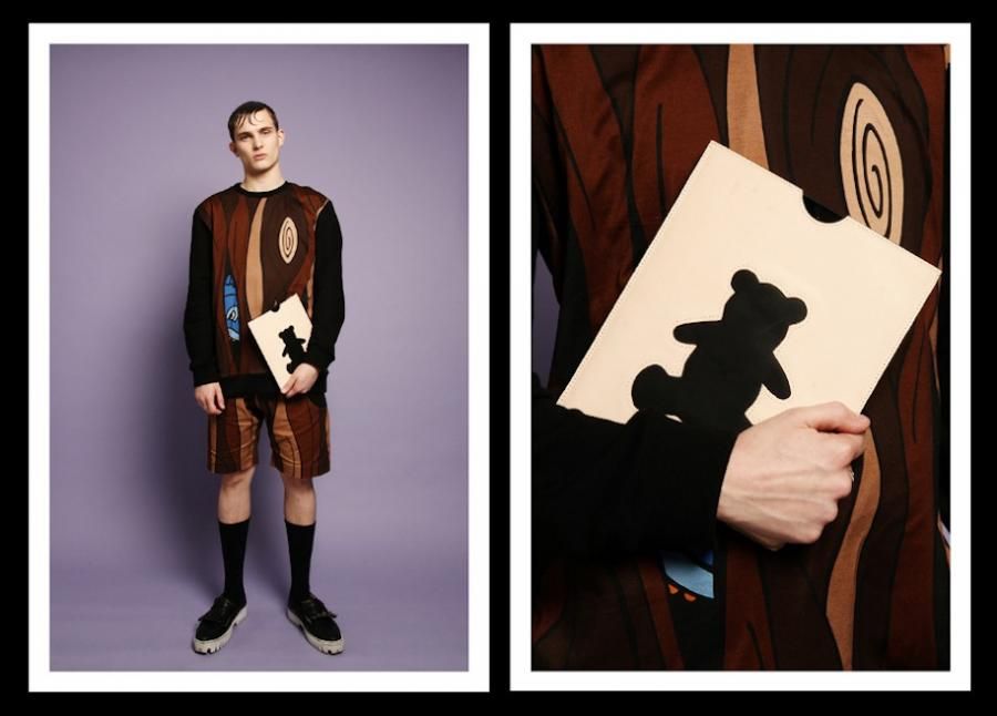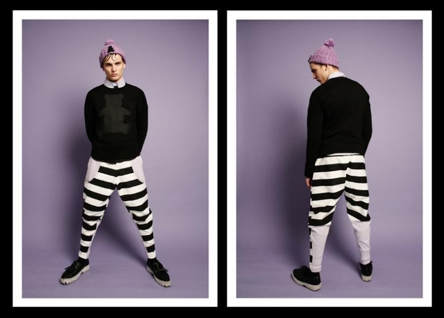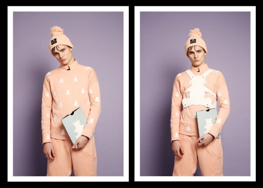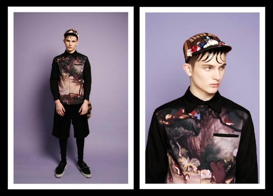 The ears of the famous mouse becomes a bizarre headdress, tender birds, deer and all the animals of the story with the famous poisoned apple are the subject of shirts and pants’ prints. The entire line is a mixture of ironic details, quirks, like the teddy bear pink sweater, and tailoring, things that Abley has in common with two designers such as Nicola Formichetti, with whom he collaborated on the project NicoPanda, and as Alexander McQueen, his sources of inspiration. Bobby Abley plays with the great classics of our childhood and applies them to typical elements of menswear.
