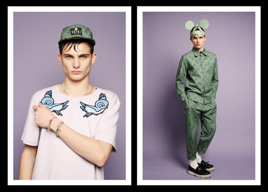Le orecchie del celebre topo diventano un bizzarro copricapo, teneri uccellini, cerbiatti e tutti gli animaletti della favola con la famosa mela avvelenata sono il soggetto delle stampe di camicie e pantaloni. L’intera linea è un miscuglio di dettagli ironici, stranezze, come il maglione- teddy bear rosa e tagli sartoriali, cose che Abley ha in comune con due stilisti: Nicola Formichetti, con cui ha collaborato per il progetto NicoPanda, e Alexander McQueen, sue fonti di ispirazione. Bobby Abley gioca con i grandi classici della nostra infanzia e li applica ad elementi tipici del menswear.