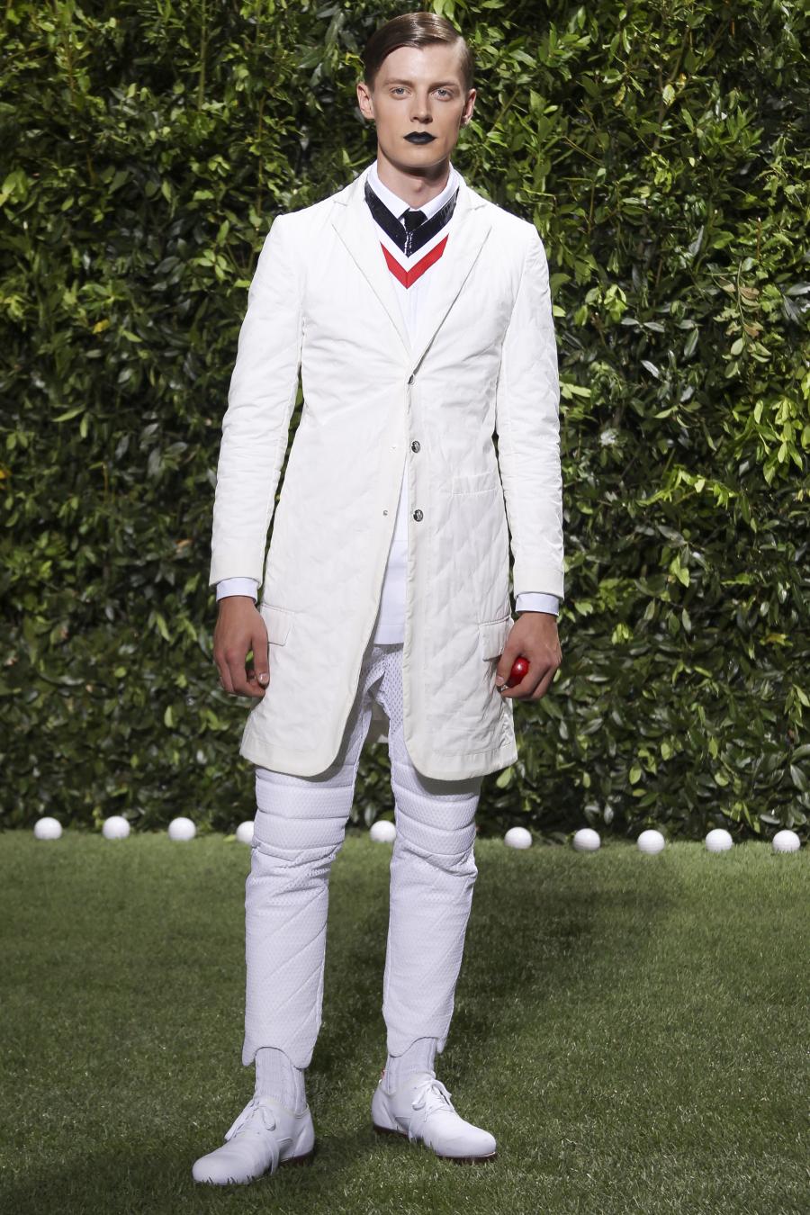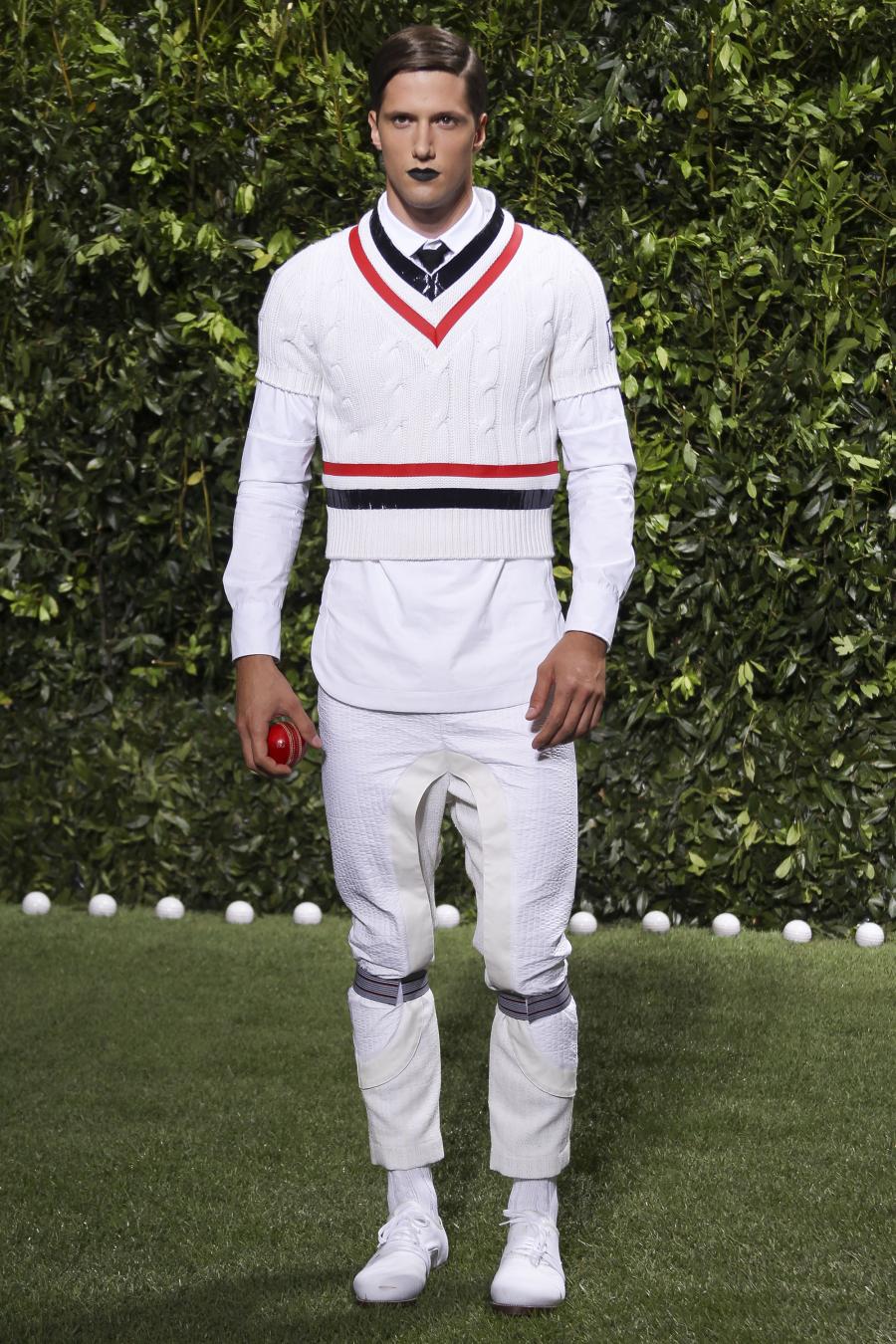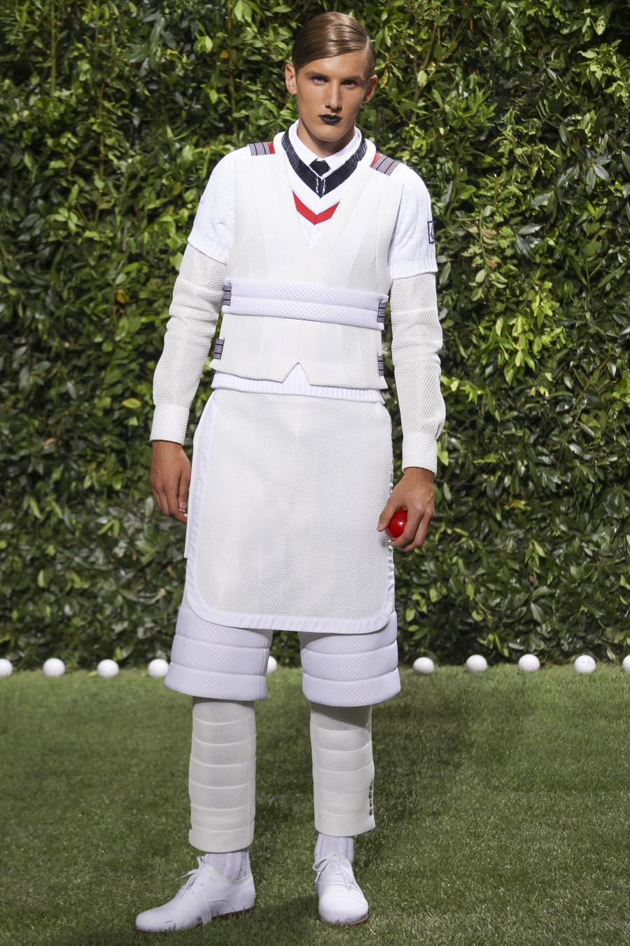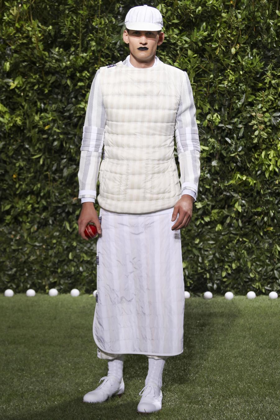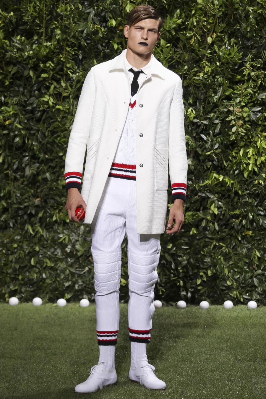 Tra le nuove proposte, le giacche e i pantaloni ispirati all’abbigliamento da cricket, con imbottiture trapuntate su gomiti, spalle e ginocchia. A queste si aggiungono i classici sartoriali: completi, giacche sportive, cappotti Chesterfield, trench, mantelle, cardigan, polo, pantaloni e shorts – tutti con dettagli spesso utilizzati nell’abbigliamento per il cricket, come le imbottiture trapuntate e il ricamo che riproduce una delle caratteristiche mazze. Una collezione completa, comprendente capispalla, pantaloni, shorts, giacche, camicie e accessori, per la prima volta in bianco assoluto, qua e là con dettagli in rosso/bianco/blu. Tessuti e finiture: cotone, lana leggera estiva, tessuto Oxford, piquet di cotone, jersey di cotone, cashmere leggero, oltre a materiali tecnici quali tessuto riflettente, Cordura leggera, Ripstop nylon, alcuni con ricami che riproducono la mazza da cricket e altri con dettagli in rosso/bianco/blu. Accessori: scarpe ispirate al cricket in tela di cotone e Nubuck.
