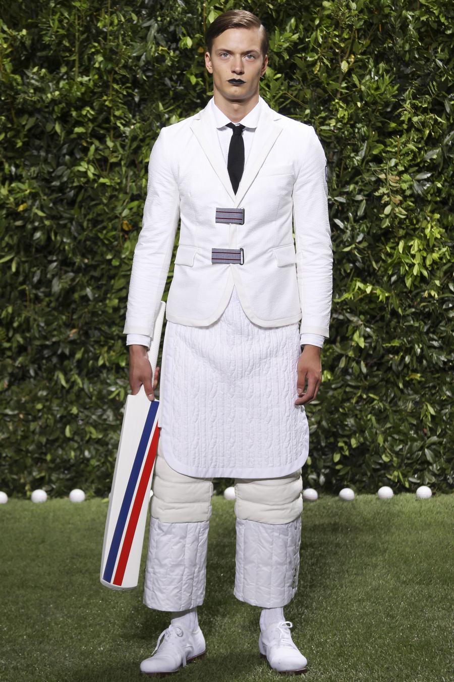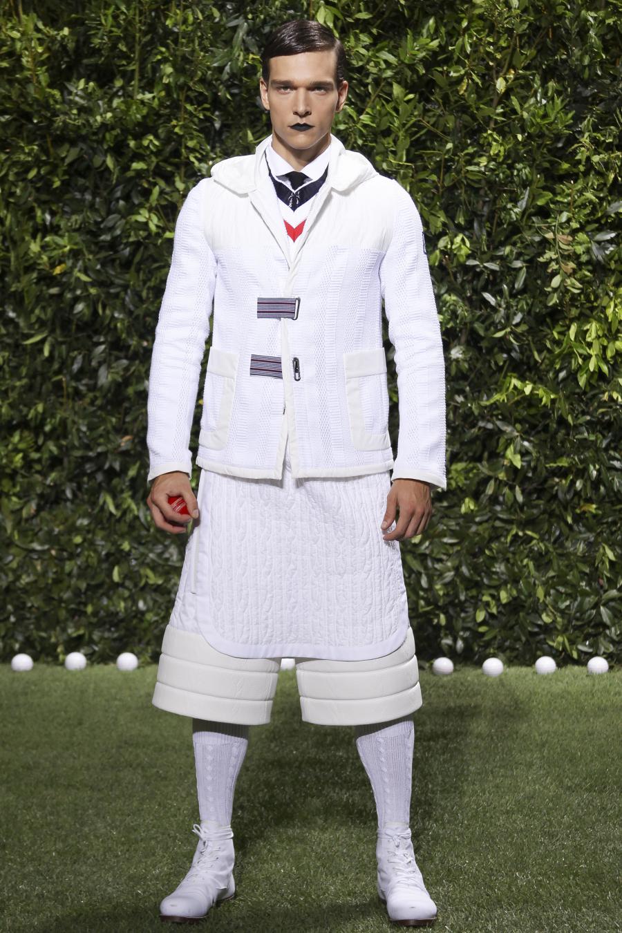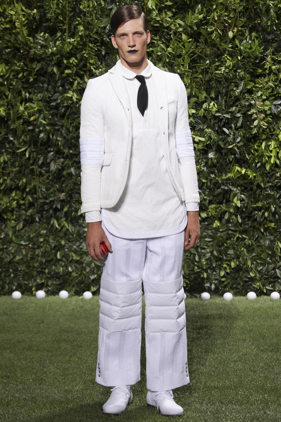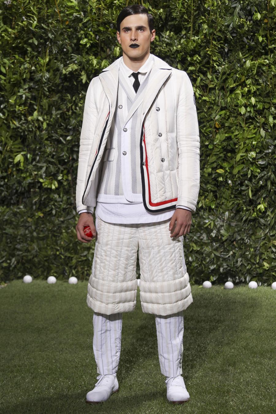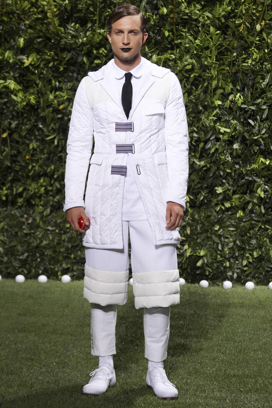 Tra le nuove proposte, le giacche e i pantaloni ispirati all’abbigliamento da cricket, con imbottiture trapuntate su gomiti, spalle e ginocchia. A queste si aggiungono i classici sartoriali: completi, giacche sportive, cappotti Chesterfield, trench, mantelle, cardigan, polo, pantaloni e shorts – tutti con dettagli spesso utilizzati nell’abbigliamento per il cricket, come le imbottiture trapuntate e il ricamo che riproduce una delle caratteristiche mazze. Una collezione completa, comprendente capispalla, pantaloni, shorts, giacche, camicie e accessori, per la prima volta in bianco assoluto, qua e là con dettagli in rosso/bianco/blu. Tessuti e finiture: cotone, lana leggera estiva, tessuto Oxford, piquet di cotone, jersey di cotone, cashmere leggero, oltre a materiali tecnici quali tessuto riflettente, Cordura leggera, Ripstop nylon, alcuni con ricami che riproducono la mazza da cricket e altri con dettagli in rosso/bianco/blu. Accessori: scarpe ispirate al cricket in tela di cotone e Nubuck.