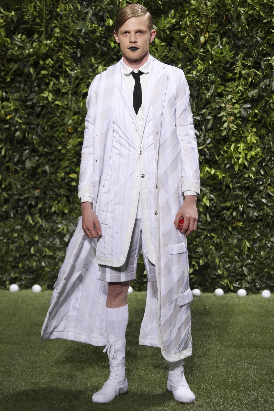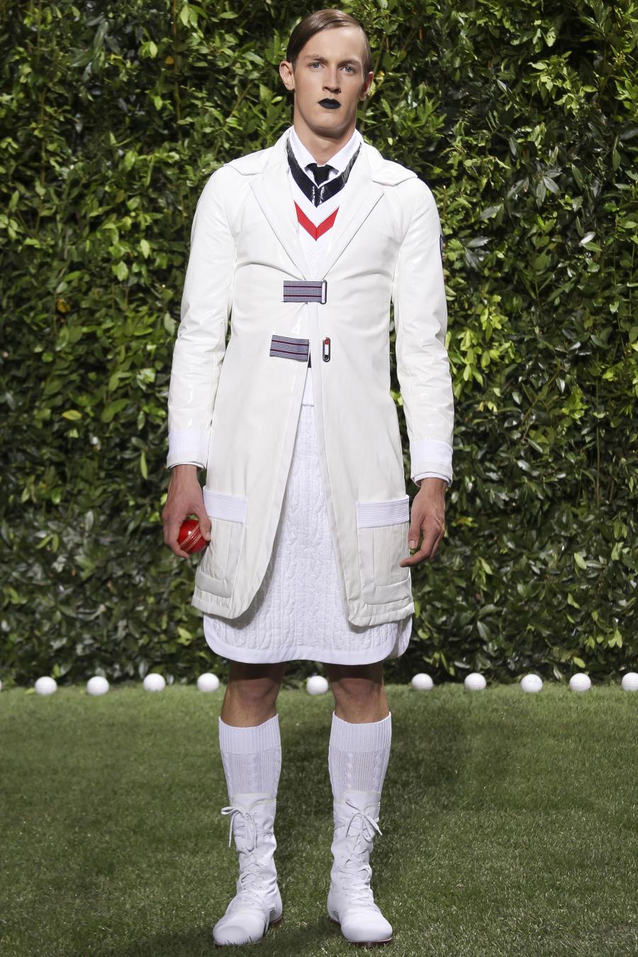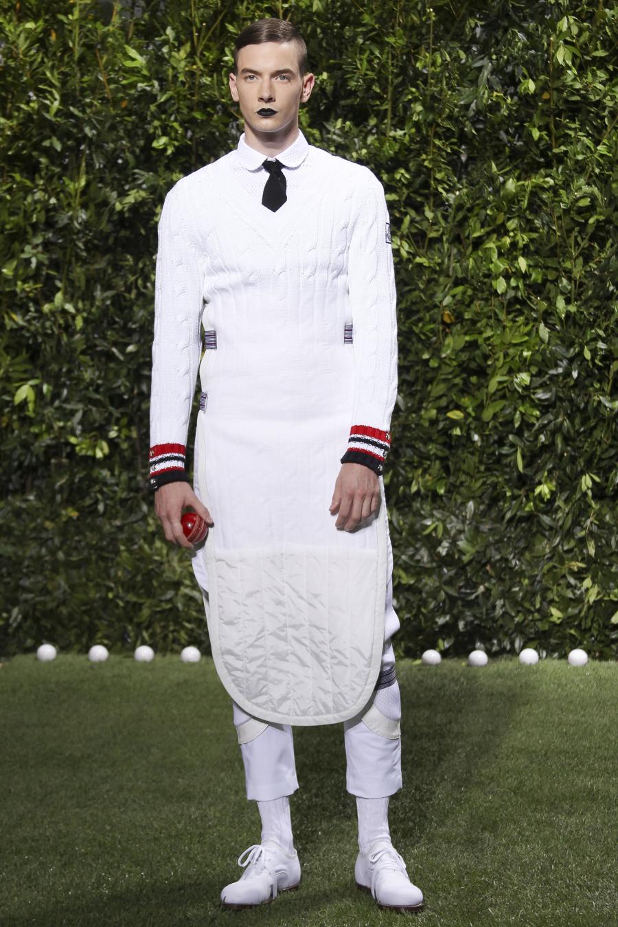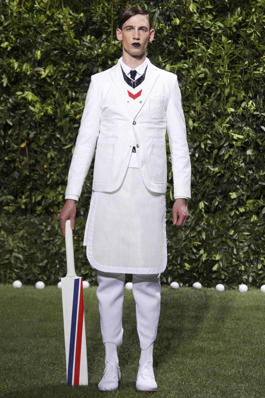 Tra le nuove proposte, le giacche e i pantaloni ispirati all’abbigliamento da cricket, con imbottiture trapuntate su gomiti, spalle e ginocchia. A queste si aggiungono i classici sartoriali: completi, giacche sportive, cappotti Chesterfield, trench, mantelle, cardigan, polo, pantaloni e shorts – tutti con dettagli spesso utilizzati nell’abbigliamento per il cricket, come le imbottiture trapuntate e il ricamo che riproduce una delle caratteristiche mazze. Una collezione completa, comprendente capispalla, pantaloni, shorts, giacche, camicie e accessori, per la prima volta in bianco assoluto, qua e là con dettagli in rosso/bianco/blu. Tessuti e finiture: cotone, lana leggera estiva, tessuto Oxford, piquet di cotone, jersey di cotone, cashmere leggero, oltre a materiali tecnici quali tessuto riflettente, Cordura leggera, Ripstop nylon, alcuni con ricami che riproducono la mazza da cricket e altri con dettagli in rosso/bianco/blu. Accessori: scarpe ispirate al cricket in tela di cotone e Nubuck.