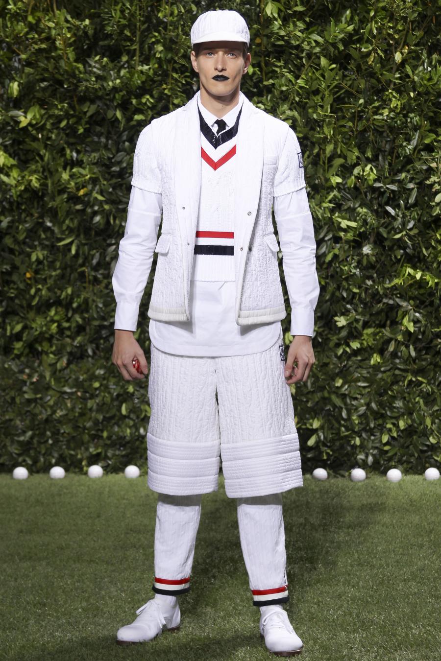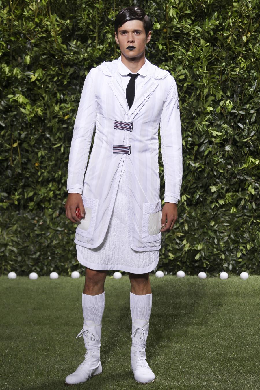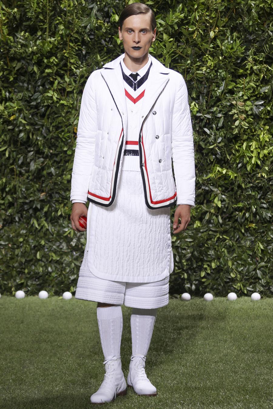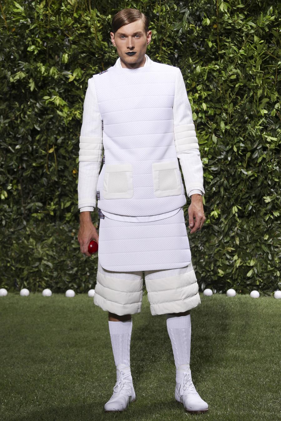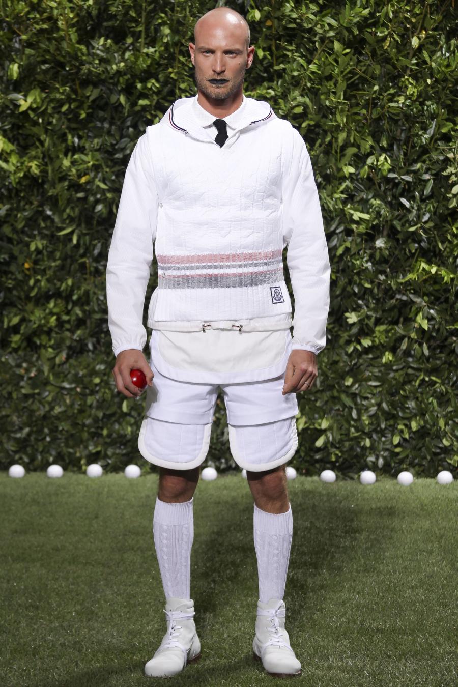 Tra le nuove proposte, le giacche e i pantaloni ispirati all’abbigliamento da cricket, con imbottiture trapuntate su gomiti, spalle e ginocchia. A queste si aggiungono i classici sartoriali: completi, giacche sportive, cappotti Chesterfield, trench, mantelle, cardigan, polo, pantaloni e shorts – tutti con dettagli spesso utilizzati nell’abbigliamento per il cricket, come le imbottiture trapuntate e il ricamo che riproduce una delle caratteristiche mazze. Una collezione completa, comprendente capispalla, pantaloni, shorts, giacche, camicie e accessori, per la prima volta in bianco assoluto, qua e là con dettagli in rosso/bianco/blu. Tessuti e finiture: cotone, lana leggera estiva, tessuto Oxford, piquet di cotone, jersey di cotone, cashmere leggero, oltre a materiali tecnici quali tessuto riflettente, Cordura leggera, Ripstop nylon, alcuni con ricami che riproducono la mazza da cricket e altri con dettagli in rosso/bianco/blu. Accessori: scarpe ispirate al cricket in tela di cotone e Nubuck.
