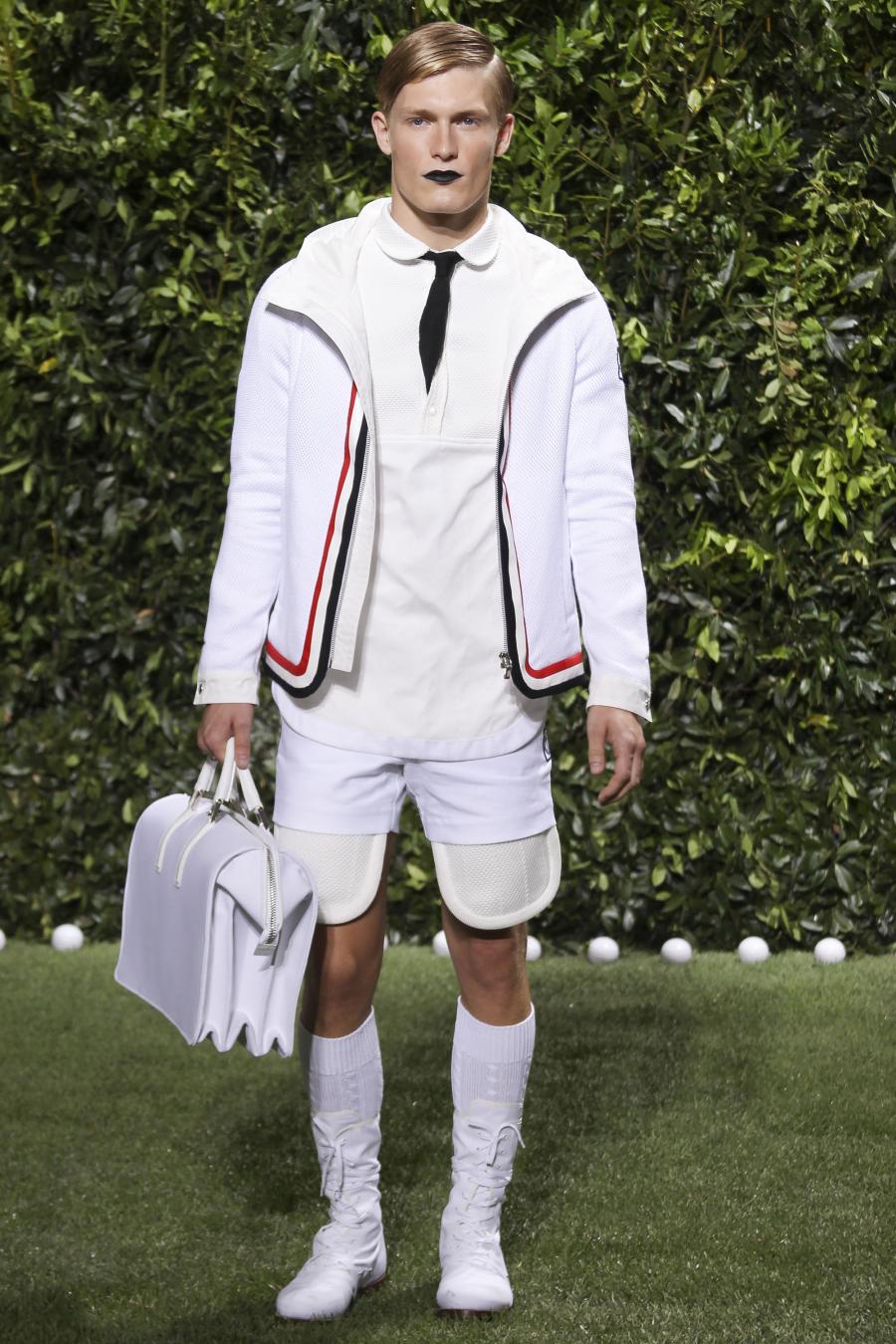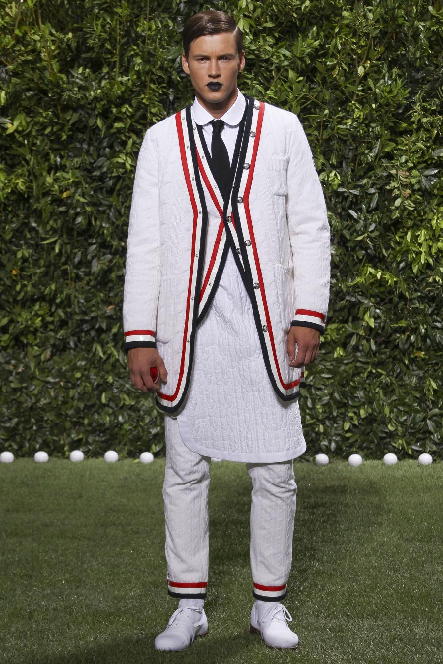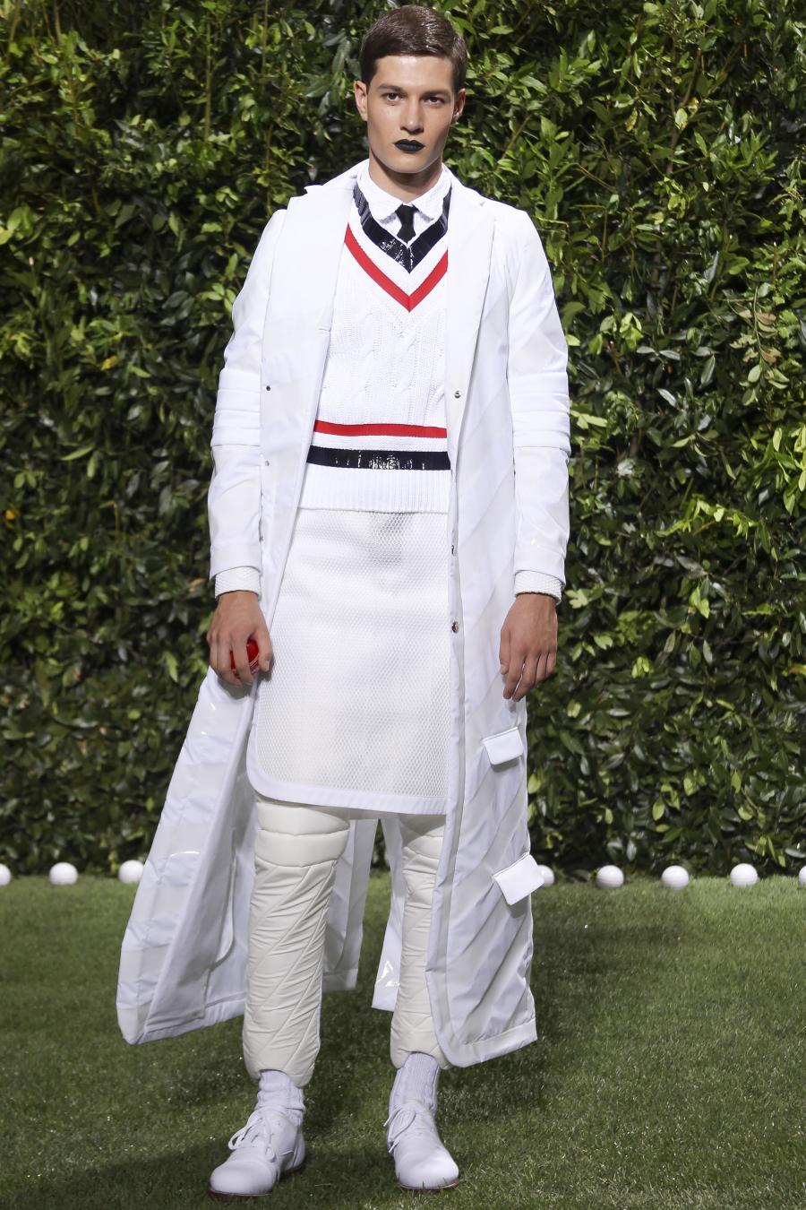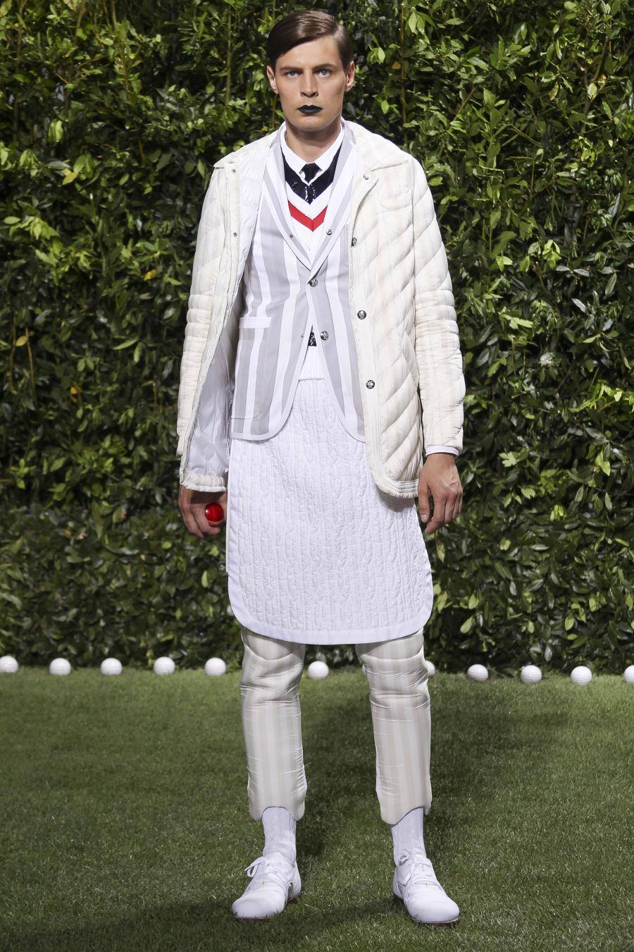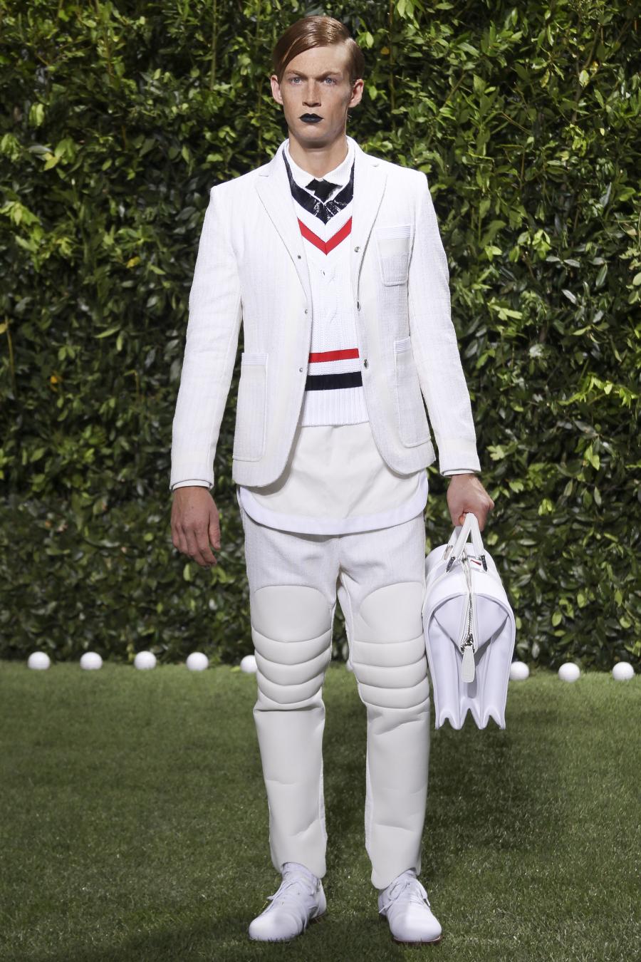 Tra le nuove proposte, le giacche e i pantaloni ispirati all’abbigliamento da cricket, con imbottiture trapuntate su gomiti, spalle e ginocchia. A queste si aggiungono i classici sartoriali: completi, giacche sportive, cappotti Chesterfield, trench, mantelle, cardigan, polo, pantaloni e shorts – tutti con dettagli spesso utilizzati nell’abbigliamento per il cricket, come le imbottiture trapuntate e il ricamo che riproduce una delle caratteristiche mazze. Una collezione completa, comprendente capispalla, pantaloni, shorts, giacche, camicie e accessori, per la prima volta in bianco assoluto, qua e là con dettagli in rosso/bianco/blu. Tessuti e finiture: cotone, lana leggera estiva, tessuto Oxford, piquet di cotone, jersey di cotone, cashmere leggero, oltre a materiali tecnici quali tessuto riflettente, Cordura leggera, Ripstop nylon, alcuni con ricami che riproducono la mazza da cricket e altri con dettagli in rosso/bianco/blu. Accessori: scarpe ispirate al cricket in tela di cotone e Nubuck.