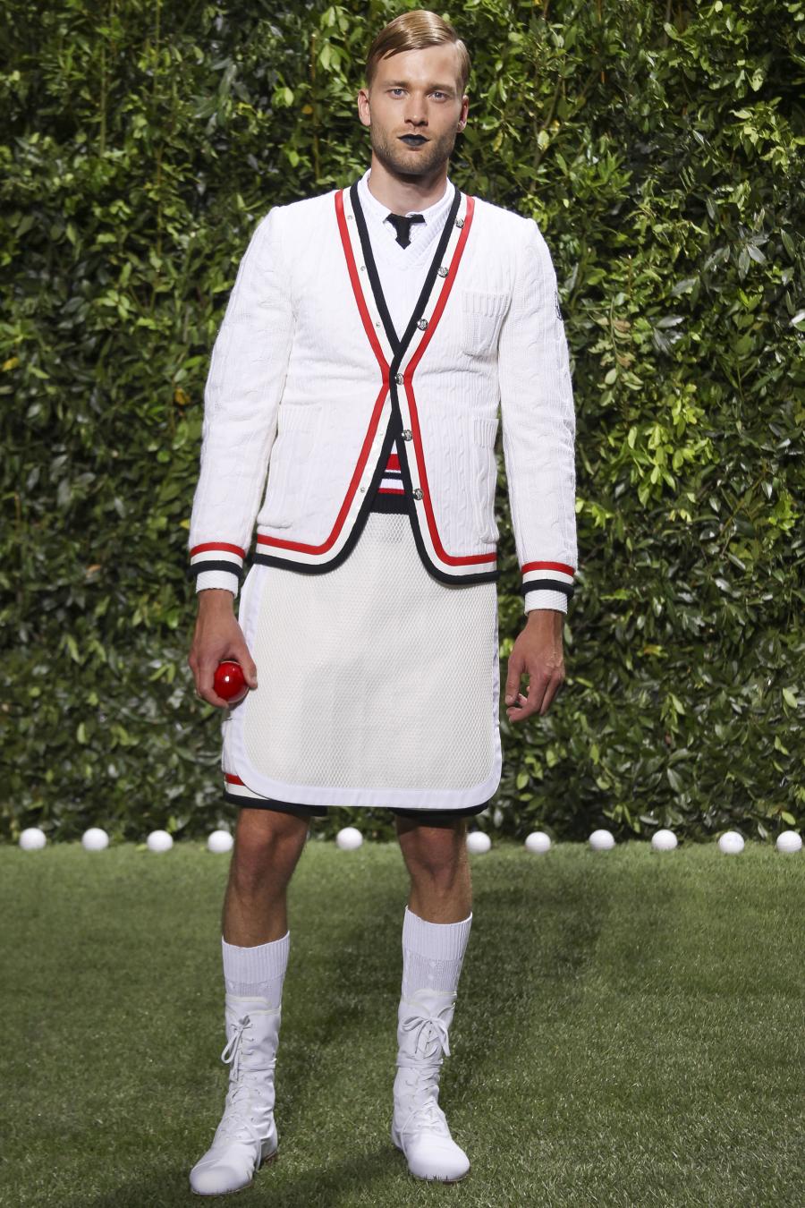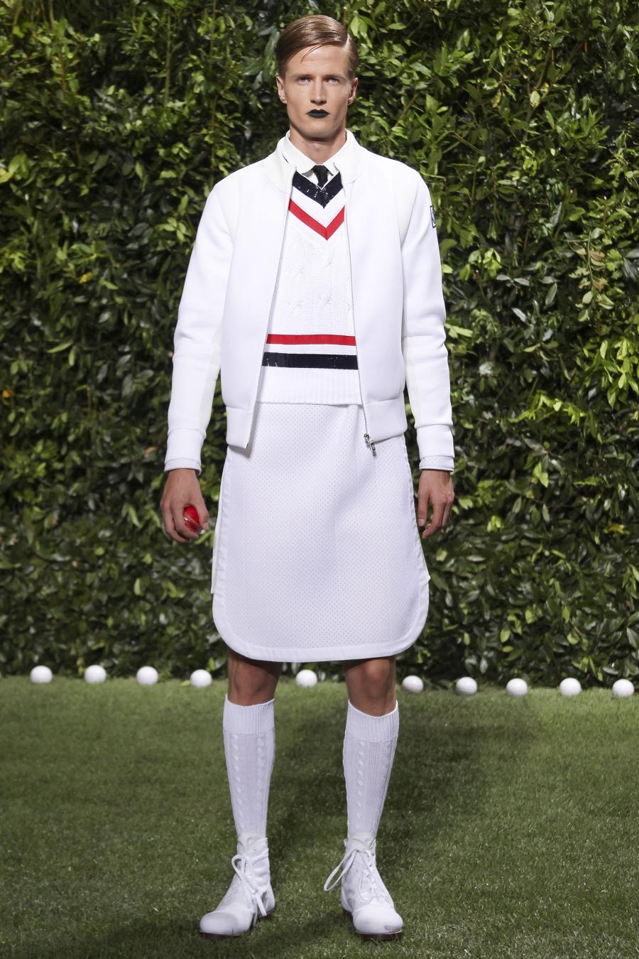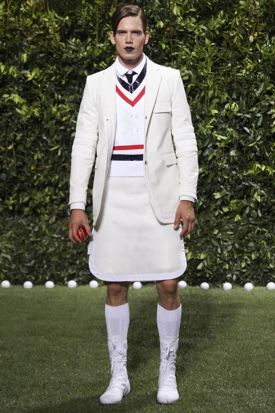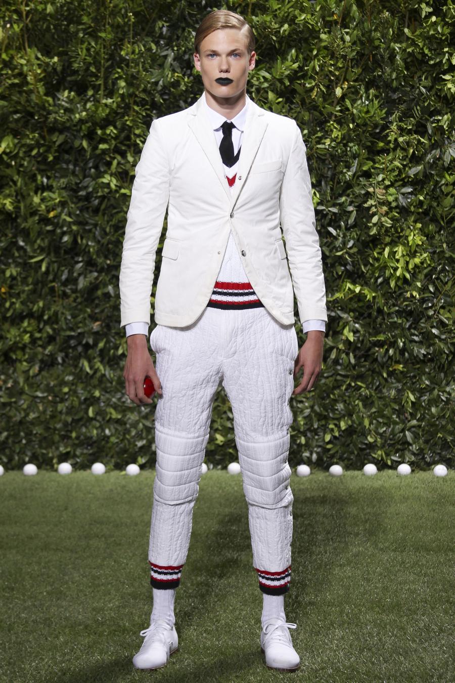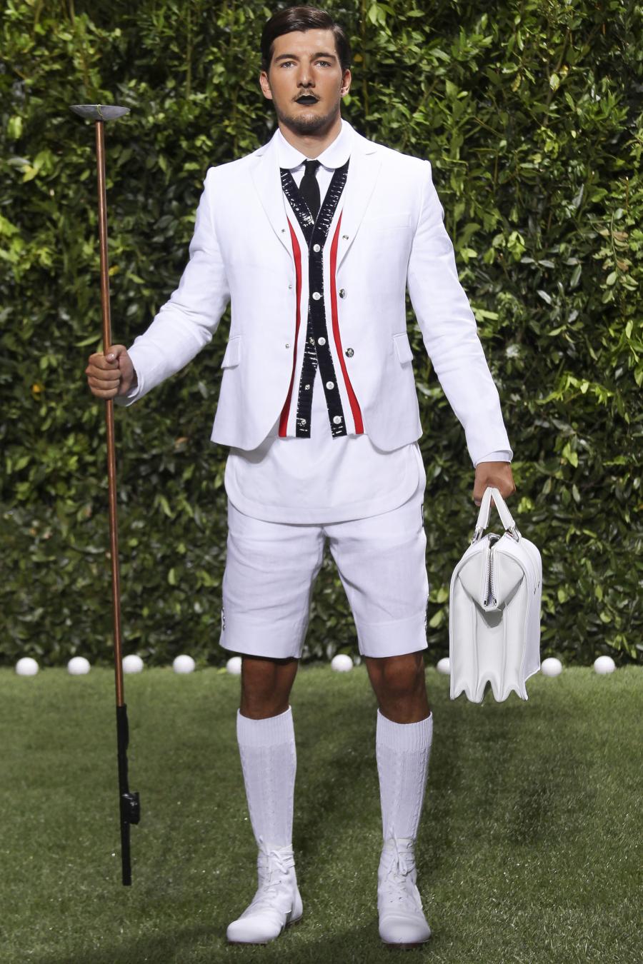 Tra le nuove proposte, le giacche e i pantaloni ispirati all’abbigliamento da cricket, con imbottiture trapuntate su gomiti, spalle e ginocchia. A queste si aggiungono i classici sartoriali: completi, giacche sportive, cappotti Chesterfield, trench, mantelle, cardigan, polo, pantaloni e shorts – tutti con dettagli spesso utilizzati nell’abbigliamento per il cricket, come le imbottiture trapuntate e il ricamo che riproduce una delle caratteristiche mazze. Una collezione completa, comprendente capispalla, pantaloni, shorts, giacche, camicie e accessori, per la prima volta in bianco assoluto, qua e là con dettagli in rosso/bianco/blu. Tessuti e finiture: cotone, lana leggera estiva, tessuto Oxford, piquet di cotone, jersey di cotone, cashmere leggero, oltre a materiali tecnici quali tessuto riflettente, Cordura leggera, Ripstop nylon, alcuni con ricami che riproducono la mazza da cricket e altri con dettagli in rosso/bianco/blu. Accessori: scarpe ispirate al cricket in tela di cotone e Nubuck.