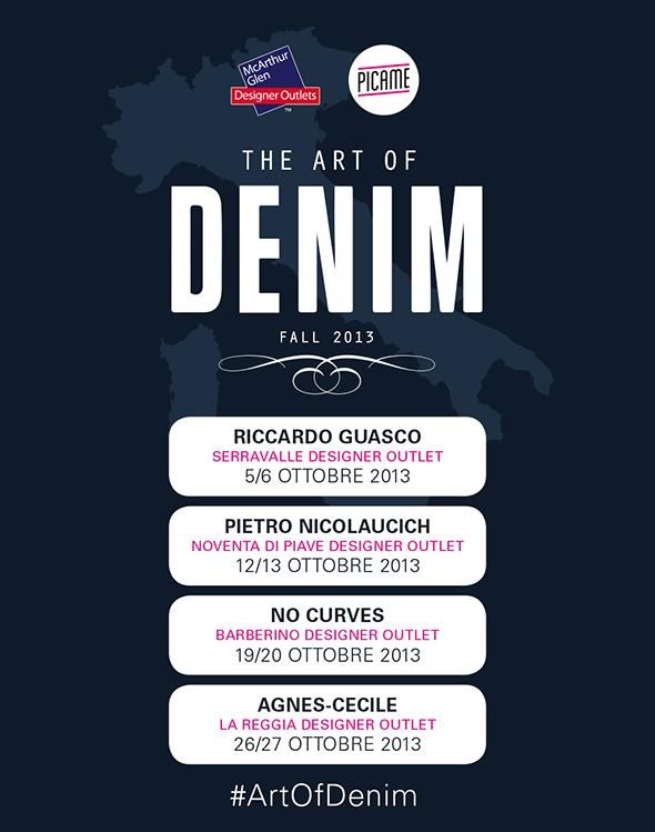Il denim, protagonista indiscusso del guardaroba femminile e maschile, must have irrinunciabile per le it people del fashion system, è presentato in numerosi varianti, lavaggi e colori dalle più importanti aziende di moda. Per questo McArthurGlen Italia, leader europeo nell'outlet retailing, e PICAME, web magazine italiano votato alle arti visive, hanno ideato il progetto - “The Art of Denim” - una campagna internazionale che si sviluppa durante il mese di Ottobre 2013 e che coinvolge tutti i Centri.