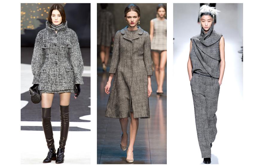 Si sono notate prepotenti influenze anni ‘40, l’esaltazione di una donna forte, drammatica, ma anche dinamica. Dimenticate le trasparenze e i pizzi che hanno caratterizzato le stagioni passate, le silhouette saranno disegnate da spalle arrotondate e gonne fascianti, celate da cappotti maschili. Forme intuibili in movimento, futurismo fatto pret-a-porter. Tweed e spinato saranno la nostra seconda pelle.
