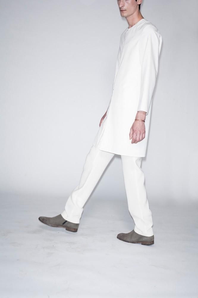 Nella sua proposta invernale il rigore è clinico, il bianco assoluto, i dettagli aboliti. I tagli sono netti, puliti, chirurgici. Le emozioni sono bandite, i confini annullati. Le lunghe tuniche portate sopra i pantaloni sottolineano lo stile ascetico del designer. La linea FW 2013 è pura, androgina, in cui l’identità è massificata, ma non risulta mai anonima.