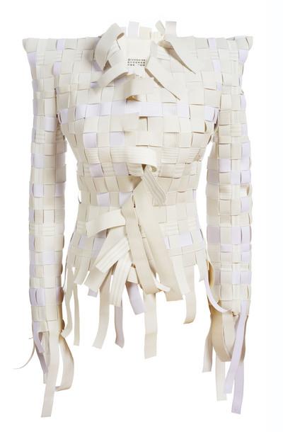 Muta e bianca, posizionata all’esterno degli abiti, attraverso 4 punti, permette al cliente di scucirli per appropriarsi del capo e renderlo proprio. L’etichetta che diventa poetica e prima mossa nella storia del marketing della maison.