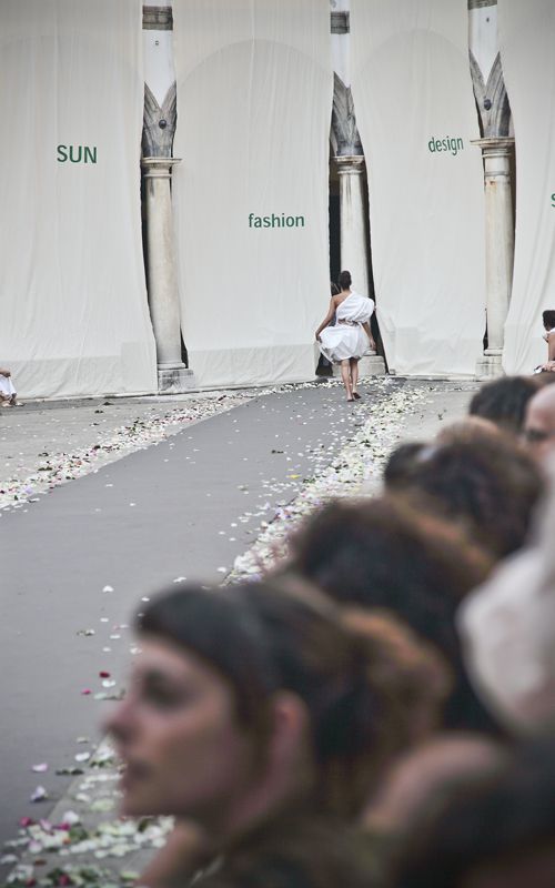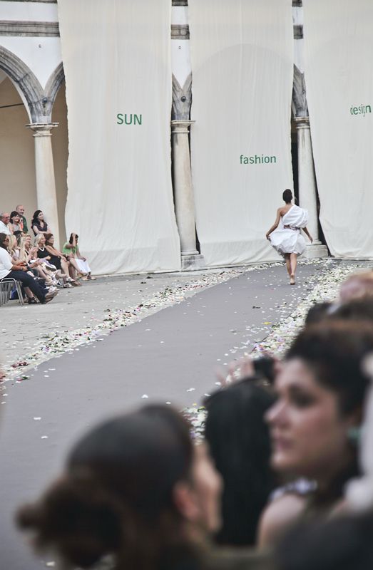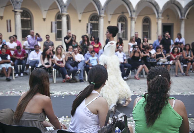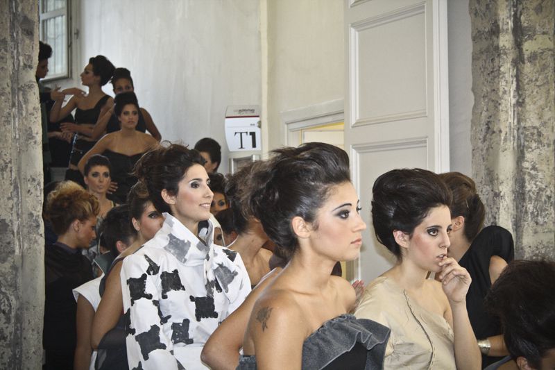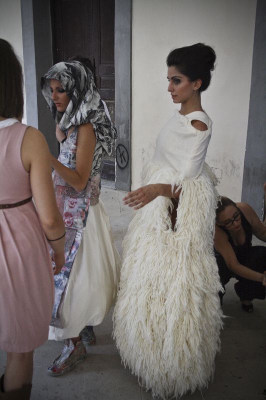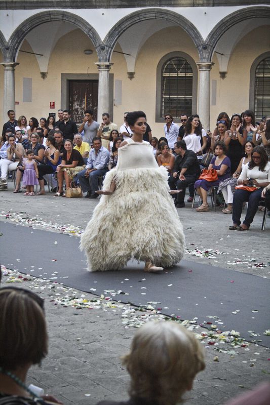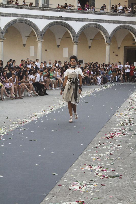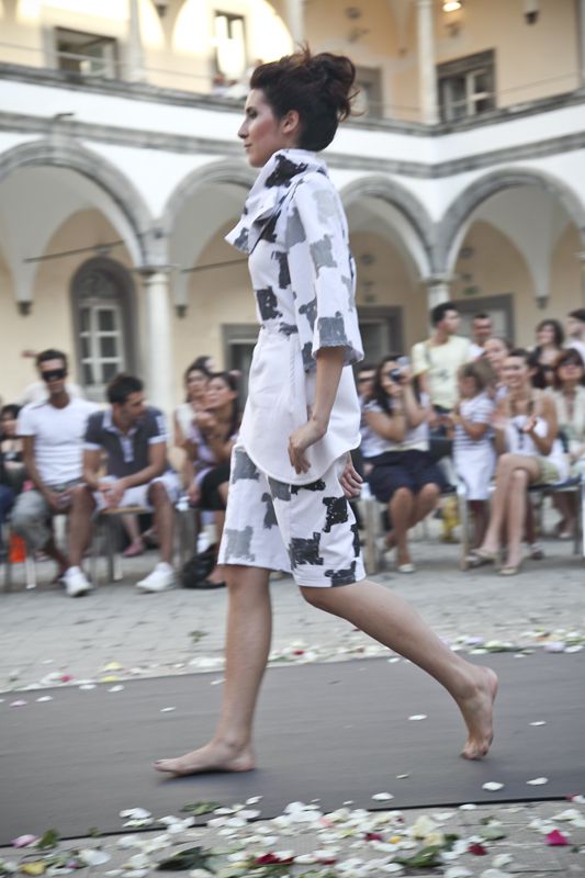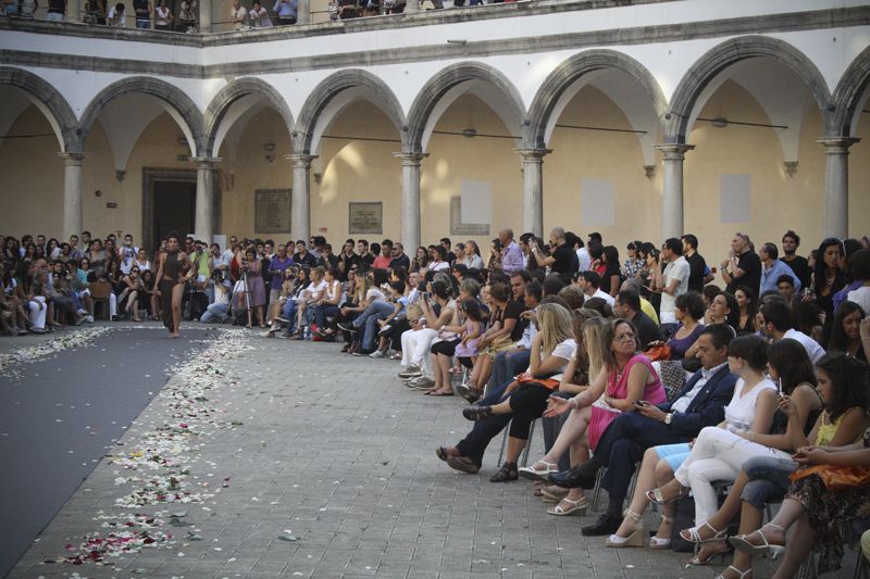 Ogni volta che assisto ad uno spettacolo, sia esso un film, una rappresentazione teatrale, una performance circense piuttosto che un concerto, non posso fare a meno di chiedermi quanta preparazione abbia richiesto fino all’istante immediatamente precedente all’accensione delle luci ed alla partenza della musica. C’è sempre un punto perfettamente definito nello spazio e nel tempo che segna la fine del “prima”, del backstage, e l’inizio dell’ “ora”, dello spettacolo, appunto. Questi sono stati i miei primi pensieri quando sono arrivata all’abbazia di San Lorenzo ad Septimum, laddove il chiostro della facoltà di architettura brillava di una luce completamente nuova: merito della passerella contornata dai petali di rosa, punto focale di quella che sarebbe stata una serata all’insegna della passione per la moda e del gusto per la ricerca e la sperimentazione. Una sfilata organizzata da un gruppo di studenti (Rocco Adriano Galluccio,Daniela Gallo,Mariano De Ninno,Francesca Donnarumma,Raffaele Marone,Paola Pirozzi,Giuseppe Moretta e altri...) coordinati dai professori Ranzo, Sbordone e Liberti che, per la scenografia, la musica (mixata da Raffaele Marone), le acconciature (curate da Gennaro Diana), il make up, i modelli (studenti e studentesse della facoltà) e, ovviamente, per le collezioni, non ha avuto molto da invidiare ai grandi happenings internazionali che scandiscono il ritmo frenetico dell’industria del fashion. Dopo le prime uscite a cura degli studenti del primo e secondo anno, dedicate rispettivamente alle variazioni cromatiche in bianco e nero ed al tema “Russian Avangard” , la passerella è stata calcata da modelli che indossano aggregazioni materiche sperimentali, molte delle quali realizzate attraverso il riciclo di materiali di scarto come il cellophane. Ed è così che hanno sfilato abiti come soffioni, mamuthones, samurai, armature, intrecci di tela, fili di seta, damaschi, rocchetti di cotone, juta, rame e, addirittura, una lana impermeabile. Un’emozione durata due ore, amplificata dalle falcate dei modelli/studenti ed esplosa nel lungo applauso che ha chiuso lo spettacolo. Da parte di tutto lo staff di Naplestreetstyle, i più sentiti complimenti a questi giovani designer e ai loro professori e tanti auguri per un futuro pieno di successo, che possano portare la nostra cultura e la nostra terra sulle più importanti passerelle del mondo.