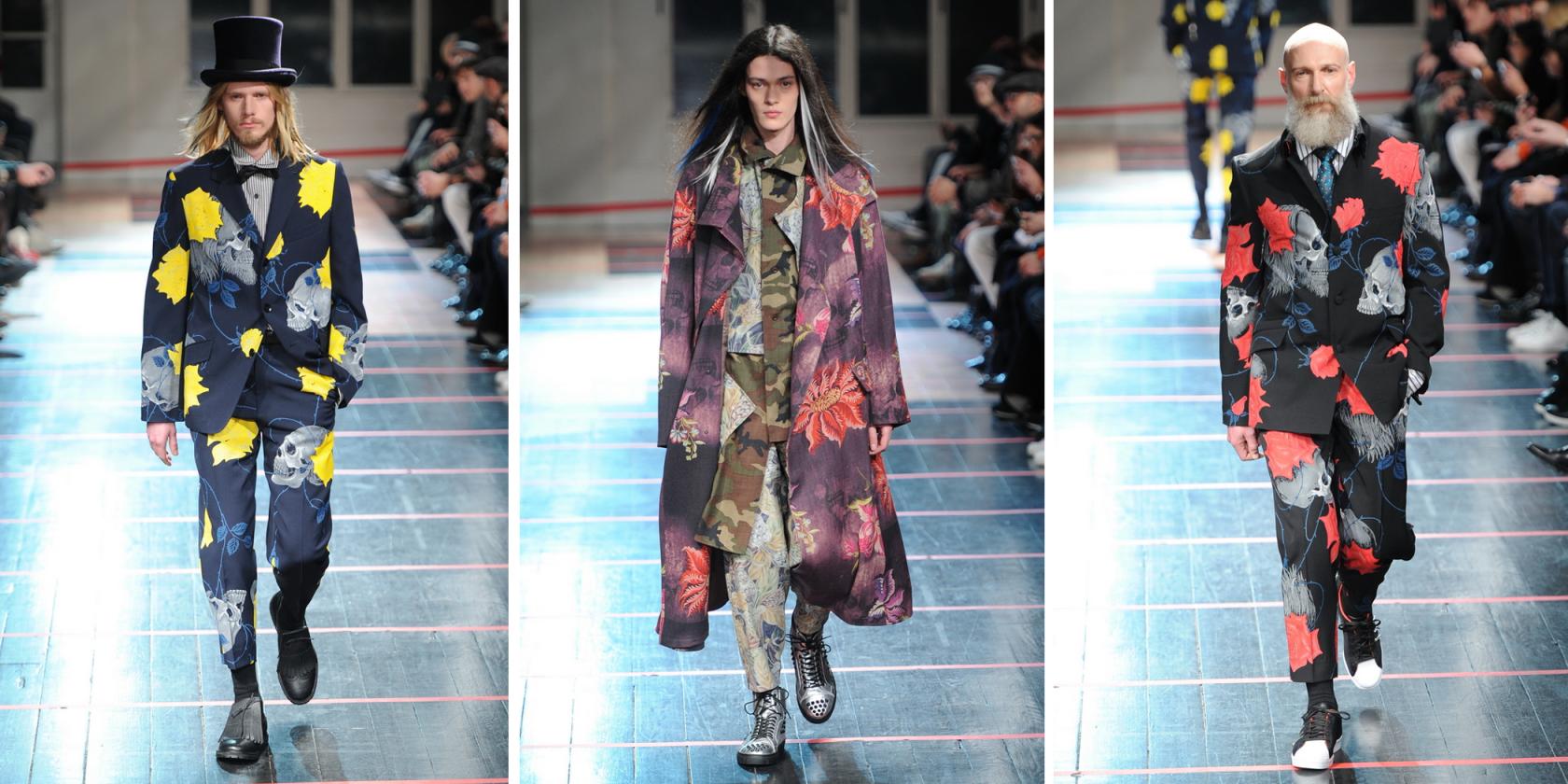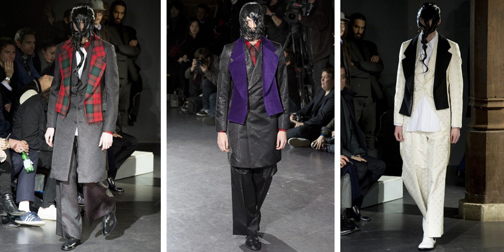 Tagli, sovrapposizioni e interposizioni: tessuti dilaniati e ricomposti, rouches creponne e influenze romantiche per l'uomo Comme des Garcons. I tocchi "rough" delle maglie si alternano alla lucentezza impeccabile dei capispalla, di cui protagonista indiscusso è il rever. Destrutturato e ricomposto, delicatamente appoggiato sulle spalle, un tromp l'oeil riuscitissimo.