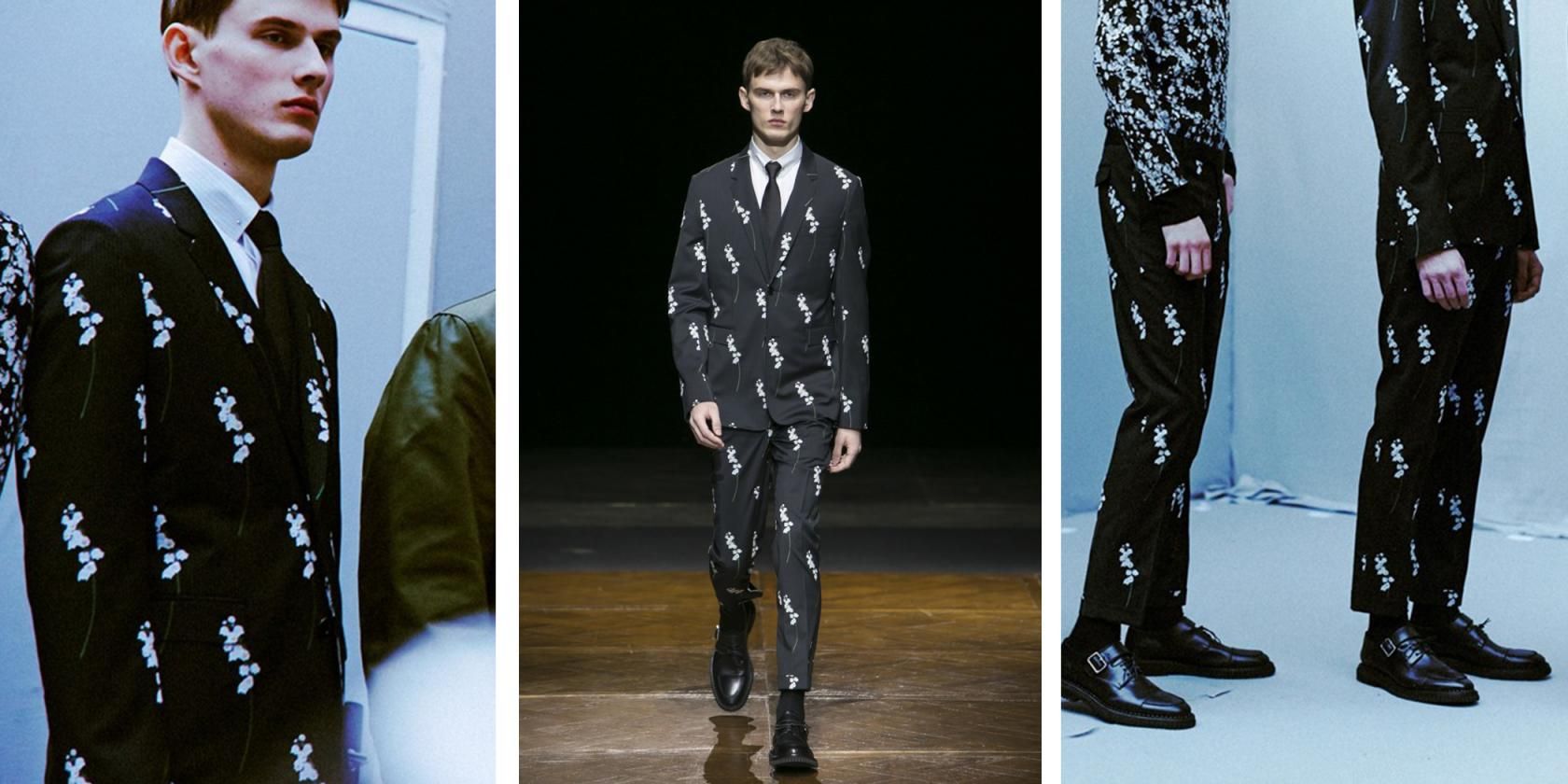 Il fiore preferito di Monsieur Dior, appuntato ai severi completi gessati, brilla prezioso e solenne come una medaglia alla classe e allo charme o punteggia pantaloni e giacche in stampe all over: una danza che anticipa la primavera.