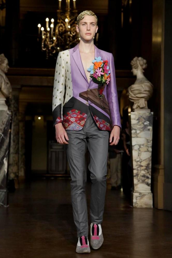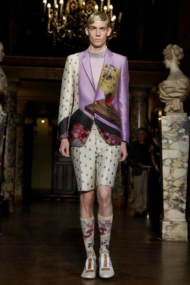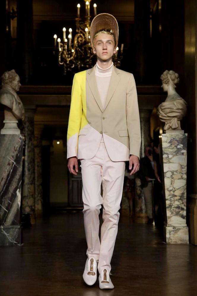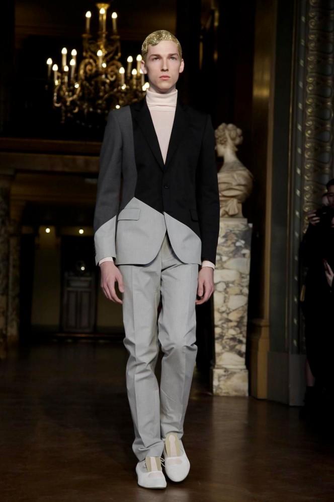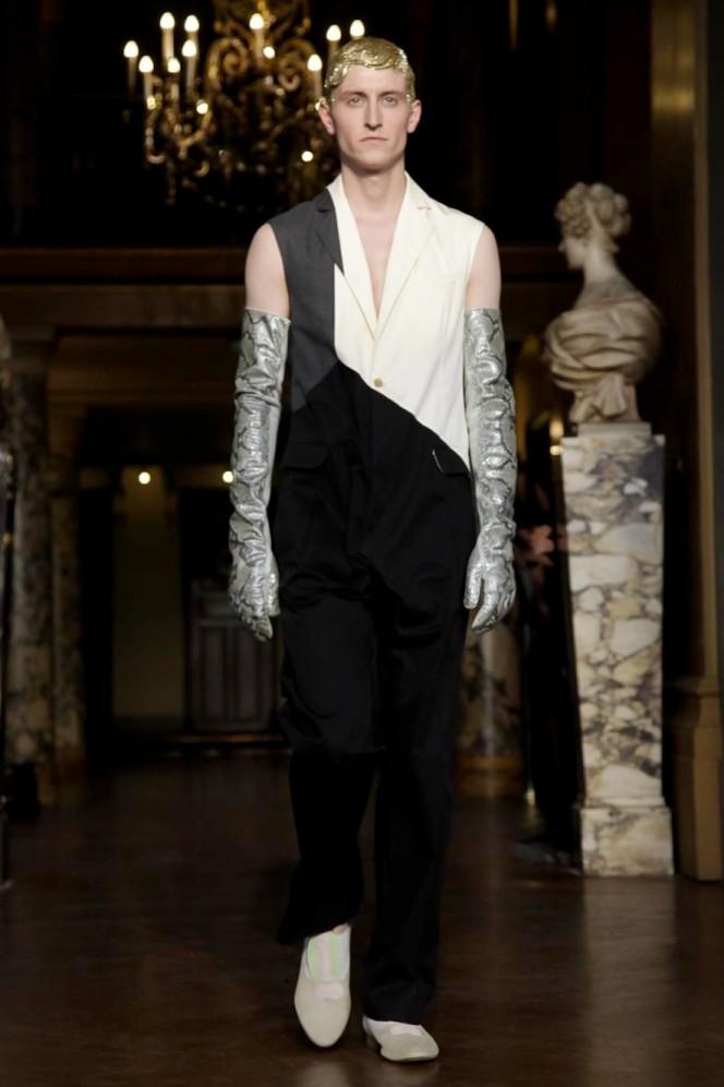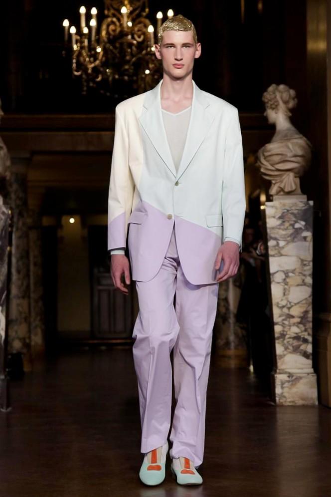 La collezione è un caleidoscopio di colorati completi maschili di seta, con silhouettes allungate, stampe geometriche e dettagli tagliati ad effetto pop up. Il designer belga possiede un approccio fresco alla sartorialità, la sua è una nuova eleganza composta da dettagli surreali come i guanti di pitone, i calzini con i cartoons o le scarpe con in genitali.