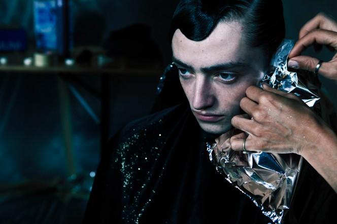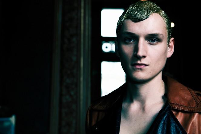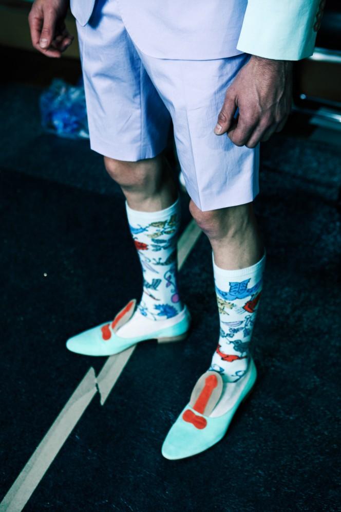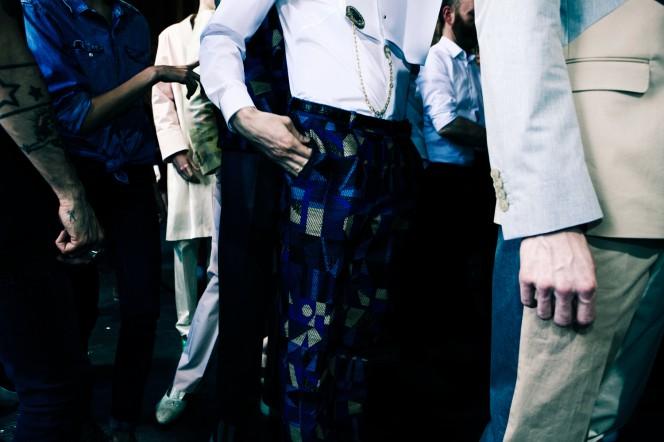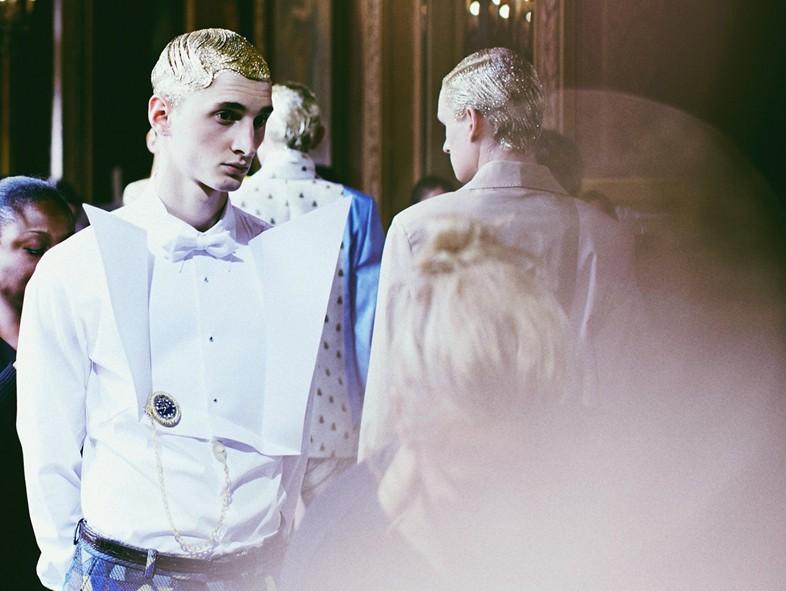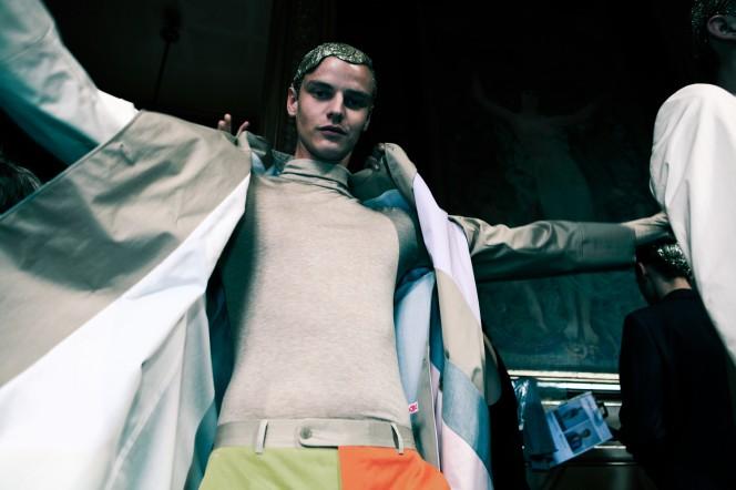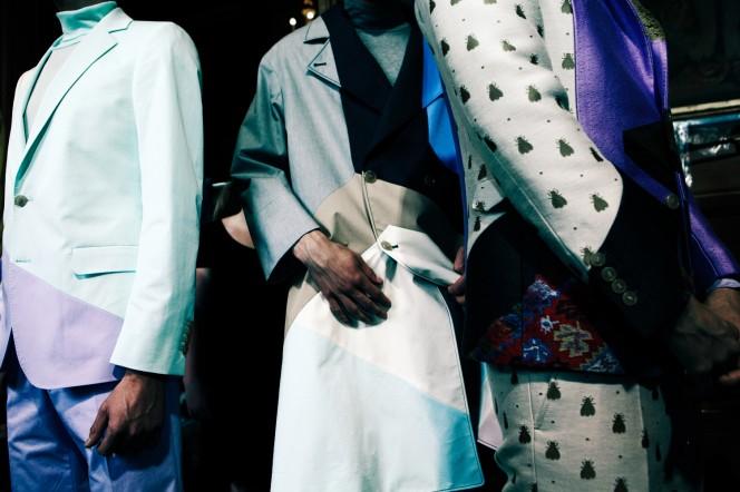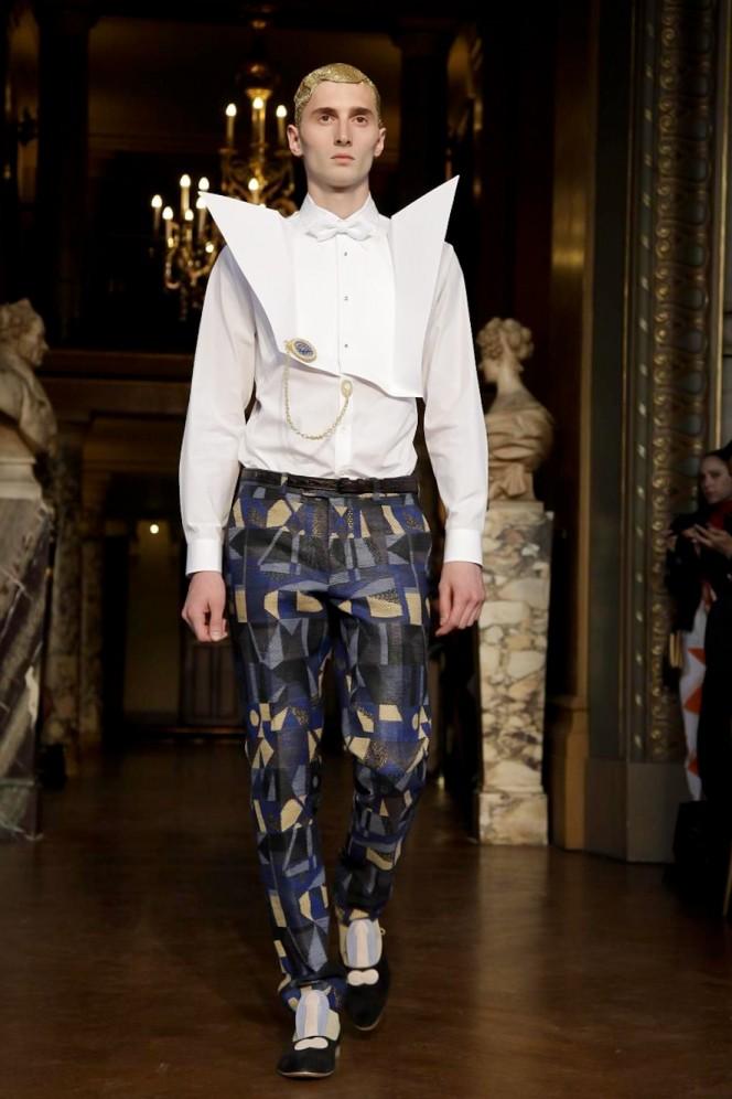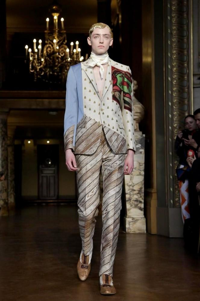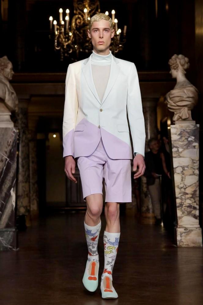 La collezione è un caleidoscopio di colorati completi maschili di seta, con silhouettes allungate, stampe geometriche e dettagli tagliati ad effetto pop up. Il designer belga possiede un approccio fresco alla sartorialità, la sua è una nuova eleganza composta da dettagli surreali come i guanti di pitone, i calzini con i cartoons o le scarpe con in genitali.